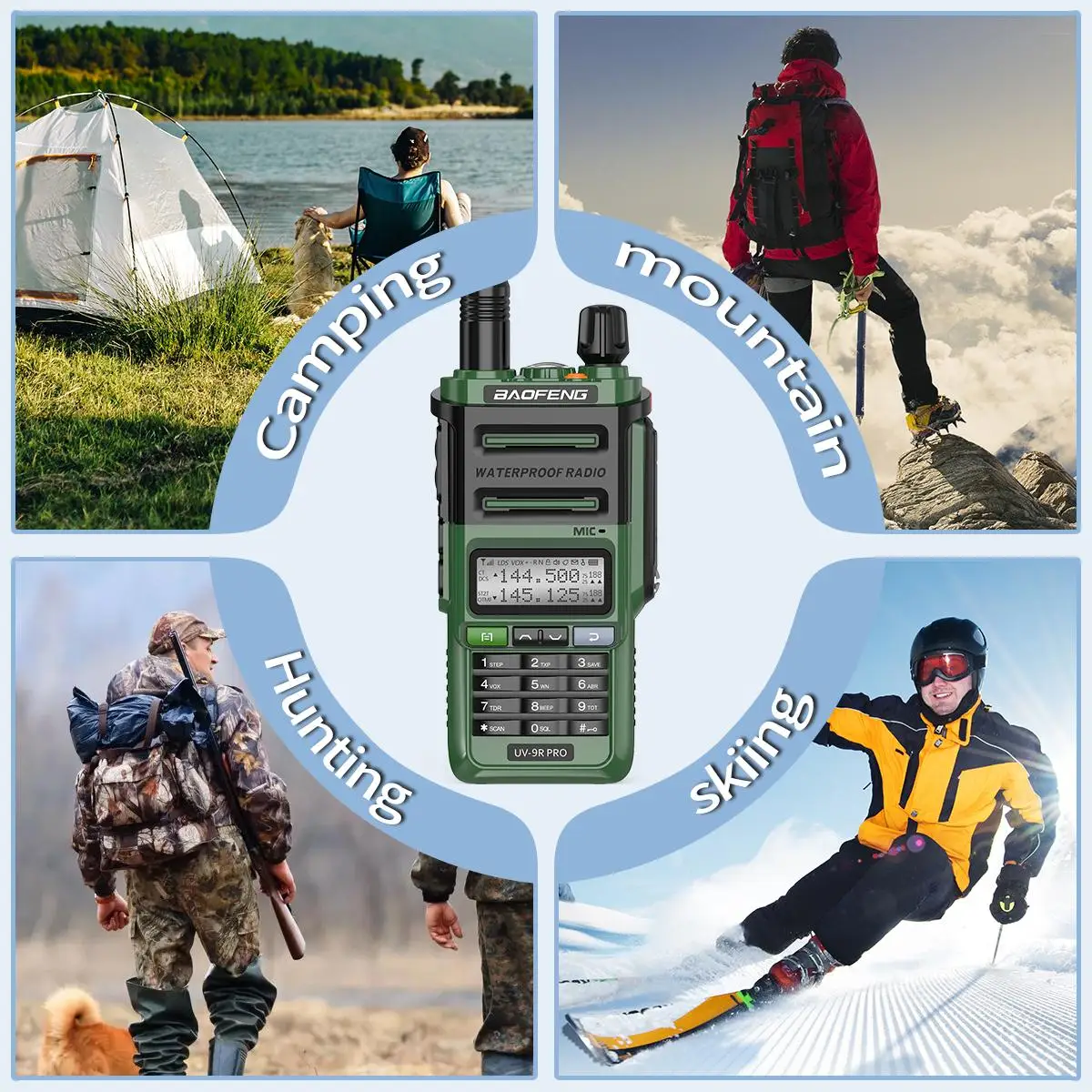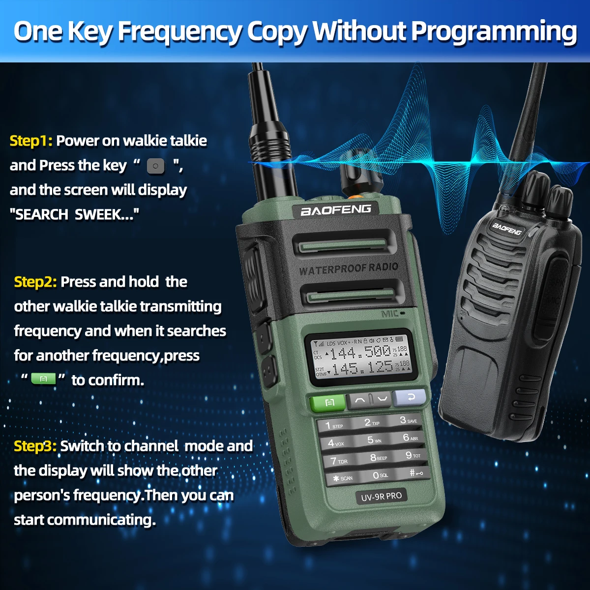 Press the SK1 to enter the“SEARCH”interface. Then press the PPT button on another walkie talkie,The UV-9R PRO will search for another radio transmission frequency and privacy code. Finally press the menu to store the frequency. Two walkie-talkies can communicate normally. Communication is unobstructed, and traditional writing frequency is rejected.