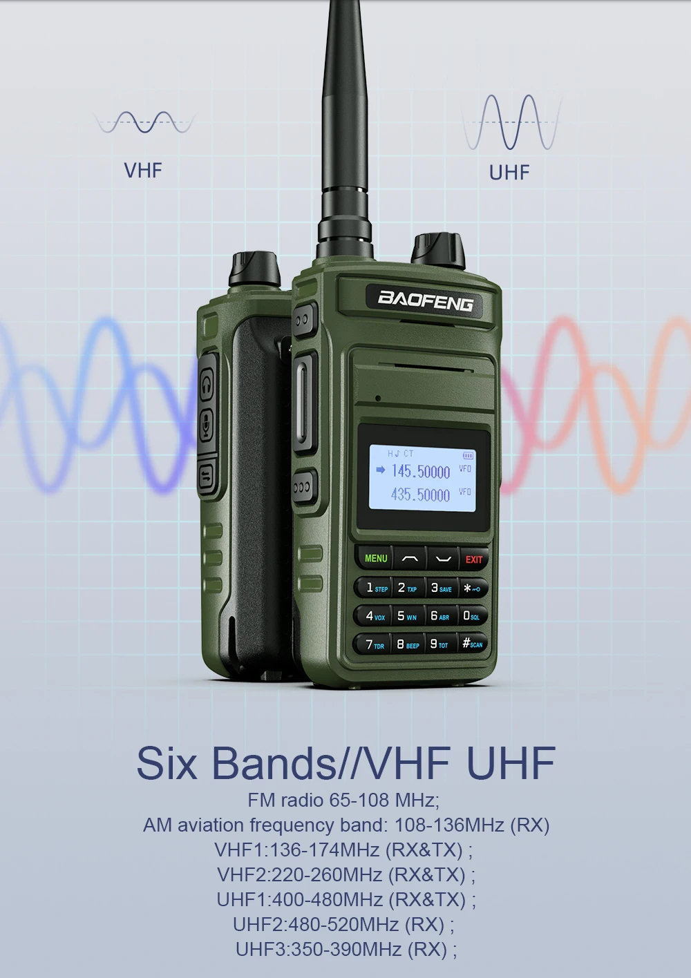 VHF1:136-174MHz (RX&TX) ; VHF2:220-260MHz (RX&TX) ;