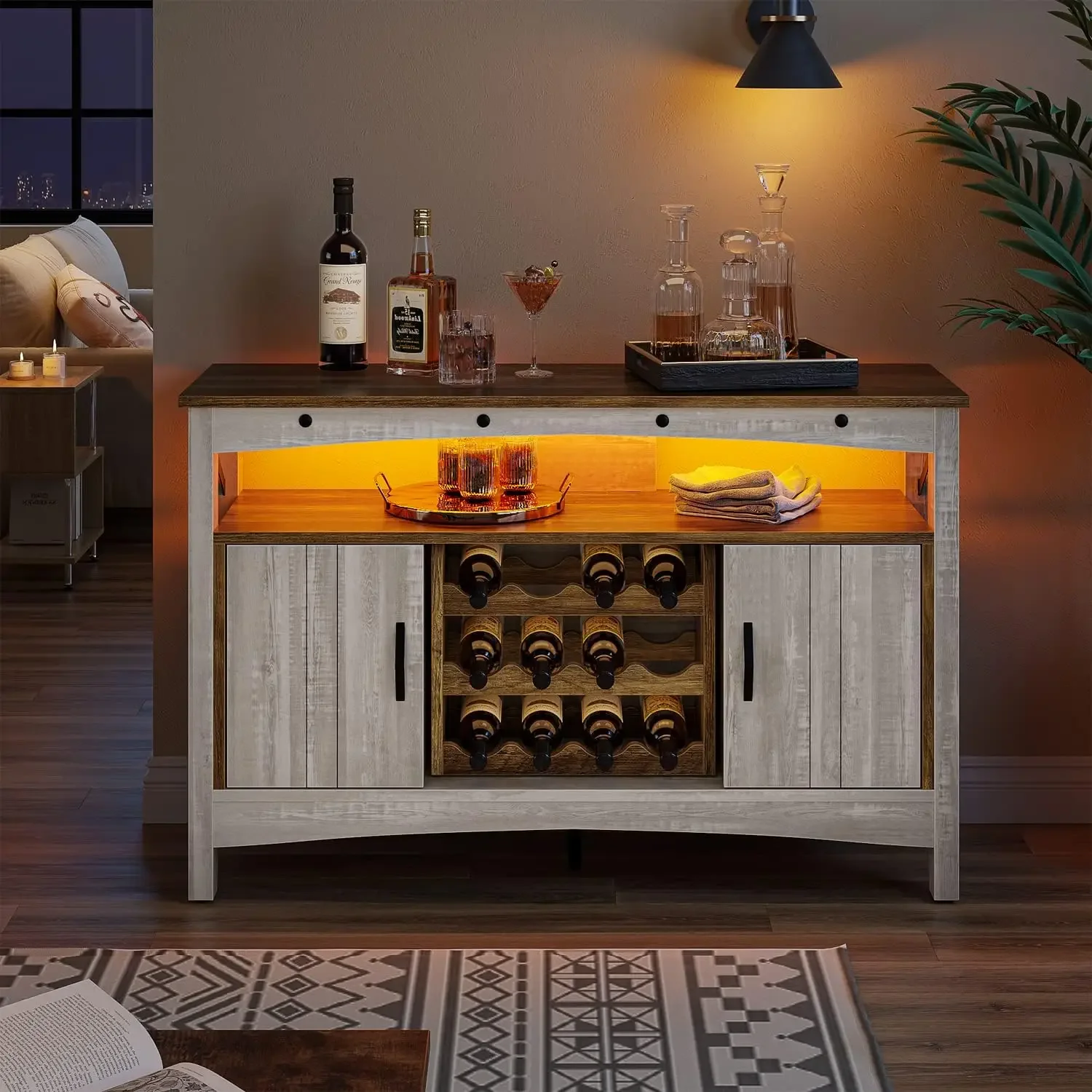 Bar Cabinet, Farmhouse Coffee Bar Sideboard with LED Lights, Industrial Sideboard Buffet Cabinet with Storage, Rustic Brown