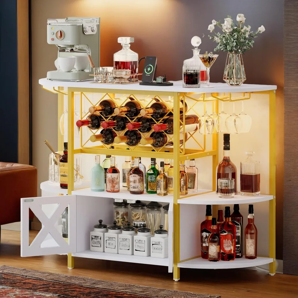 Bar Cabinet with LED Lights, Home Bar with Power Outlets, Wine Cabinet Bar Table with 4 Tier Storage Shelves, 2 Doors
