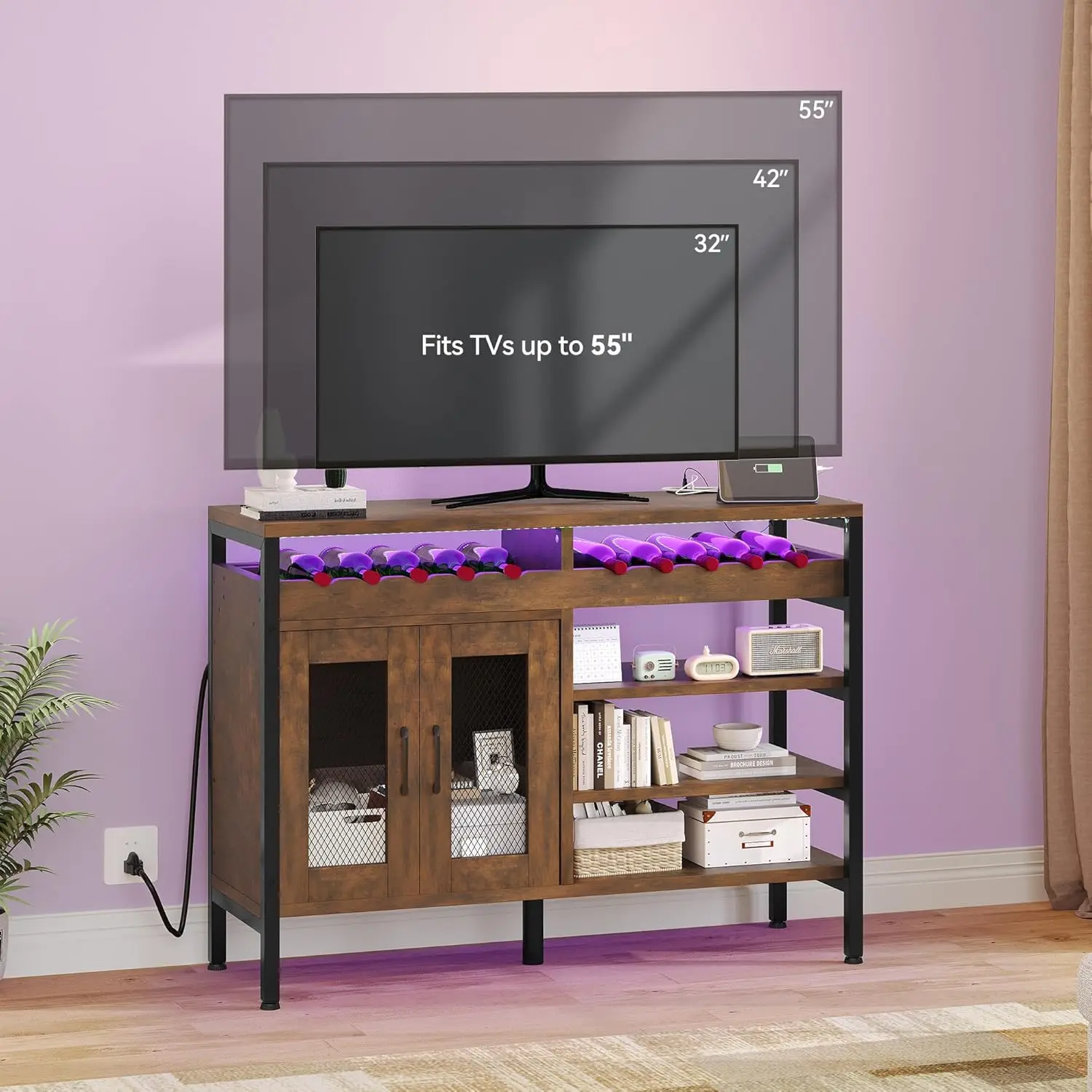 - LED Wine Cabinet: An adjustable LED light strip featuring 7 different colors and 8 modes is featured on this industrial liquor cabinet; RGB lighting elevates the atmosphere of your home bar