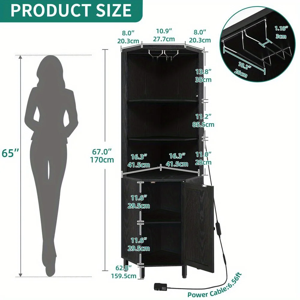 Corner bar cabinet: with 2 rows wine glass racks, you can hang your wine glasses to keep them neatly organized and easily accessible, while avoiding accidental collisions. At the bottom of the corner liquor bar is a double tier storage cabinet,The middle shelf can be removed or adjustable position for storing items of different heights