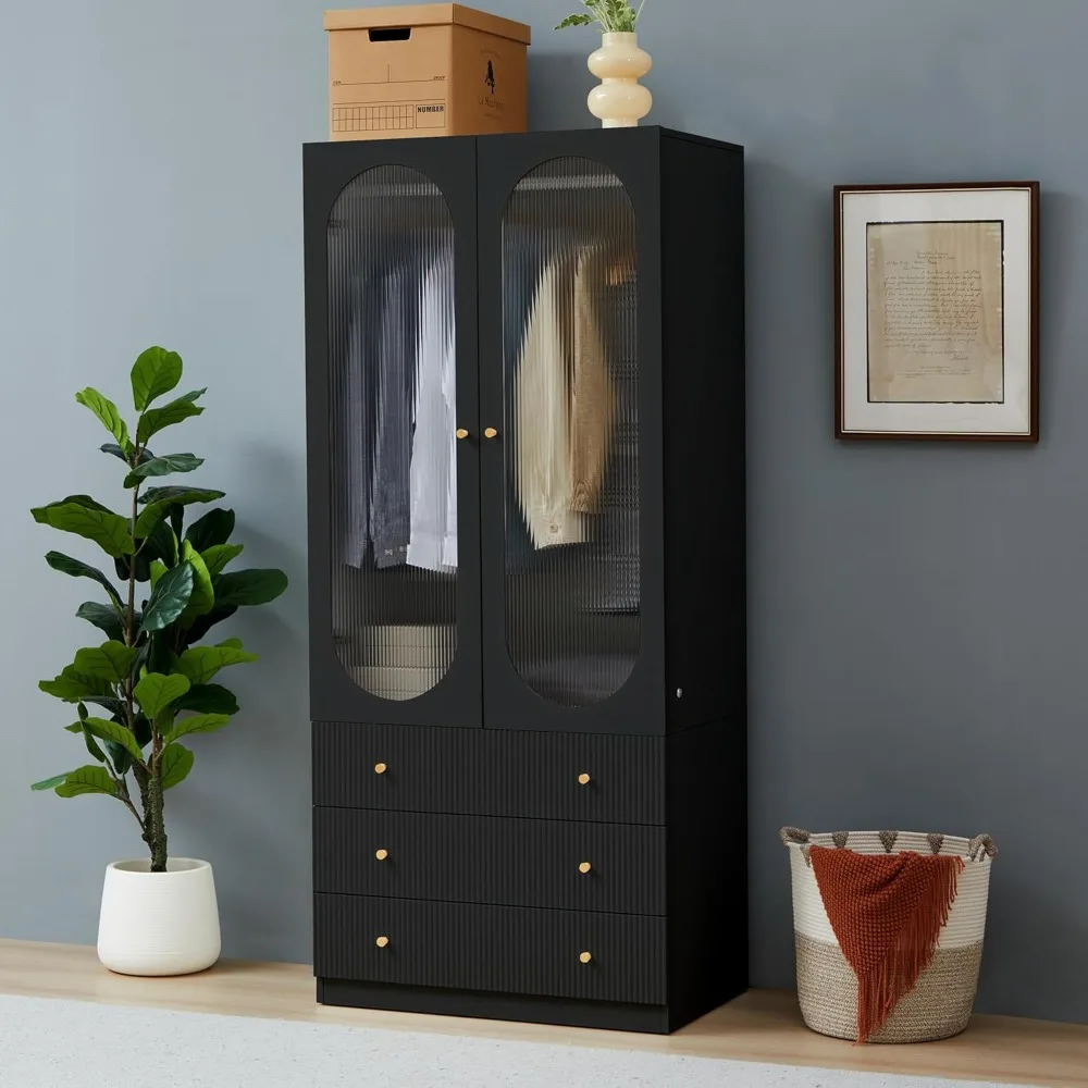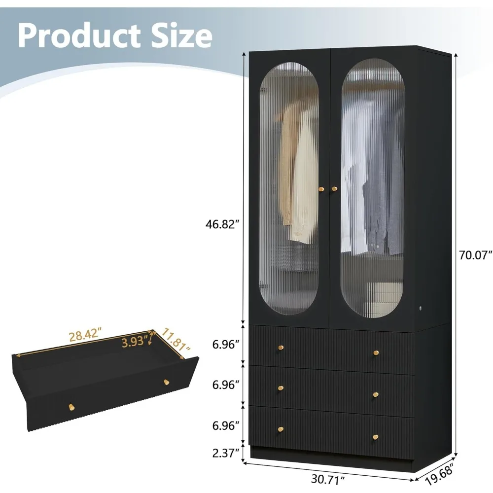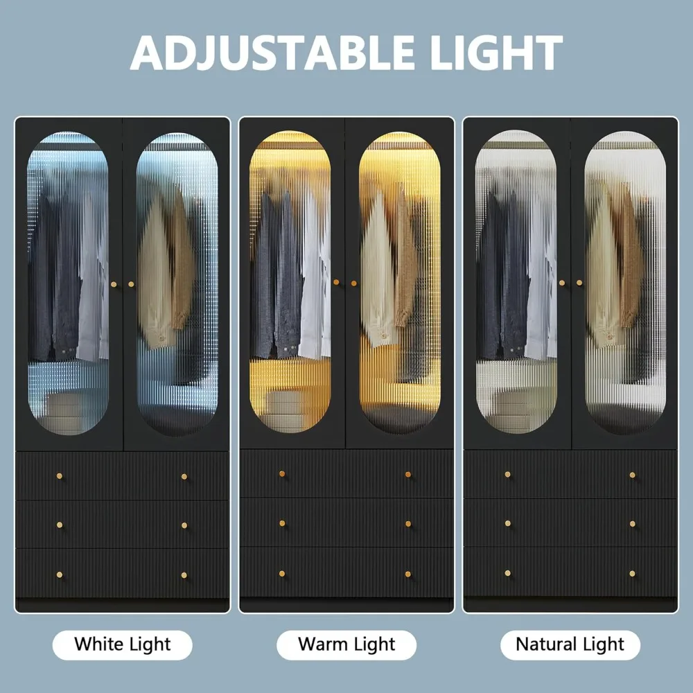 - 【 Product Features 】 This wardrobe cabinet is equipped with 3 colors of LED lights and glass doors, so even in pitch black, you can easily find the clothes and items you want. It is also equipped with 3 fluted drawers, which are not only stylish and beautiful, but also convenient for organizing clothes, socks, toys or other items in the room