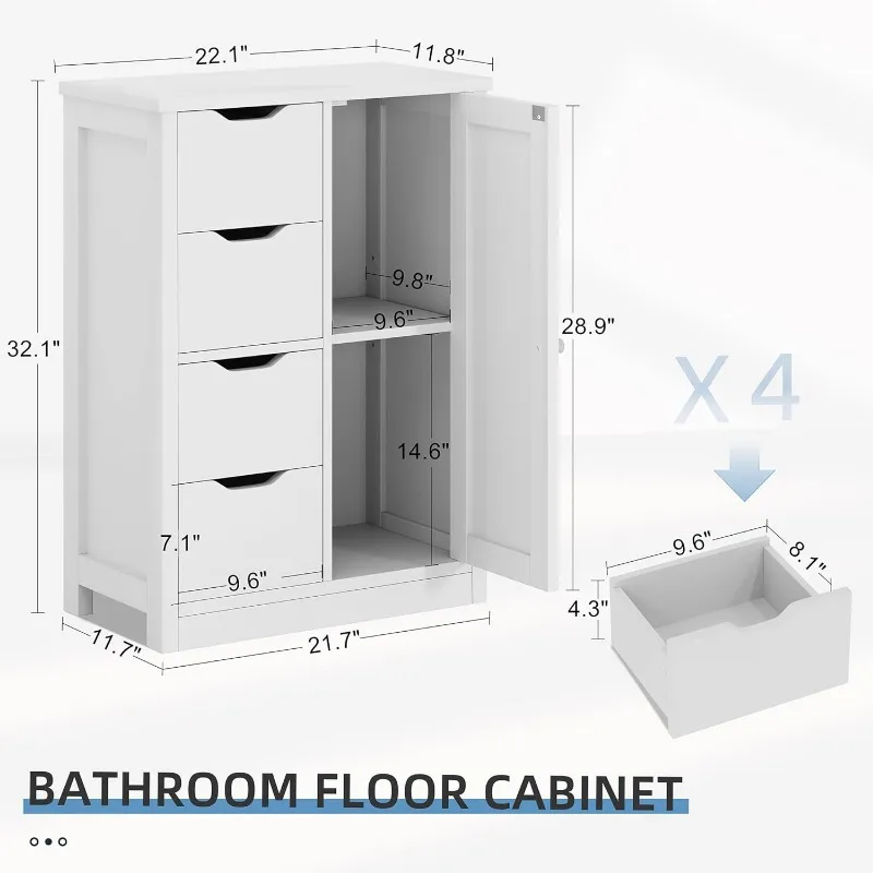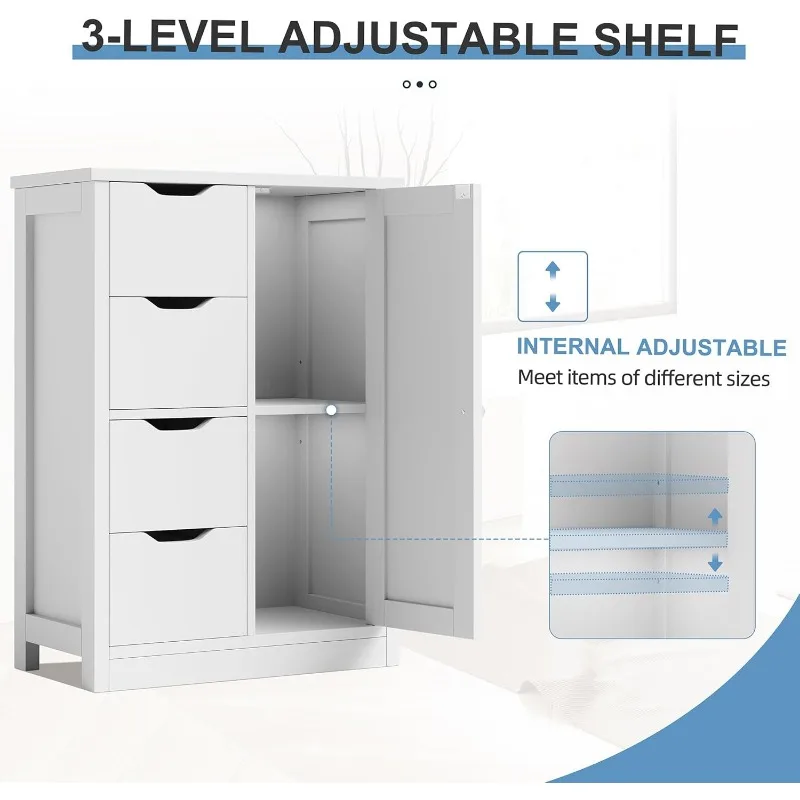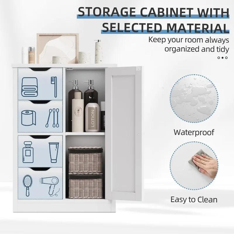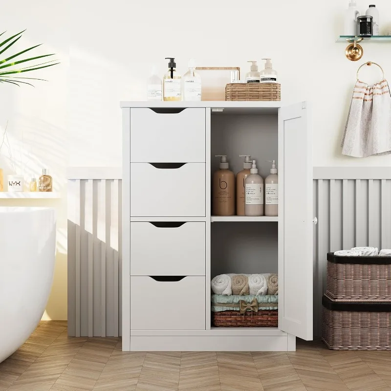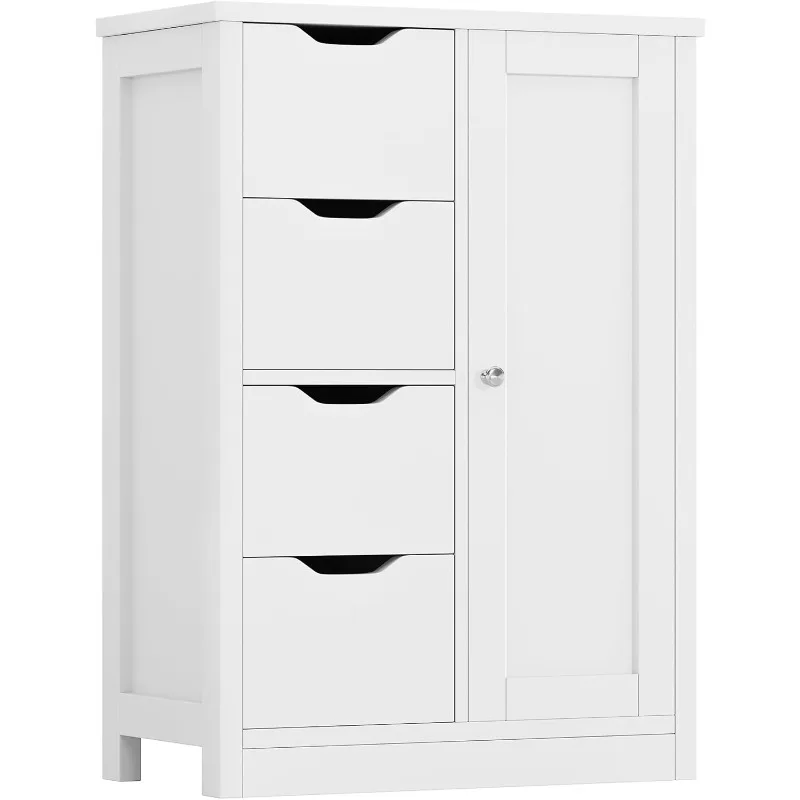 Bathroom Floor Storage Cabinet, Wooden Storage Organizer with 4 Drawers and 1 Cupboard, Freestanding Bathroom Furniture,