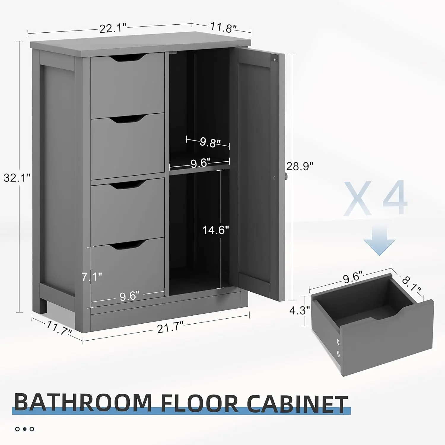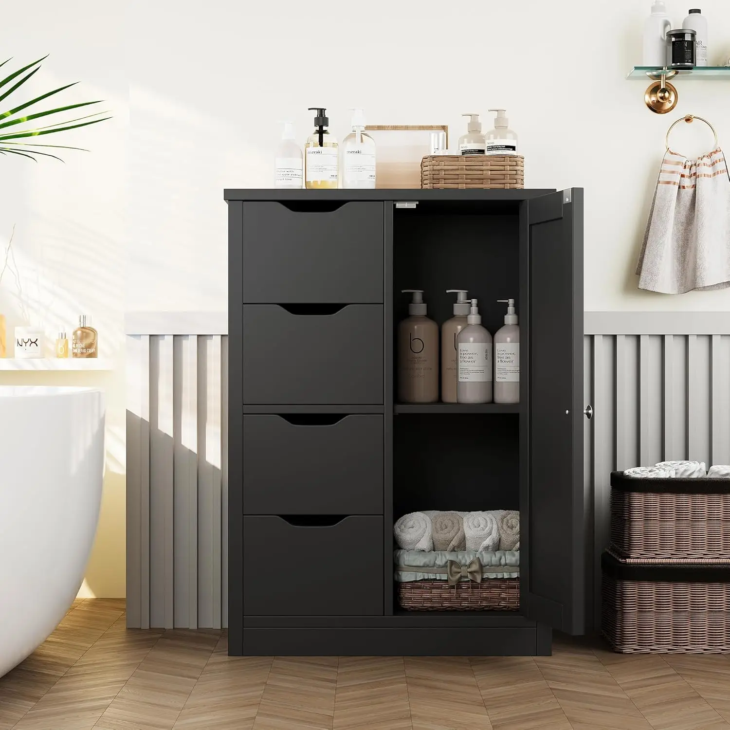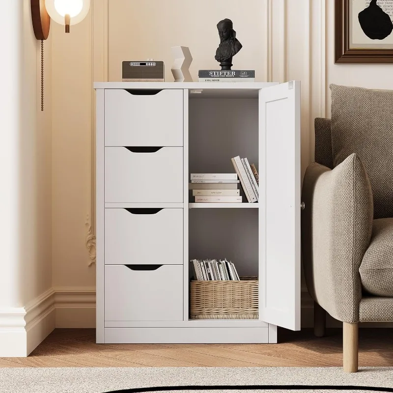 Bathroom Floor Storage Cabinet, Wooden Storage Organizer with 4 Drawers and 1 Cupboard, Freestanding Bathroom Furniture,