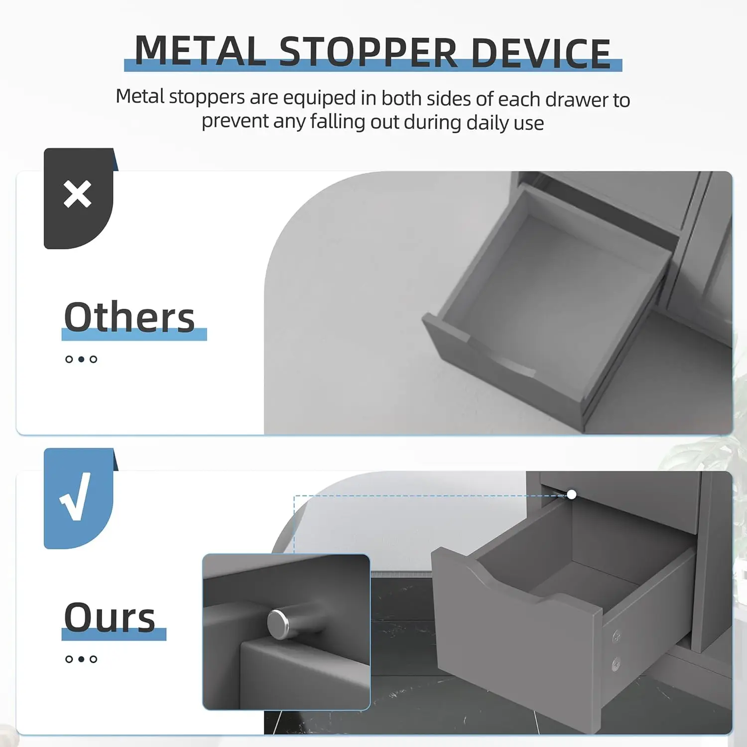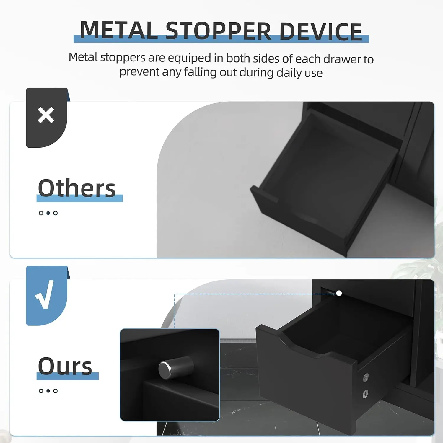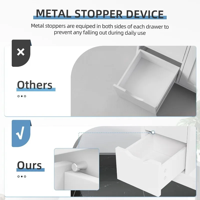 - Thoughtful Details: Each drawer is equiped with 2 metal stopper on the two sides to prevent any falling of the drawer. Also the shelf can be adjusted into 3 height to fit your variant storage needs
