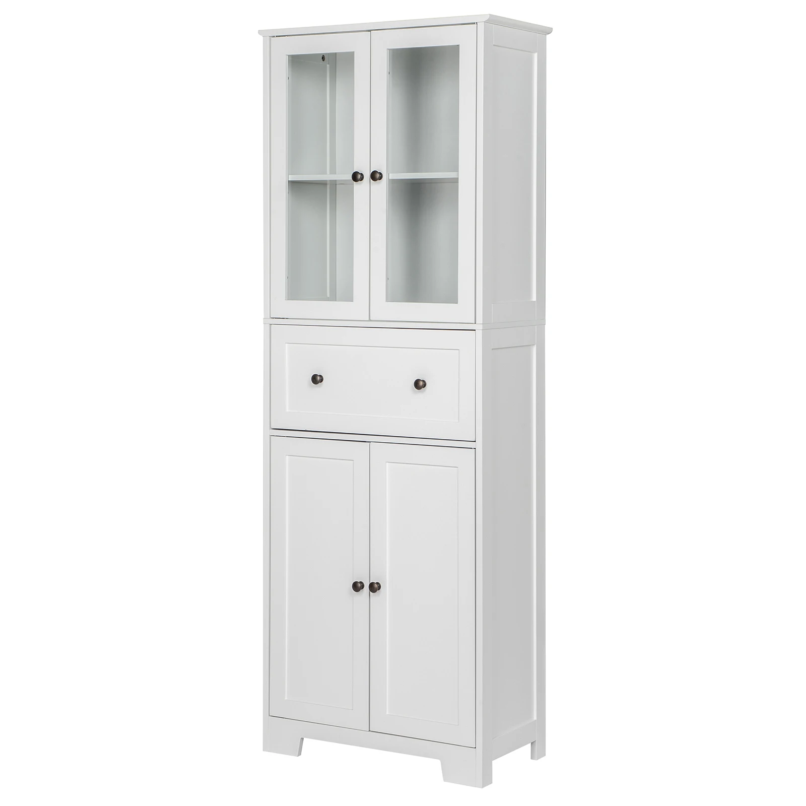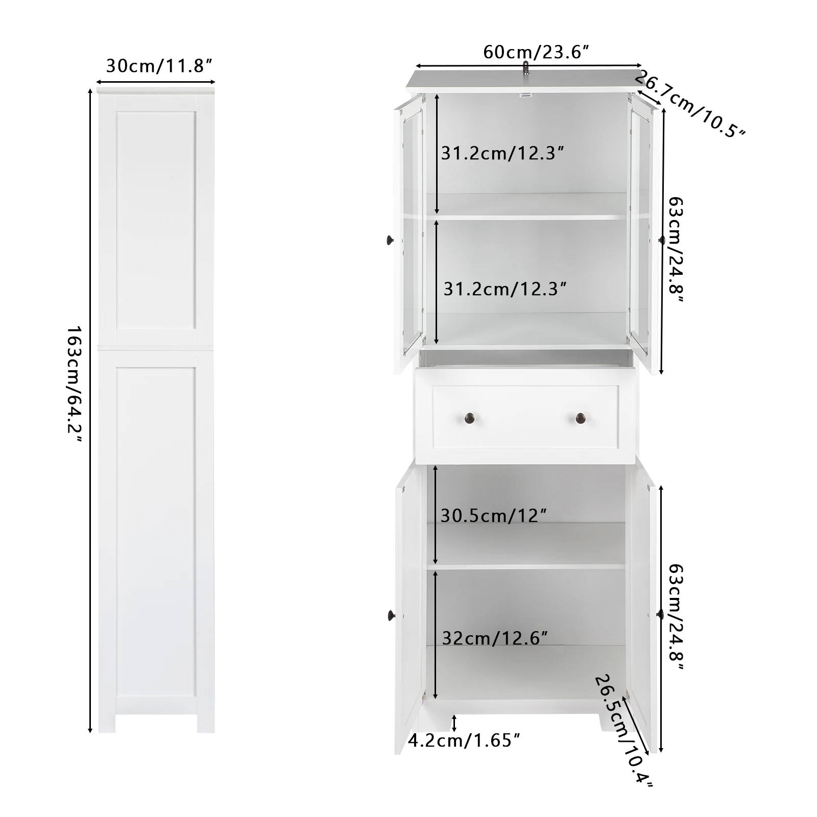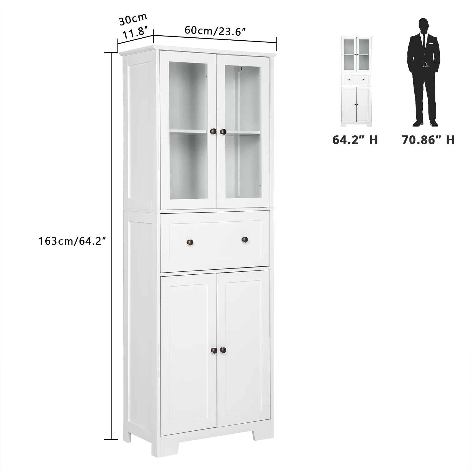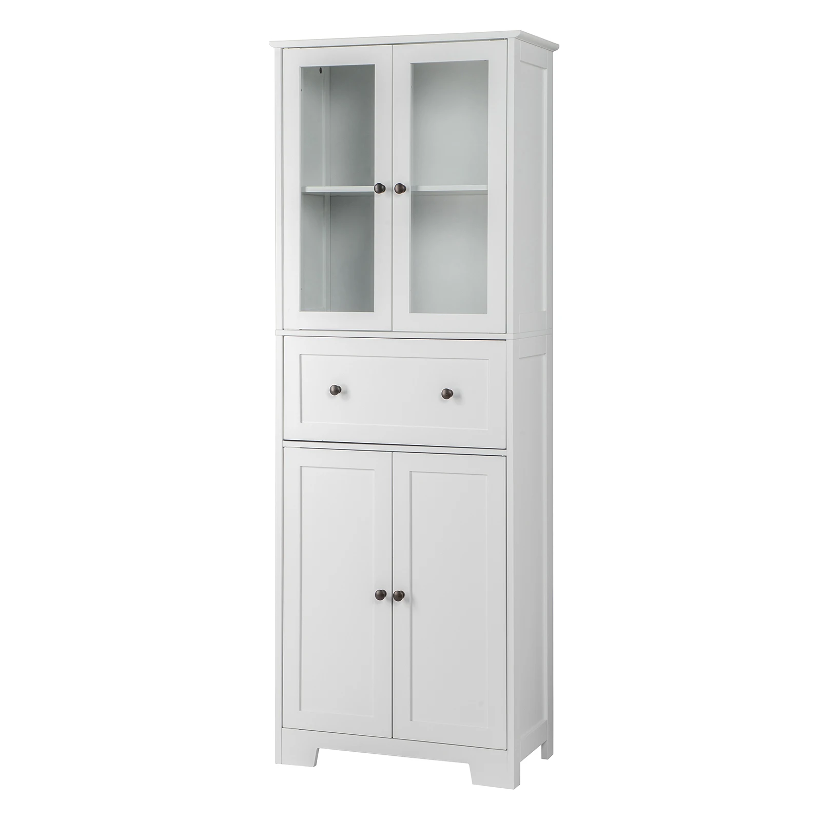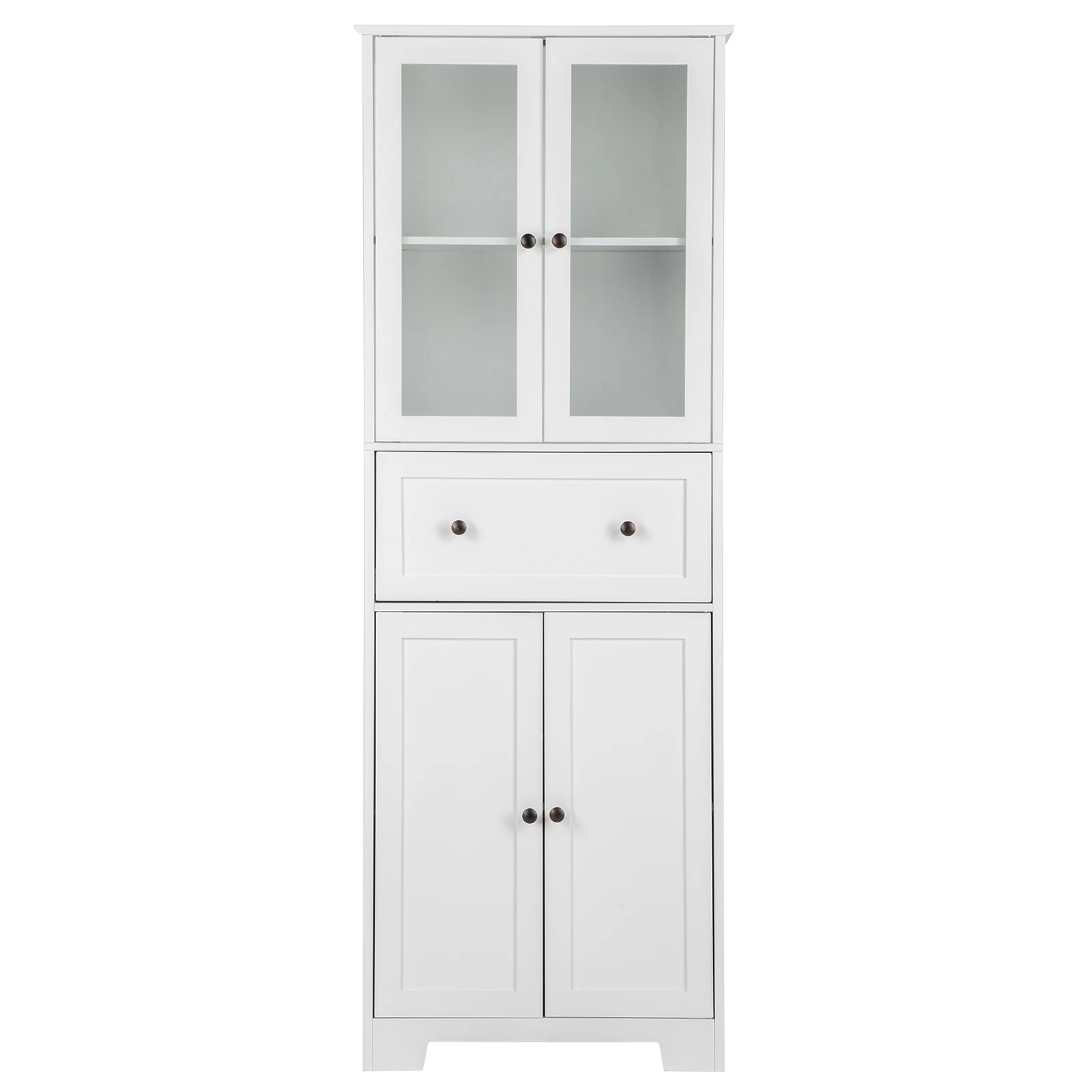 This is a bathroom storage type high cabinet, which is made of high-density panels, high-quality black metal handles, and high-hardness installation accessories; the structure design of 4 doors and 1 drawer makes the storage space of this cabinet large It can be used in the bathroom as a bathroom cabinet, in the dining room as a sideboard, in the study as a bookcase, in the bedroom as a wardrobe, and in the living room and entrance.