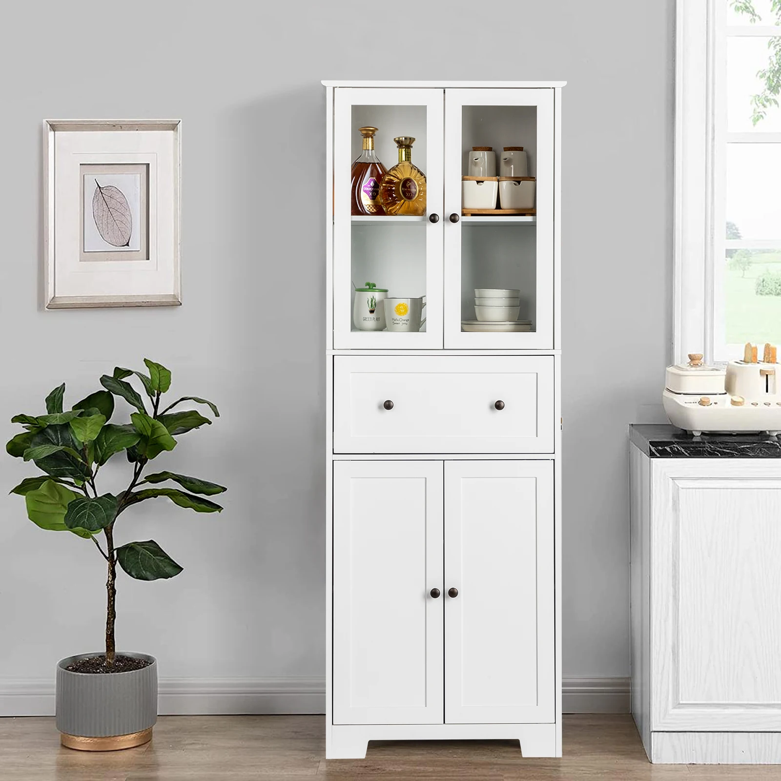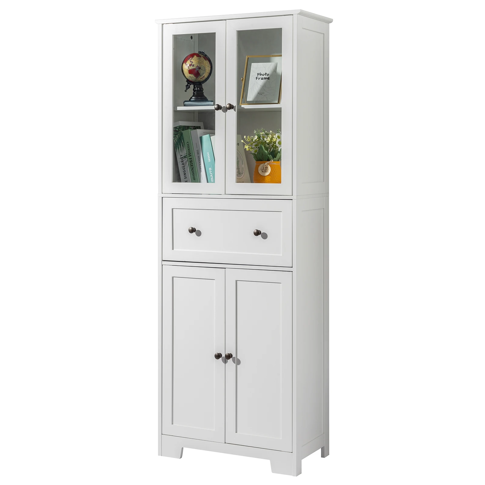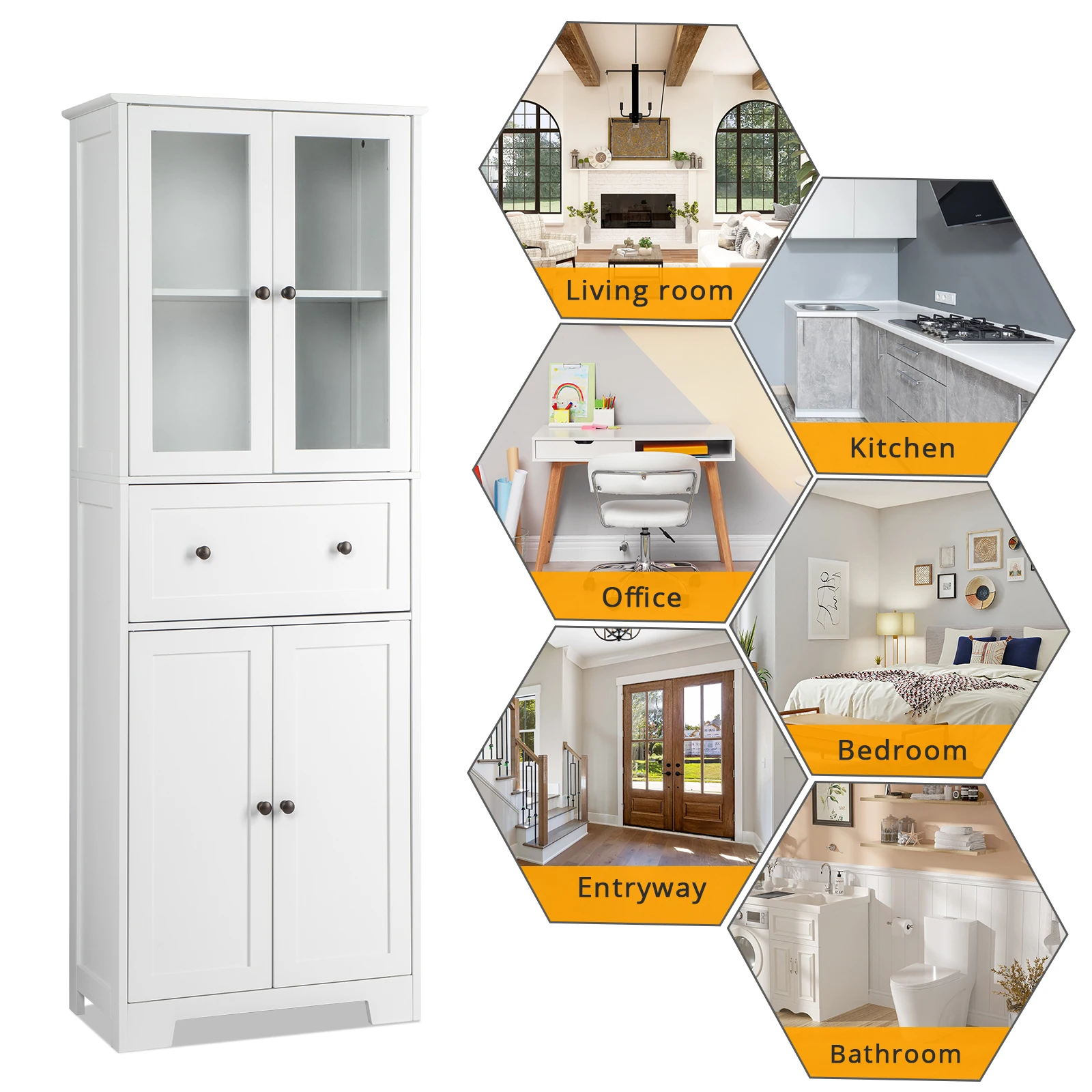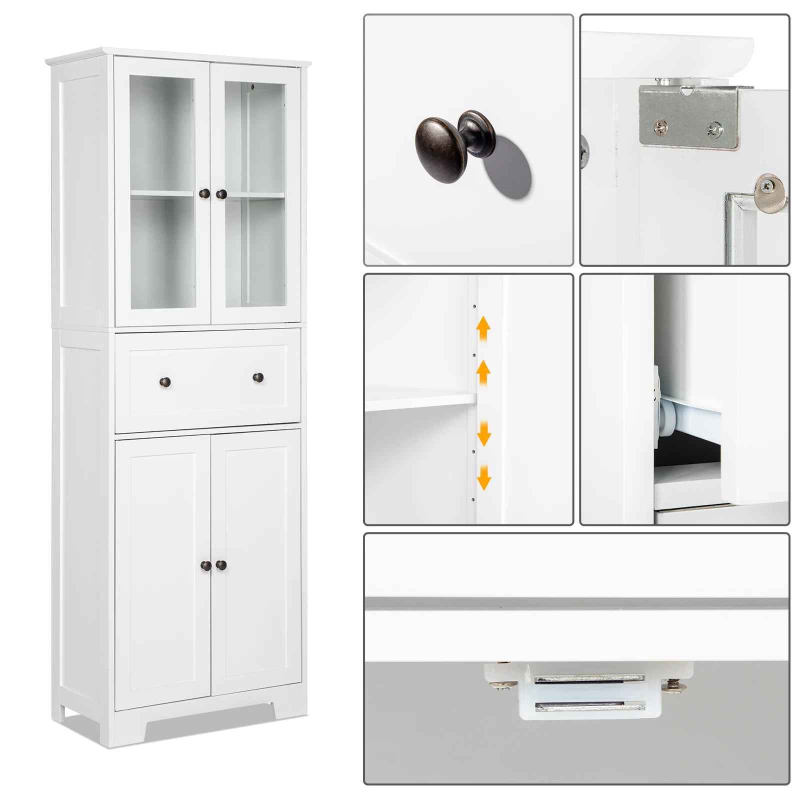 This is a bathroom storage type high cabinet, which is made of high-density panels, high-quality black metal handles, and high-hardness installation accessories; the structure design of 4 doors and 1 drawer makes the storage space of this cabinet large It can be used in the bathroom as a bathroom cabinet, in the dining room as a sideboard, in the study as a bookcase, in the bedroom as a wardrobe, and in the living room and entrance.