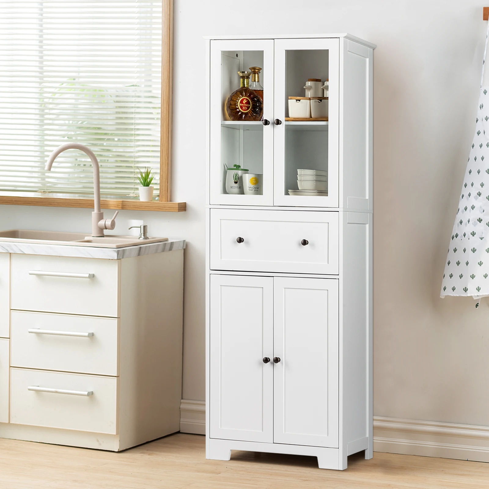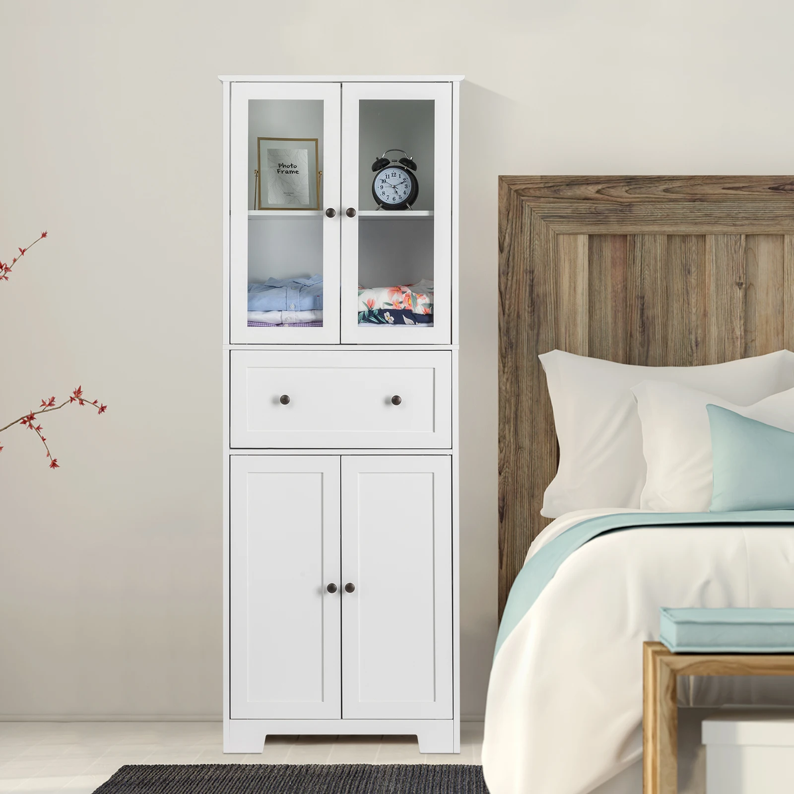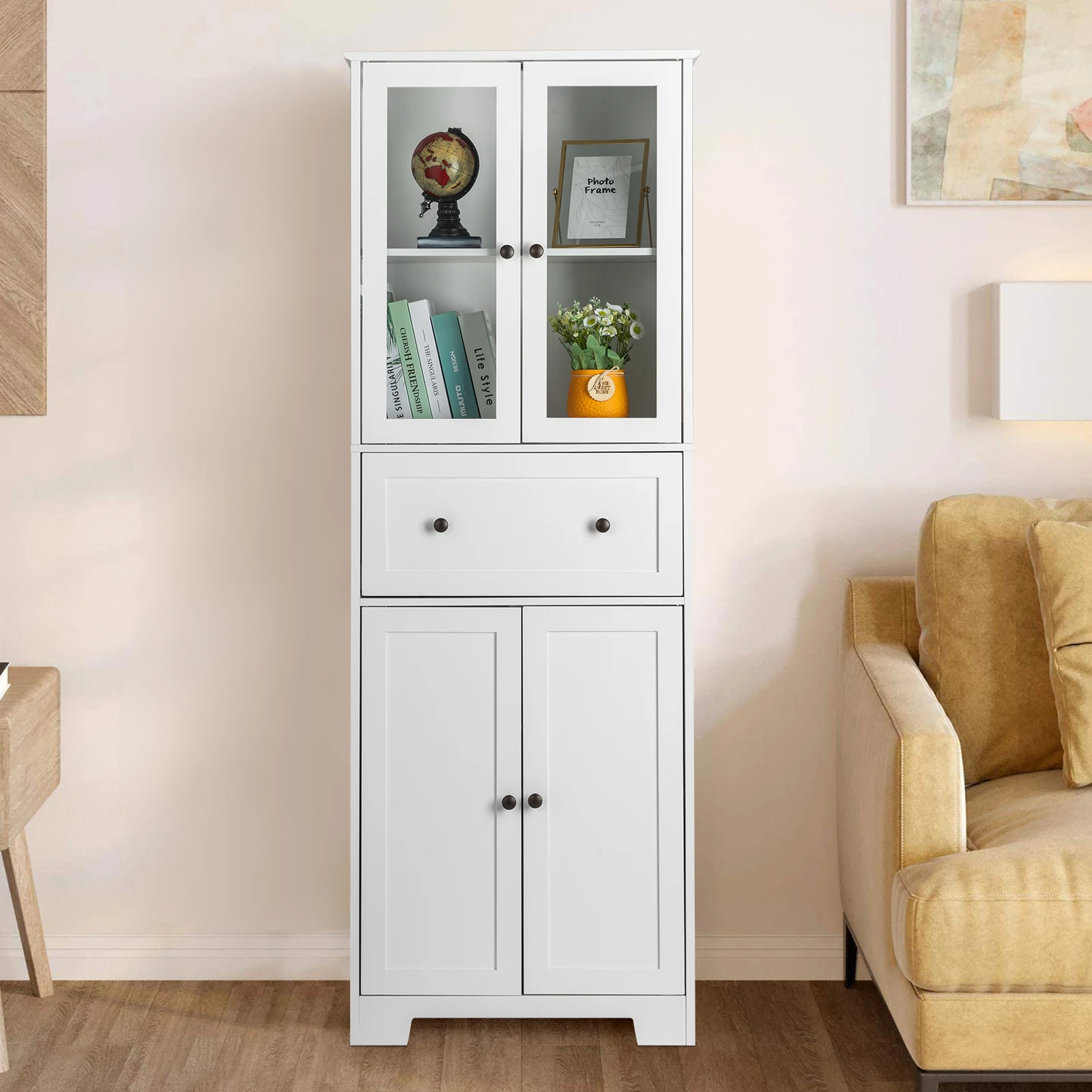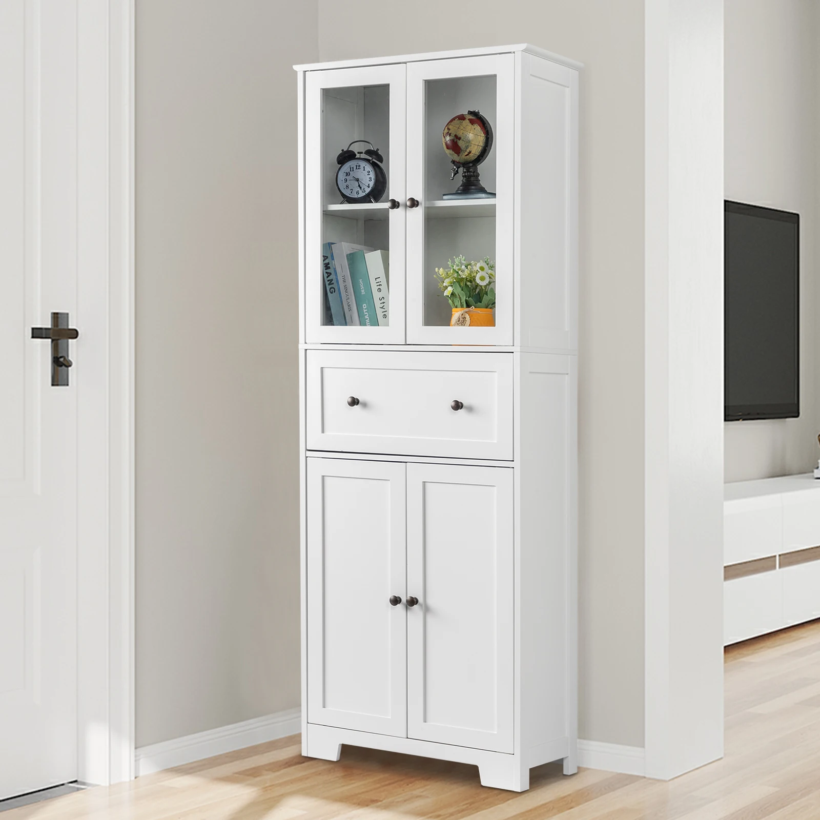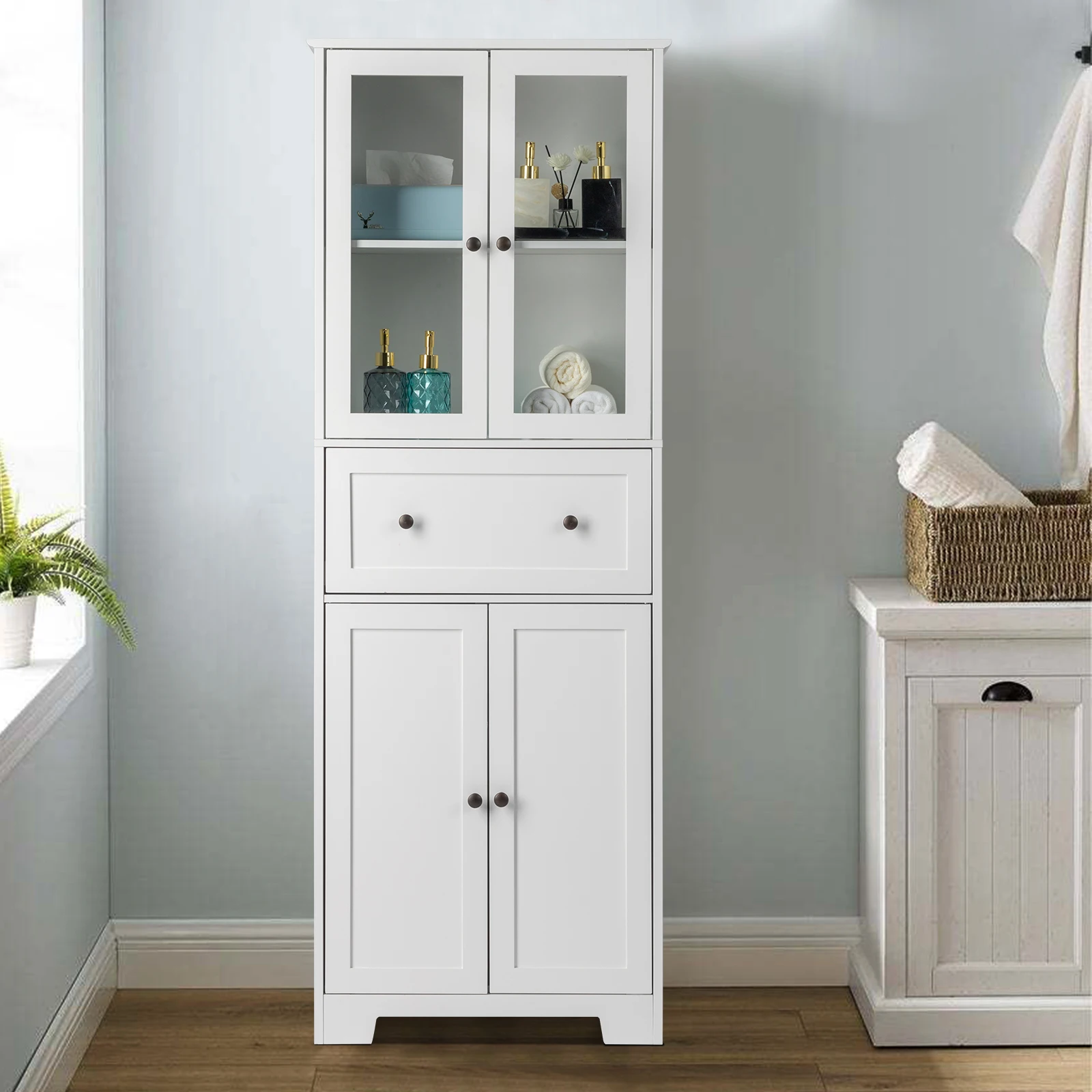 This is a bathroom storage type high cabinet, which is made of high-density panels, high-quality black metal handles, and high-hardness installation accessories; the structure design of 4 doors and 1 drawer makes the storage space of this cabinet large It can be used in the bathroom as a bathroom cabinet, in the dining room as a sideboard, in the study as a bookcase, in the bedroom as a wardrobe, and in the living room and entrance.