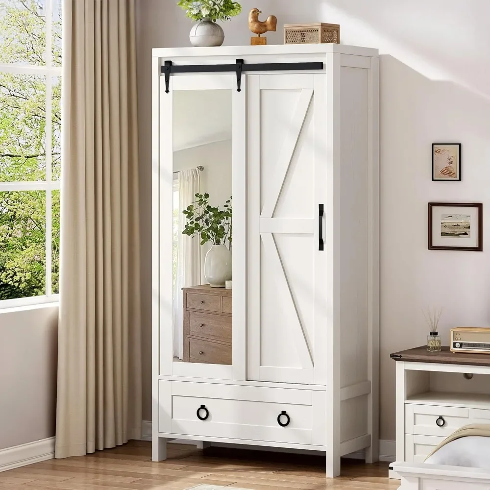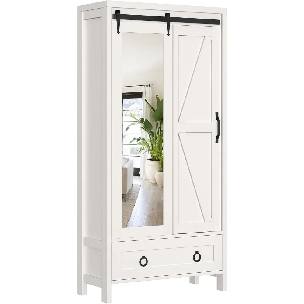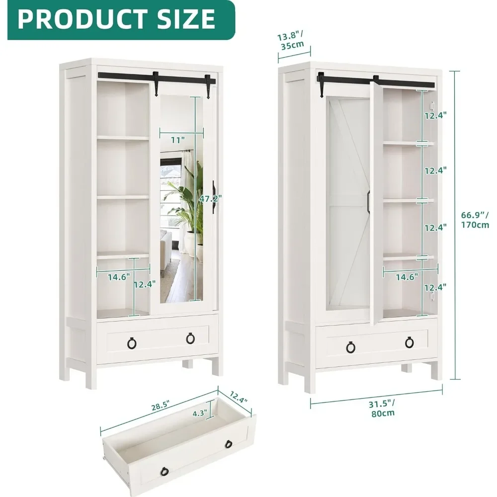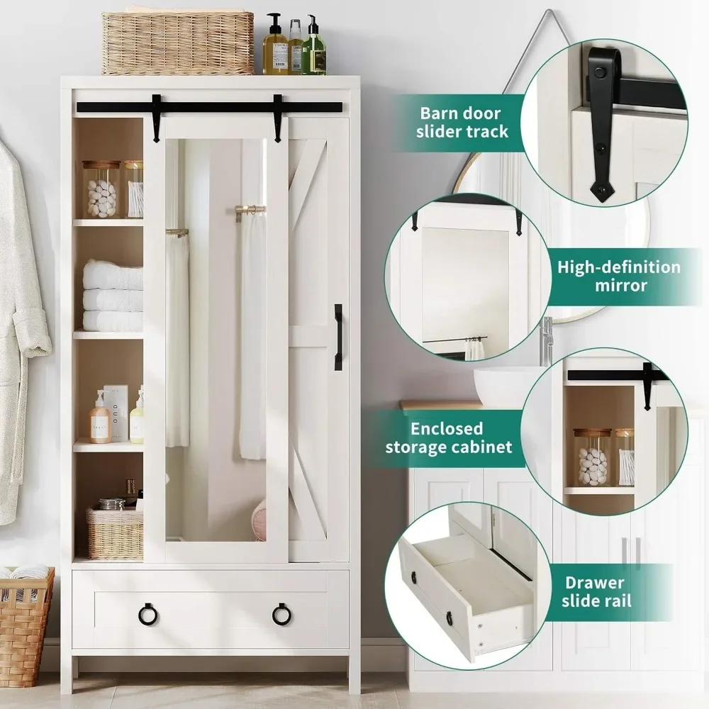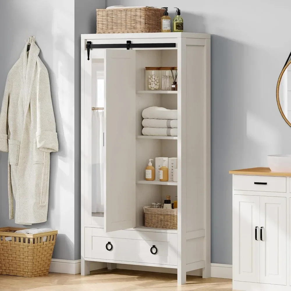 Bathroom Storage Cabinet – Tall Storage Cabinet with Full Length Mirror, Farmhouse Bathroom Cabinets with Doors and Drawers