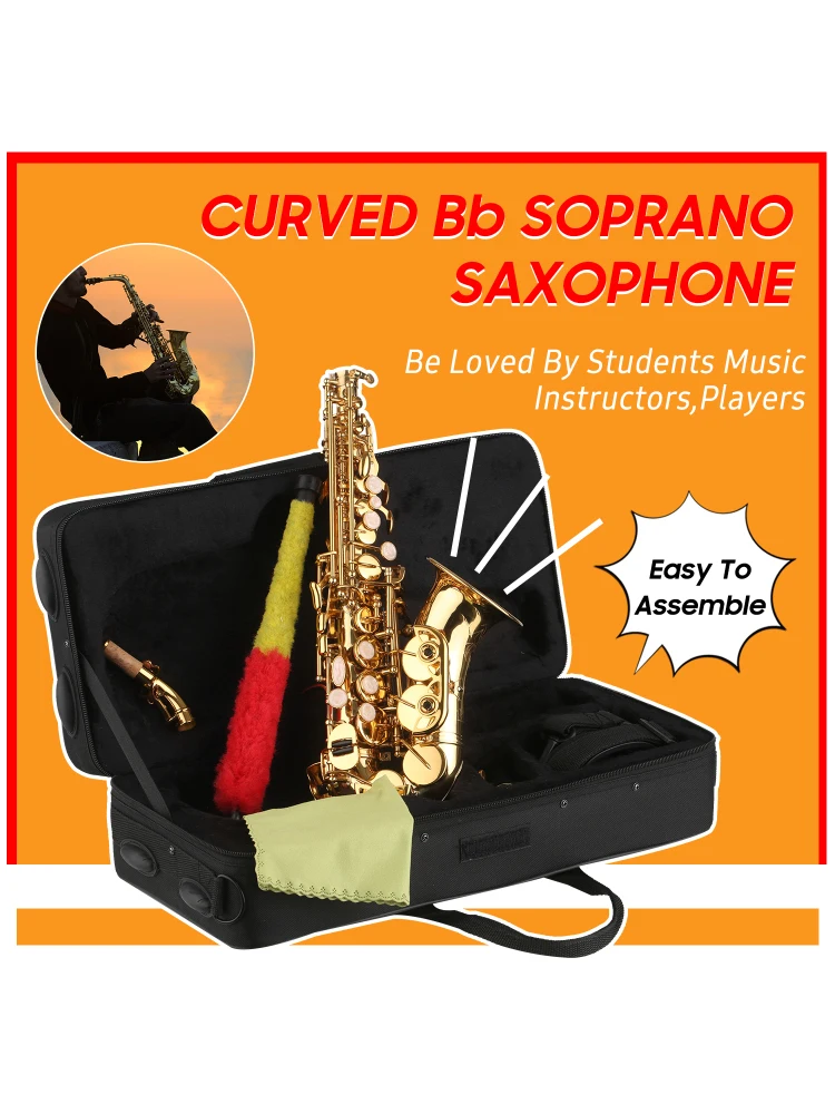 Bb Soprano Saxophone Gold Lacquer Brass Sax with Instrument Case Mouthpiece Neck Strap Cleaning Cloth Brush for Beginners