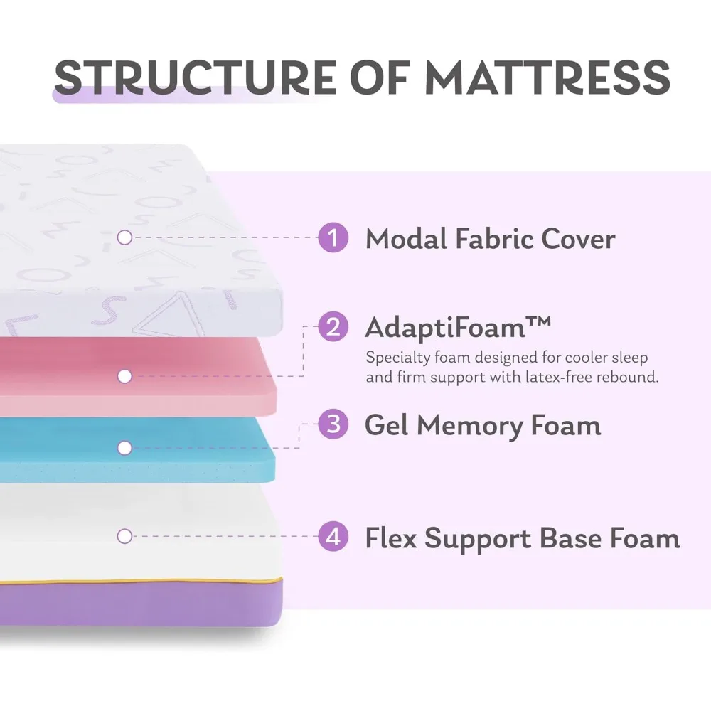 - Medium Firm with Exclusive Memory Foams: Adaptifoam is a specialized open-celled foam that enhances breathability and airflow. It provides children with multiple layers of contouring support and comfort while minimizing the bounciness commonly associated with innerspring mattresses. The exterior modal fabric, derived from beech-tree pulp, is soft and durable.