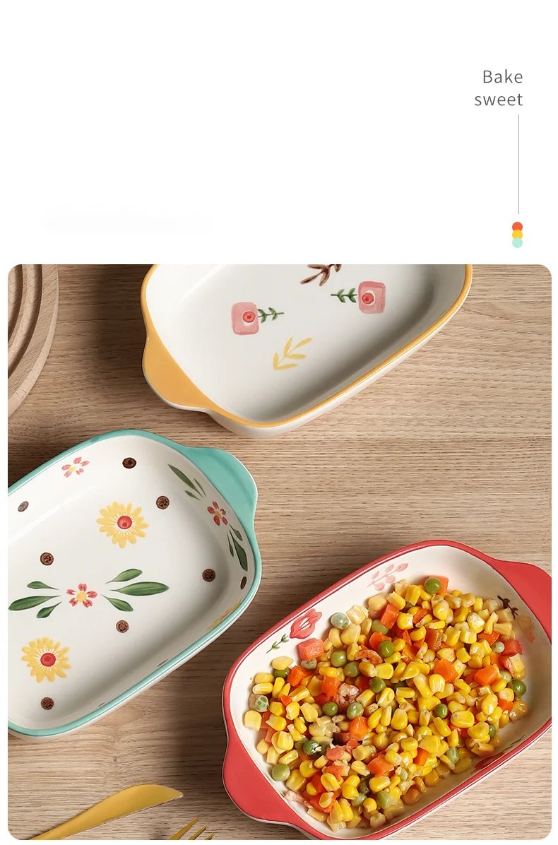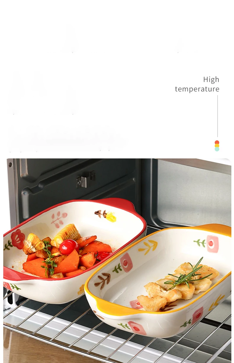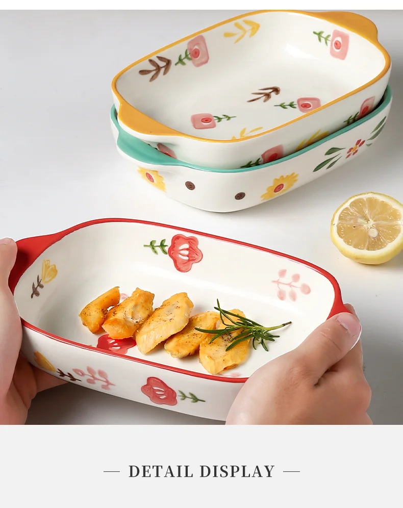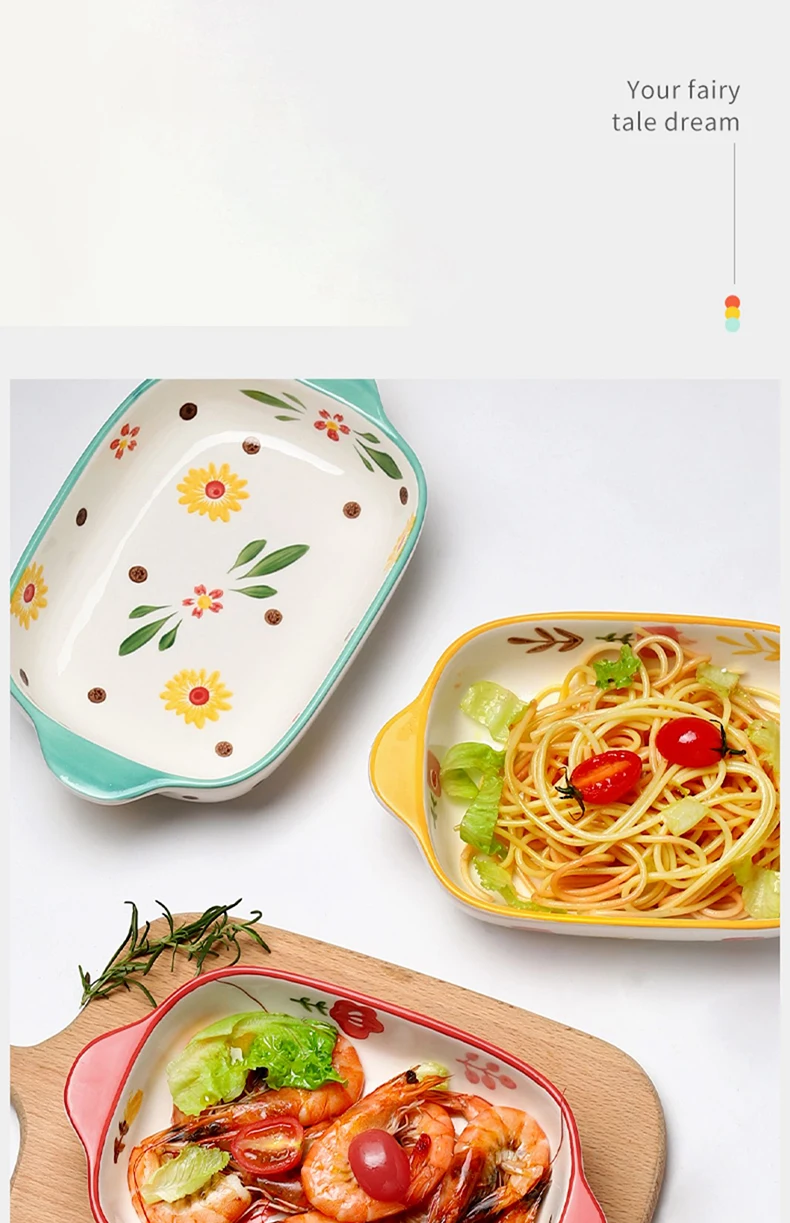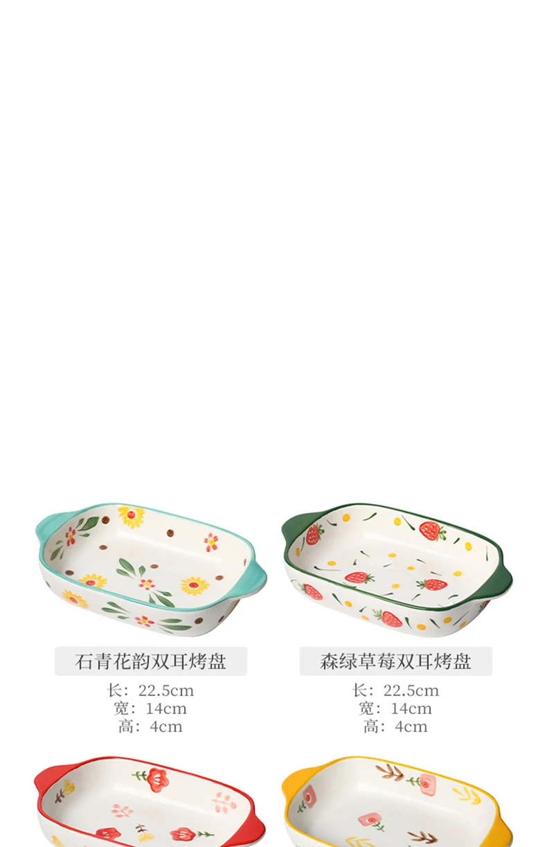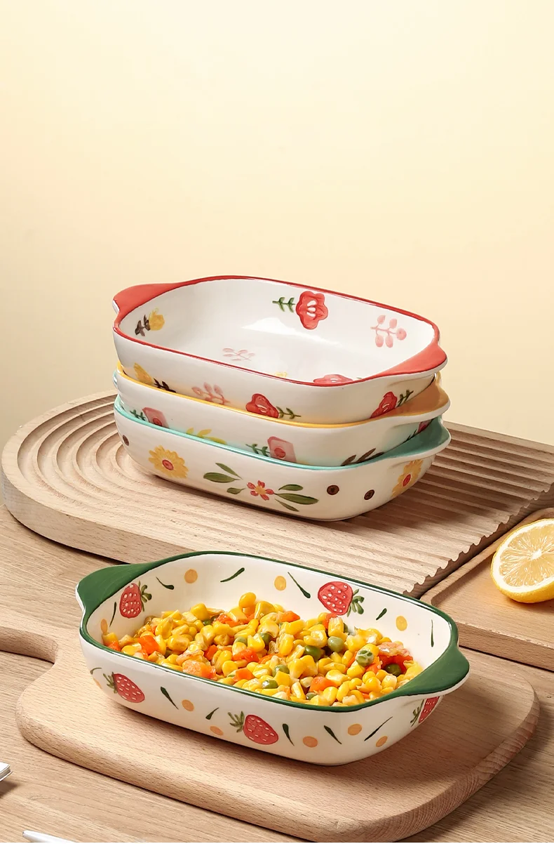 Binaural Ceramic Rectangular Baking Plate Cheese Baked Rice Plate Household Salad Plate Cute Printed Baking Bowl Utensils