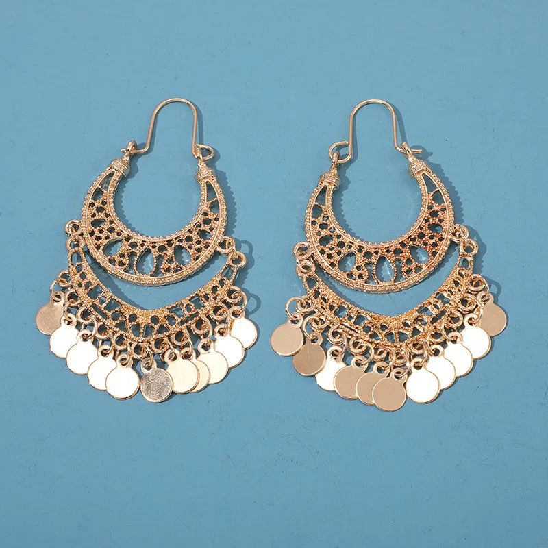 Bohemian Fashion Trendy Gold Sequin Tassel Hoop Drop Earrings Women’s Luxury Ethnic Style Party Bridal Gift Accessories