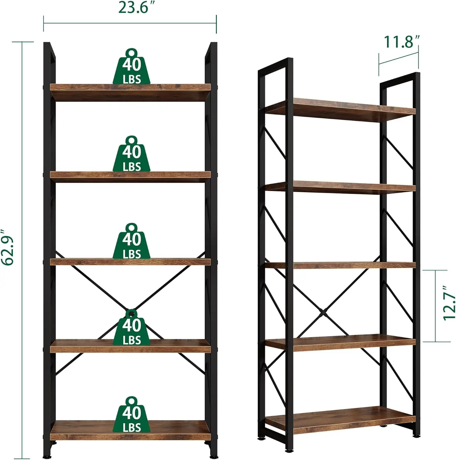 - High-Quality Metal Frame Bookcase:Constructed by premium metal and selected particle board, the contemporary metal bookcase is solid, stable, sturdy, and durable. With top notch anti-rust coating, the whole shelf looks more sophisticated. With an excellent metal frame and thick solid panel, each panel of the bookcase can hold up to 40 lbs. Because of the fixed rod assembly, the industrial shelf has strong stability and can perfectly protect your items. No shaking No wobbling.