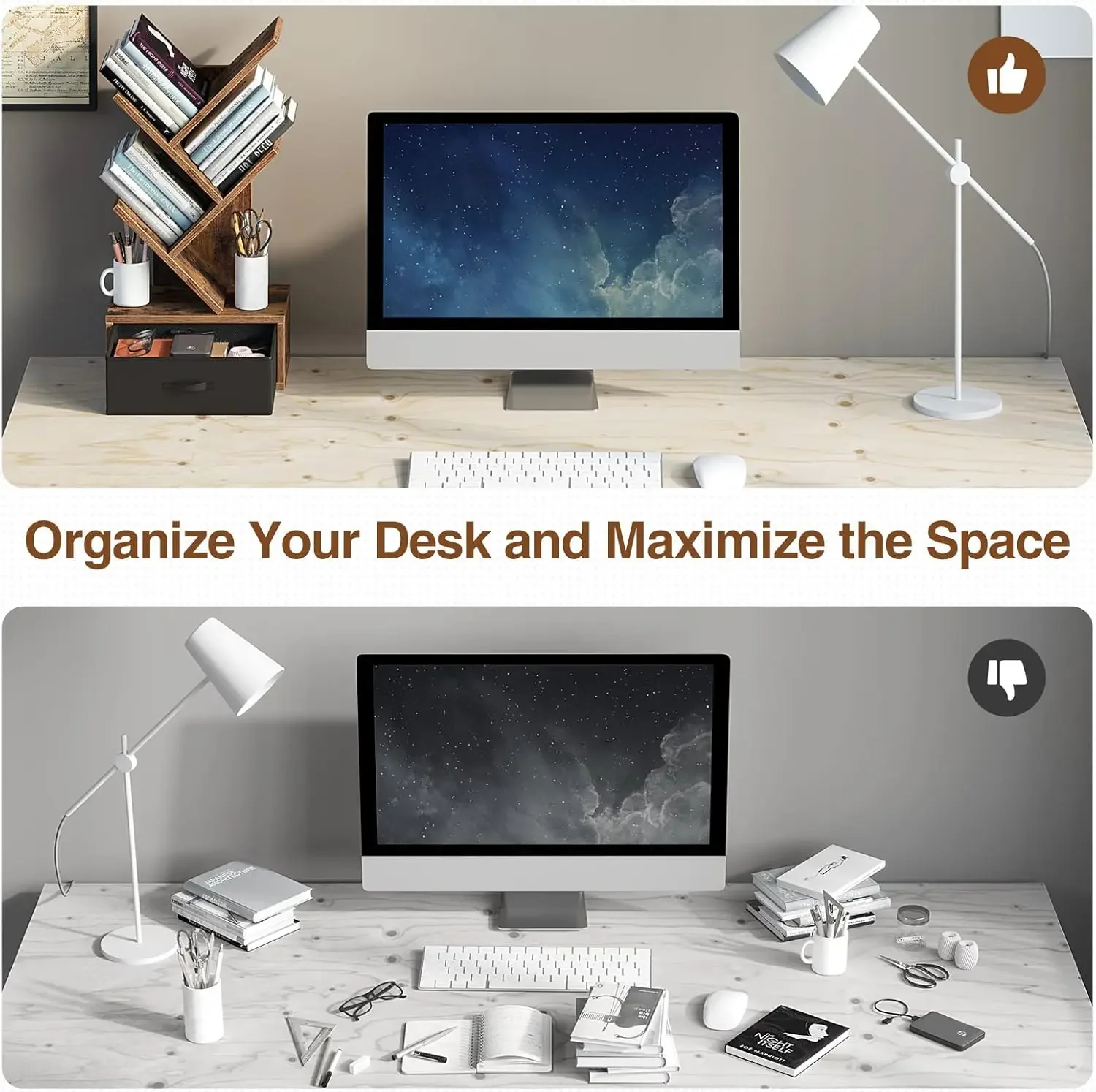- Space Saving & Large Capacity: Tree Bookshelf dimensions: 23.6H*11.8L*.1W, this bookshelf is very compact but comes with 3 open shelves and 1 bottom drawer(10.5L*6.4W*3.”H). Each shelf can load up to 5-10 books and great store books, plants…You can place your treasures on it!