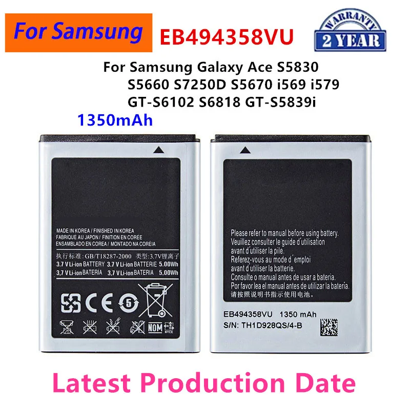 Brand New EB494358VU 1350mAh Battery For Samsung Galaxy Ace S5830 S5660 S7250D S5670 i569 I579 GT-S6102 S6818 GT-S5839i
