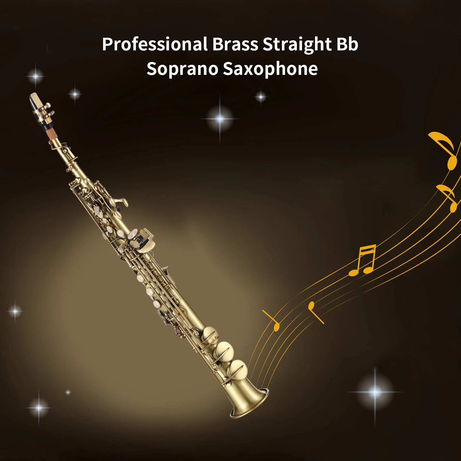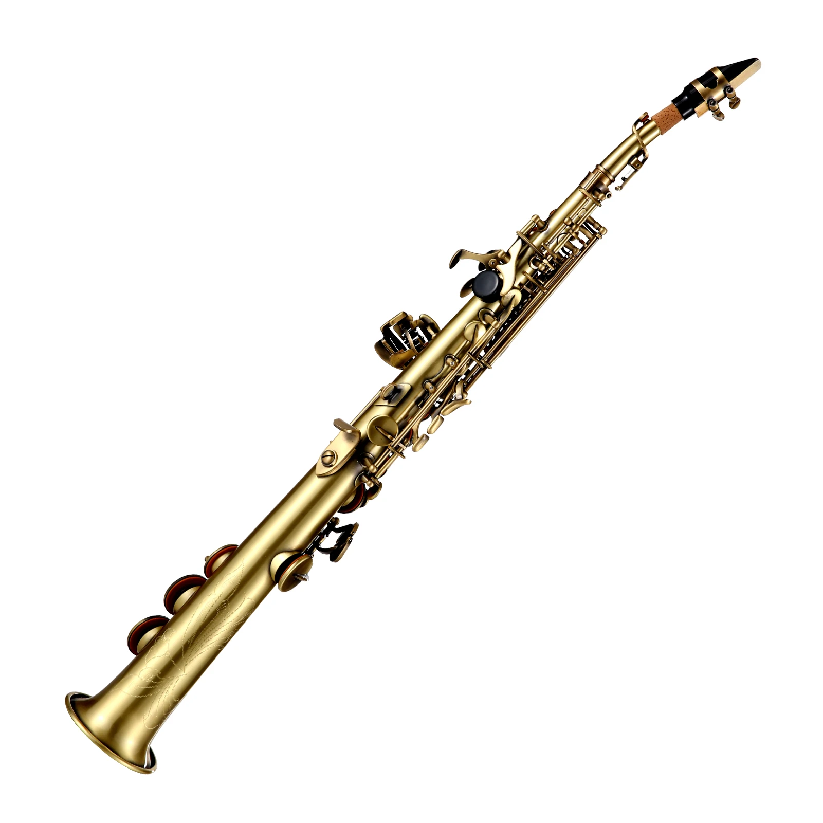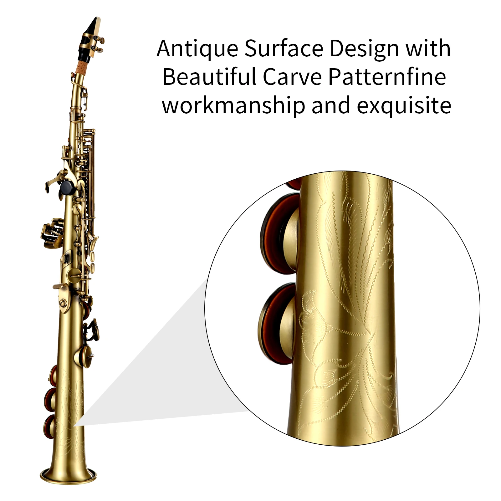 This Bb straight soprano saxophone is suitable for professional saxophonist. Made of high-quality brass material, with antique carve pattern surface , etc.