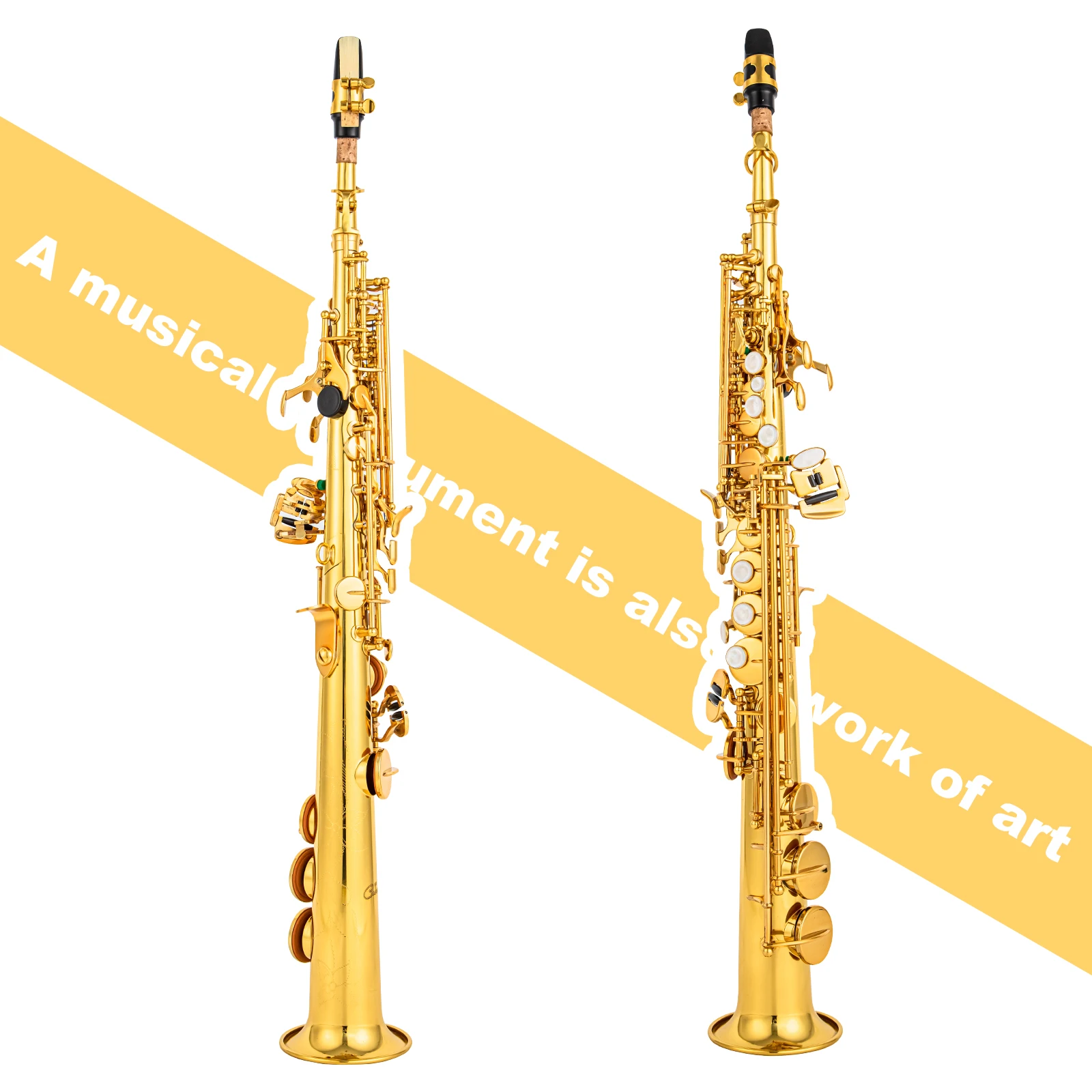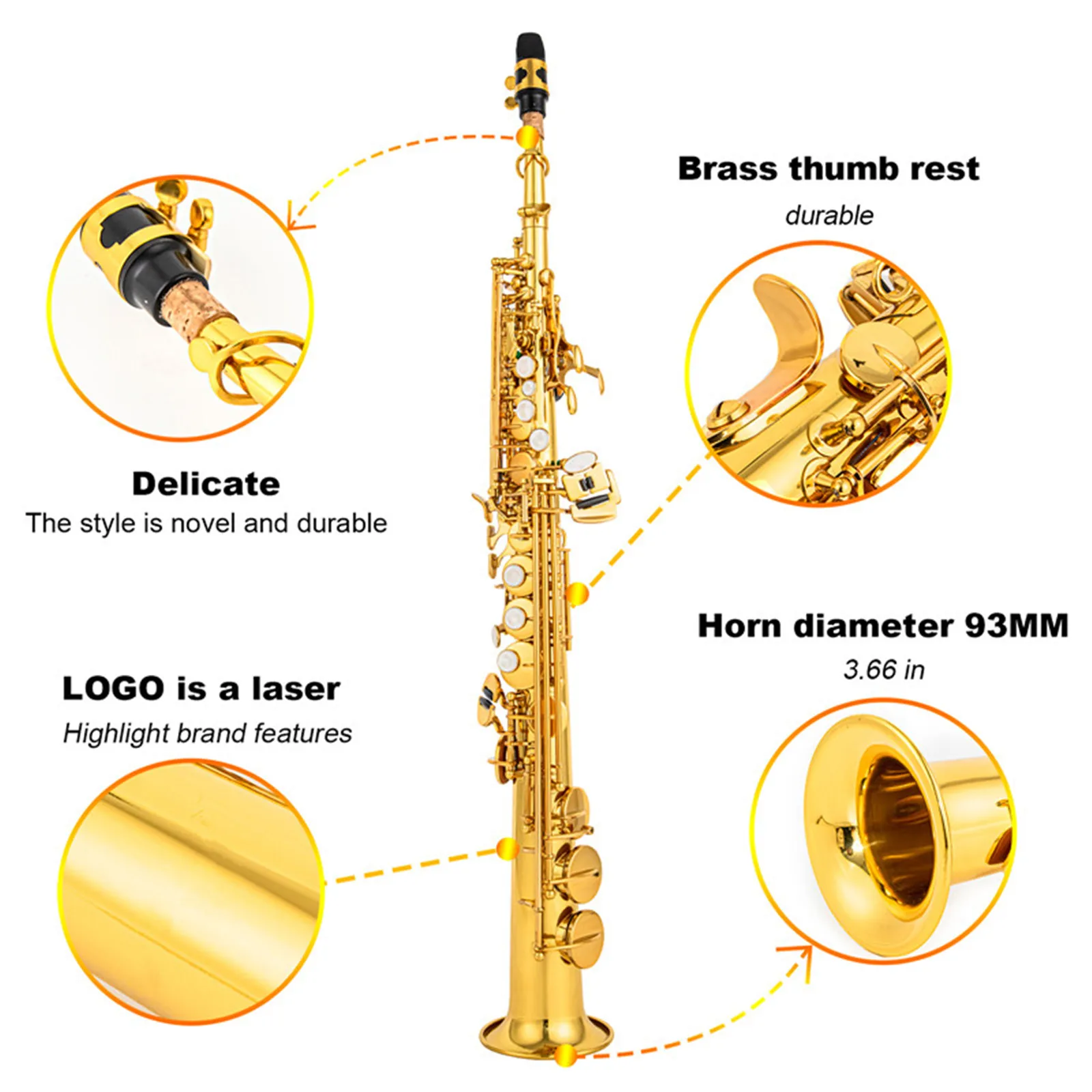 Brass Straight Soprano Saxophone Bb BFlat Woodwind Instrument Natural Shell Key Carve Pattern with Carrying Case Sax Accessories