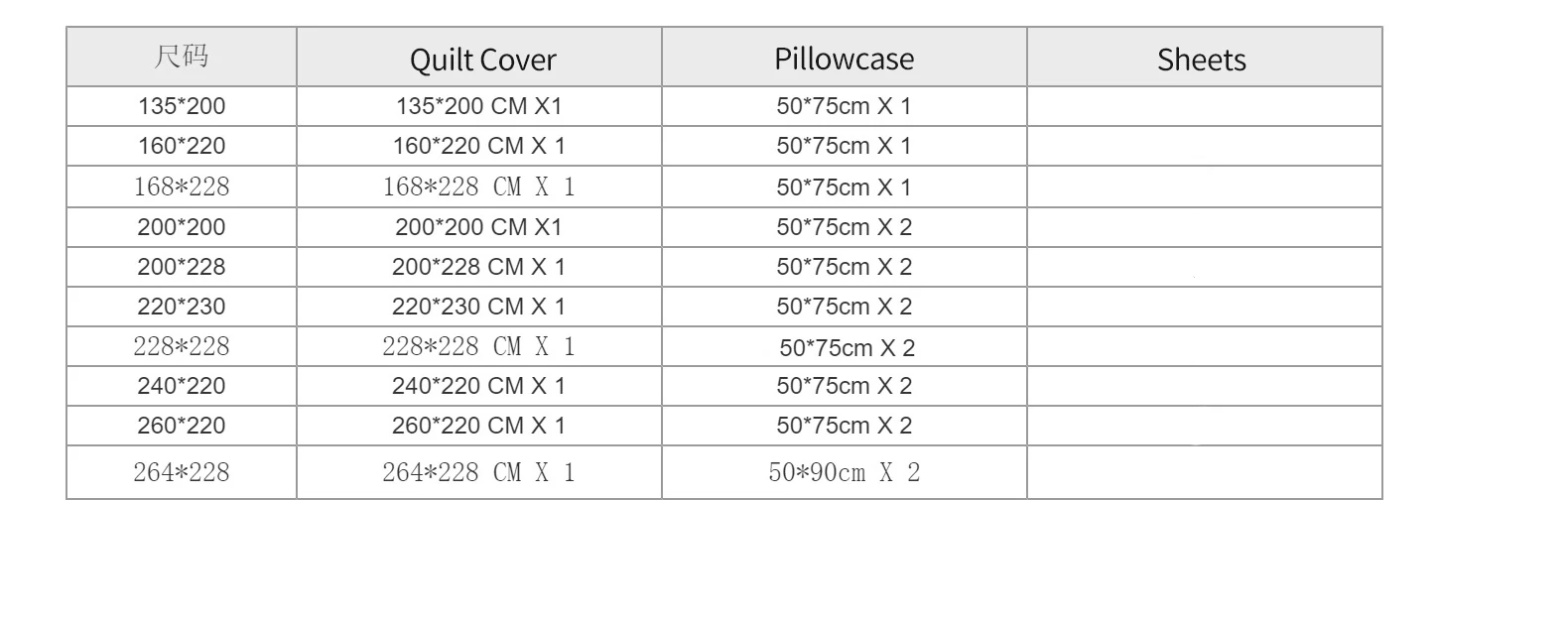 US King: 1 × Quilt Cover(228*264cm) + 2 × Pillow Case(50*75cm)
