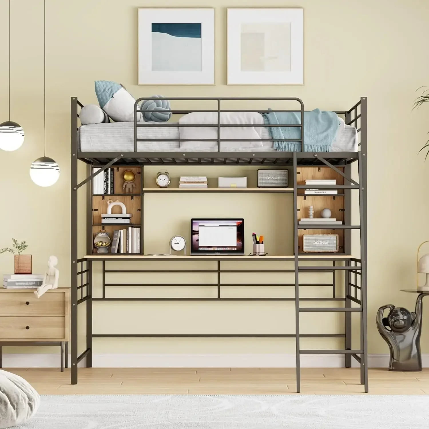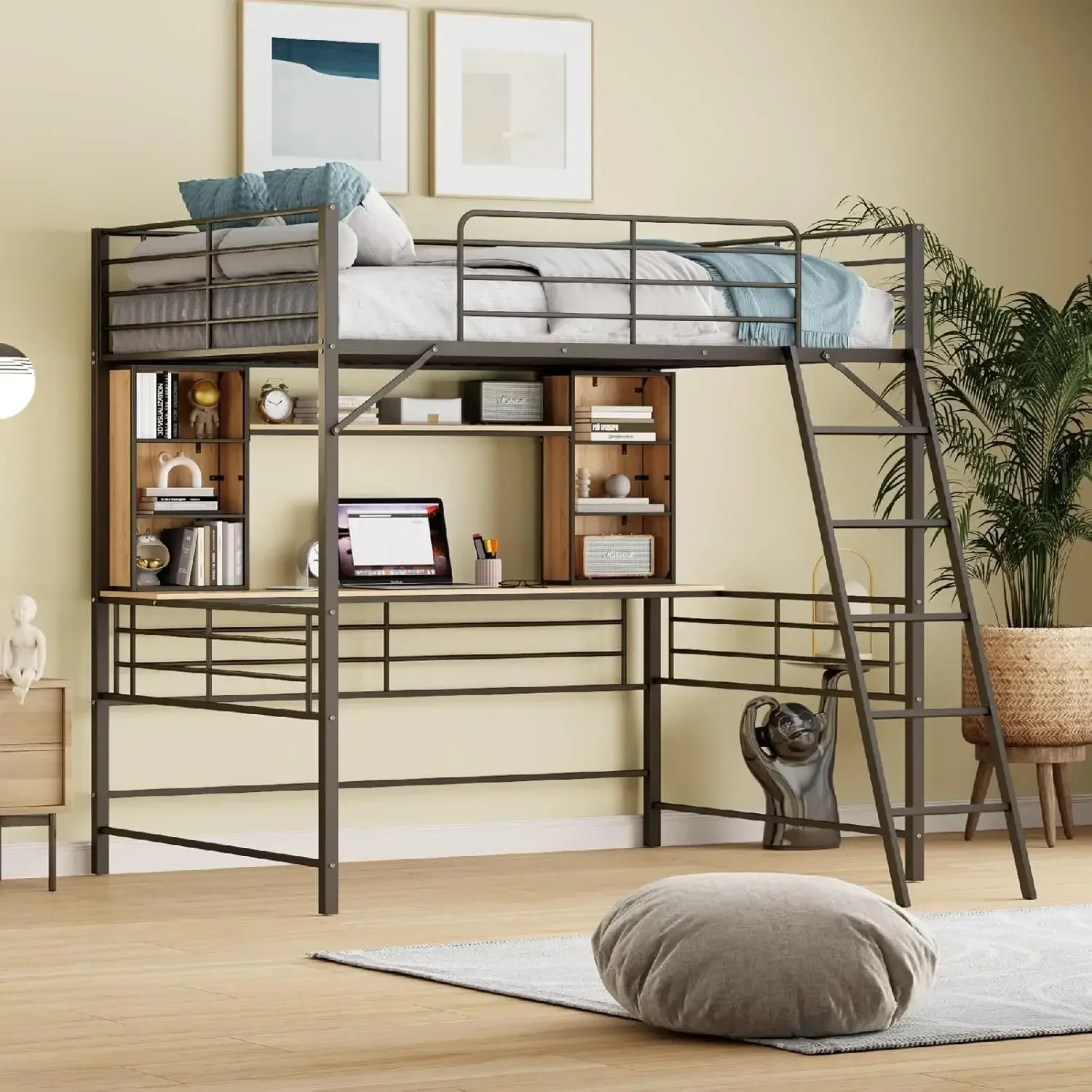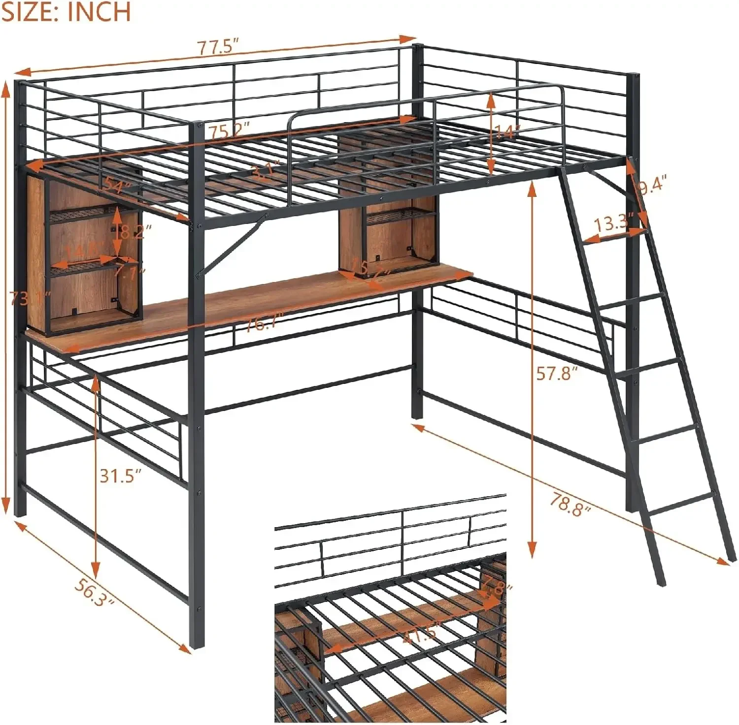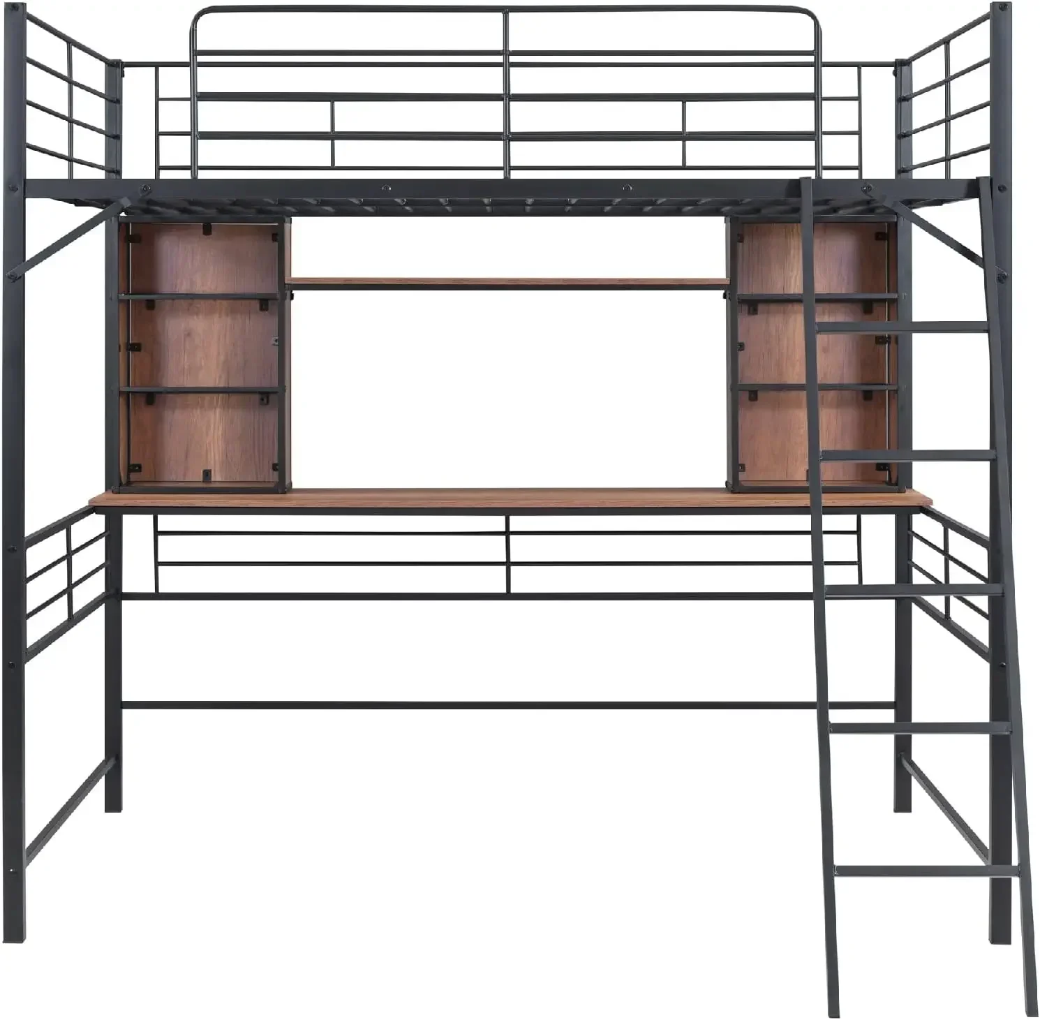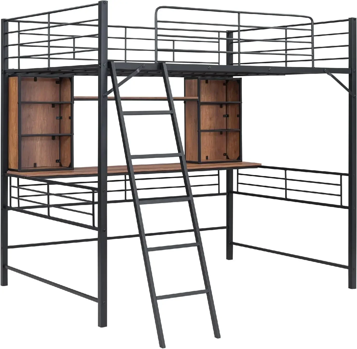 Bunk Beds Full Queen Size Bed, Bed Frame Black Loft Bed Metal with Desk and Shelf, Ladder Max 250Lbs Bunk Beds for Kids