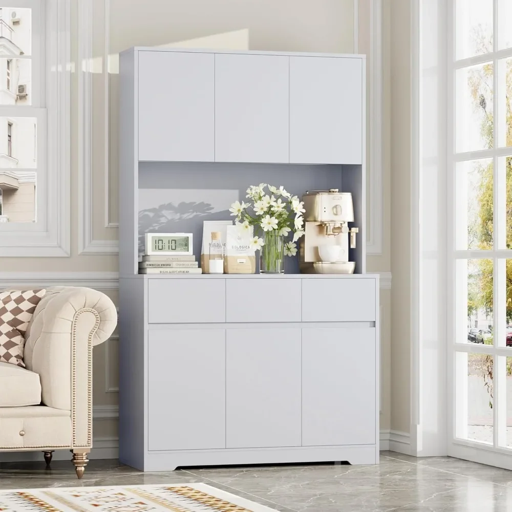 • 【Upgrade Your Kitchen Storage】Boasting middle open countertop, 4 shelves within 4 cabinets, and 3 drawers, this pantry cabinet provides ample space for different types of items such as microwaves, toasters, coffee makers, tableware, wine glasses, or other foodstuff. Additionally, you can adjust the shelves of cabinets up or down for daily use. Safety is our priority for you and your family, so there is an anti-tip kit for our kitchen pantry storage cabinet that you can fix to the wall to ensure it will not fall over.