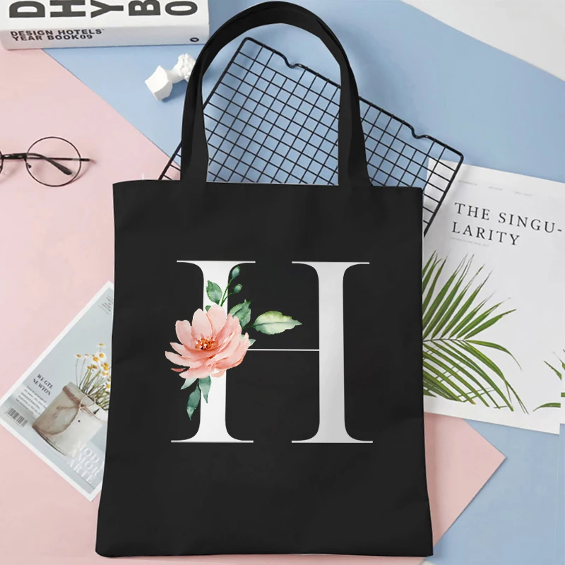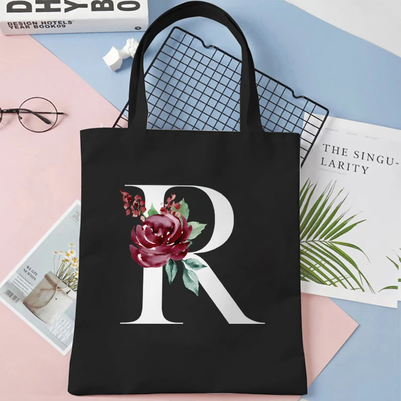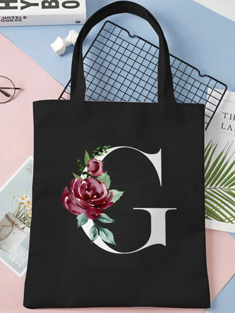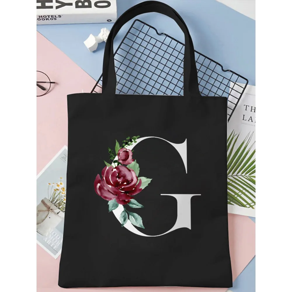 Canvas Bag for Women Rose 26 Alphabet A-Z Shopper Aesthetics Handbag Storage Reusable Black Shoulder Bag Floral Letter Tote Bag