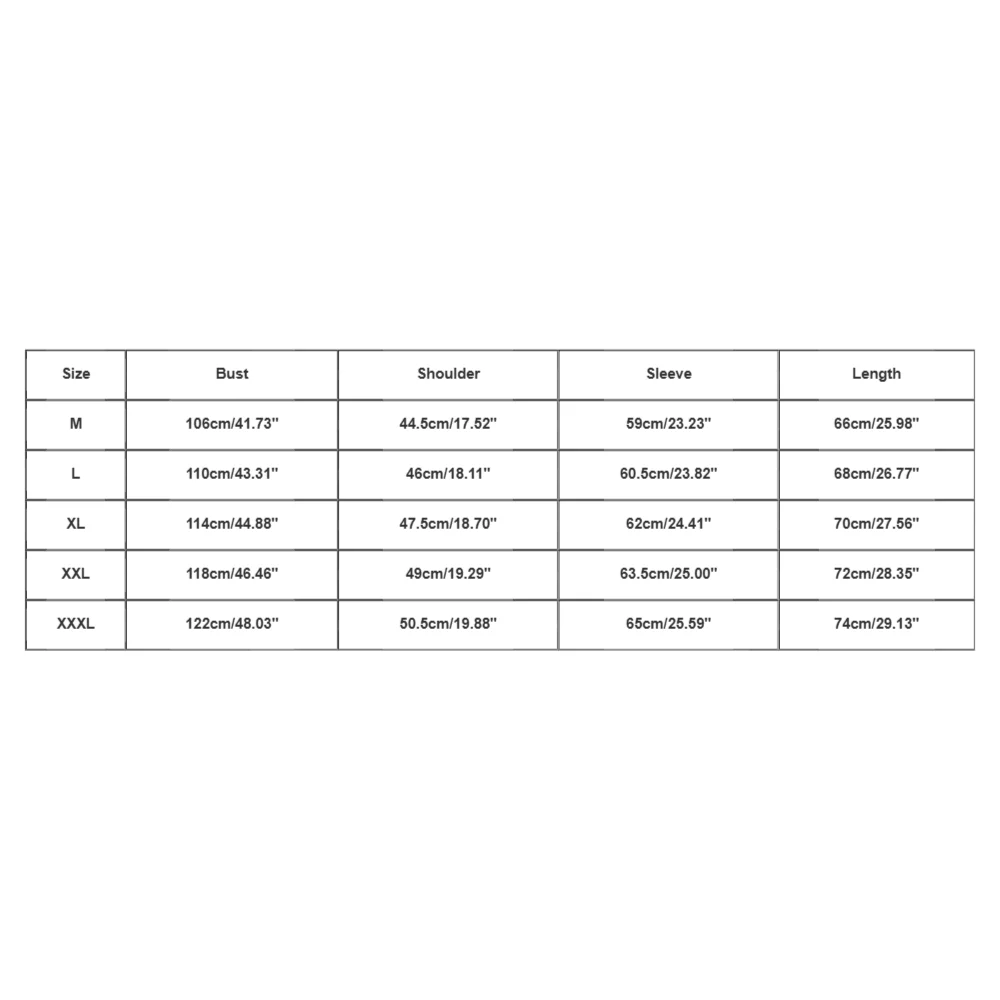 | Size:XXXL | Bust:122cm/48.03” | Shoulder:50.5cm/19.88” | Sleeve:65cm/25.59” | Length:74cm/29.13” |