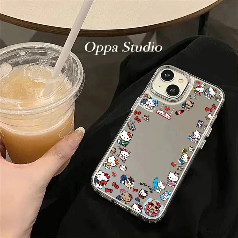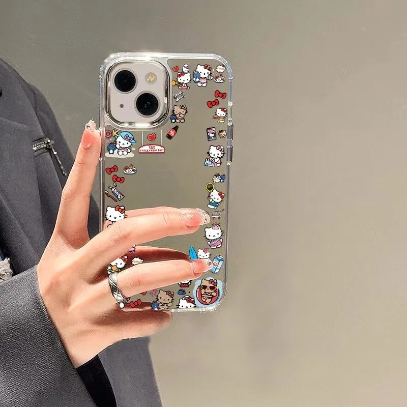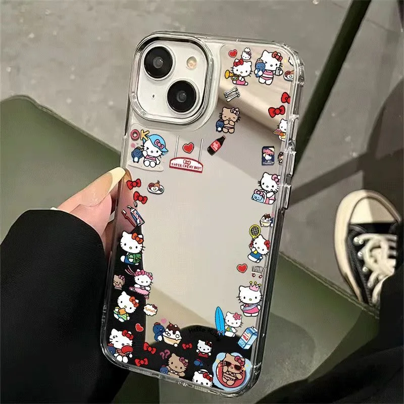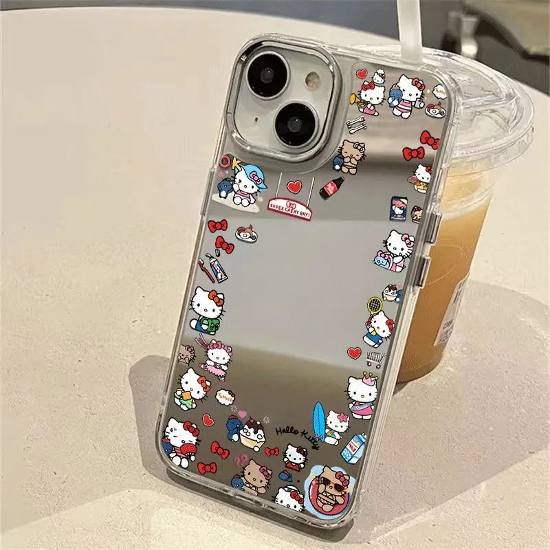 Cartoon Cute Hello Kitty Bear Make Up Mirror KT Phone Case For iPhone 11 12 13 14 15 16 Pro Max Lovely illustration Kitty Shell