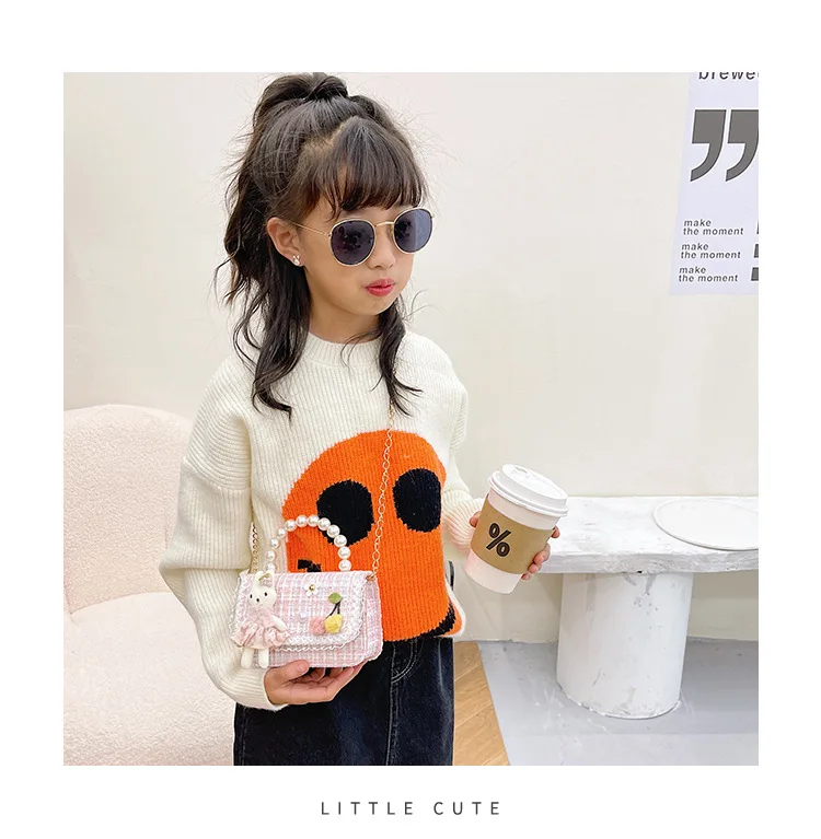 Casual Sweet Bunny Children’s Pearl Handle Shoulder Bags Cute Baby Girls Small Square Crossbody Bag Plaid Knit Kids Handbags