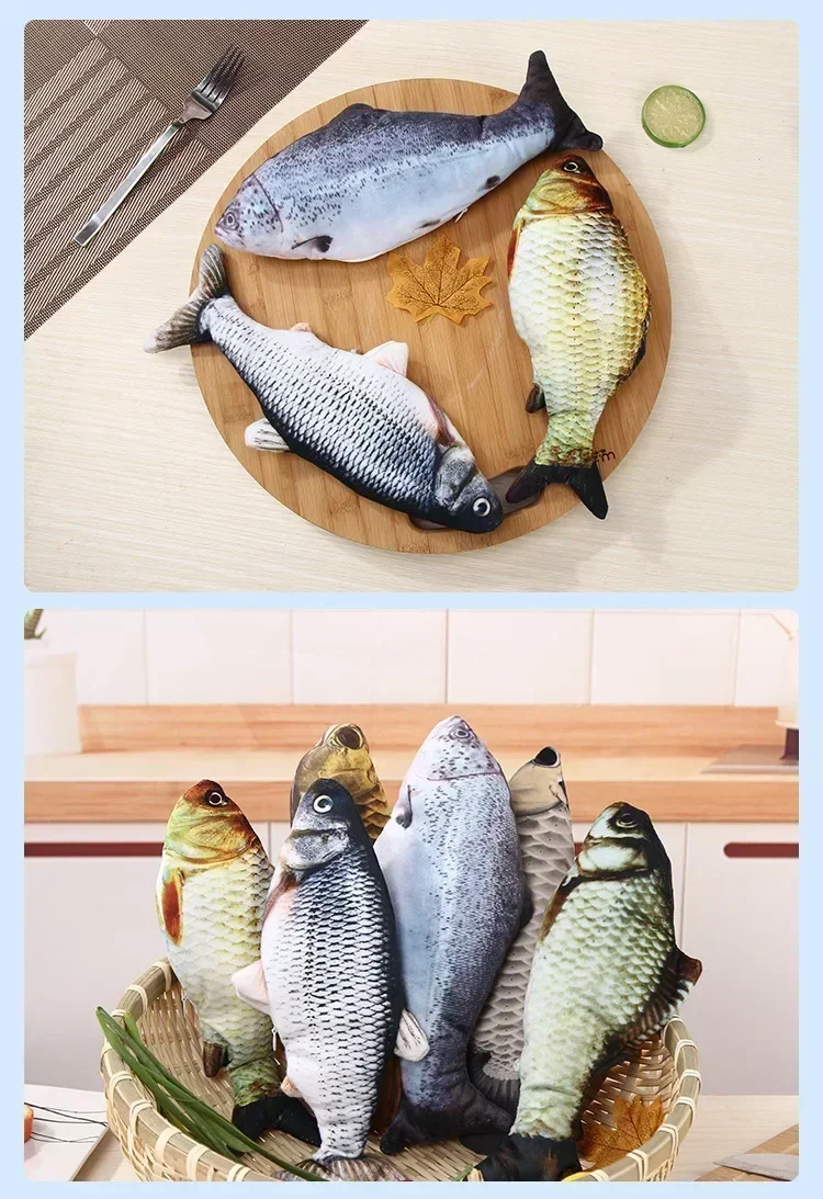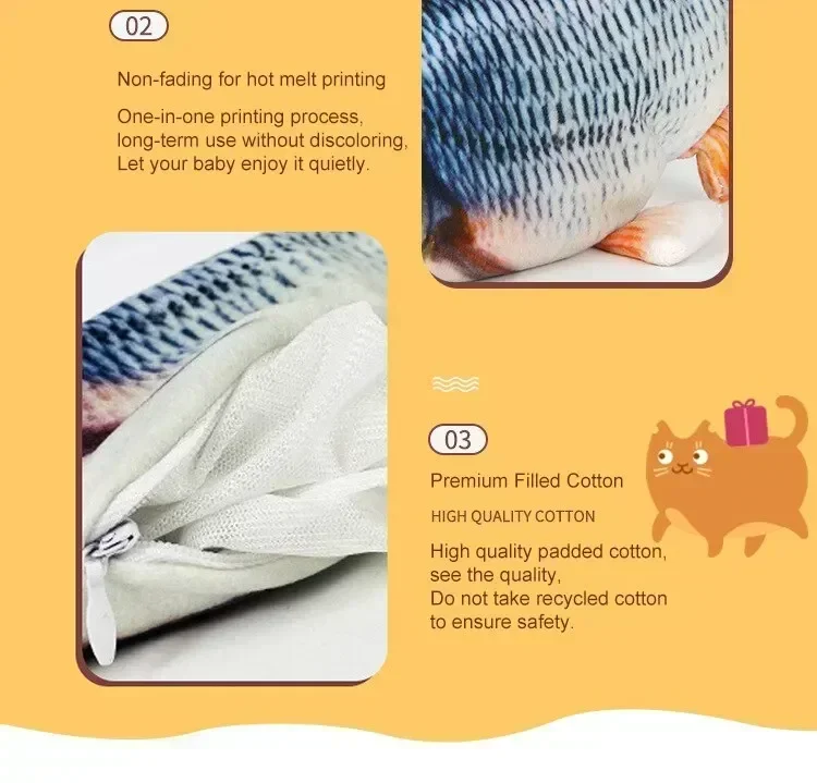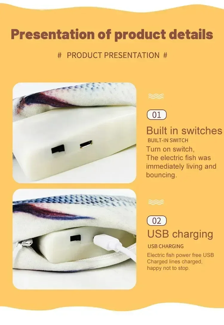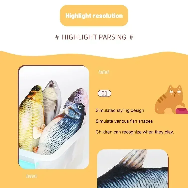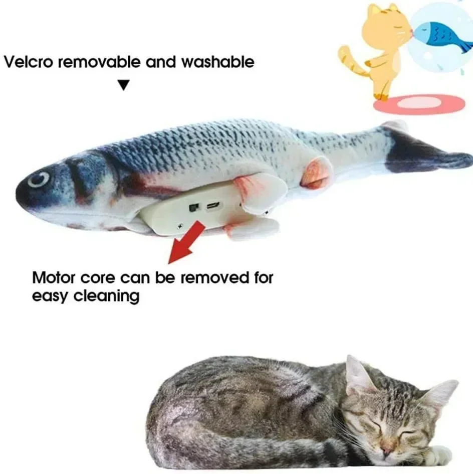 Features: 1. Electric fish and cat toy: When your cat touches the toy, the cat fish toy will automatically move and sway and make a sound, attracting your cat to play and kick, without the need to replace the battery.