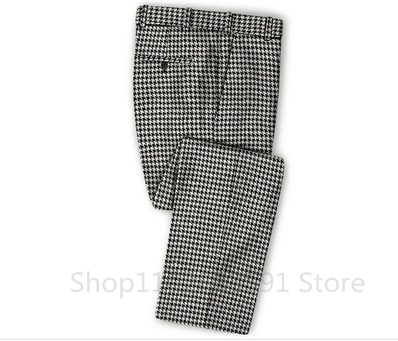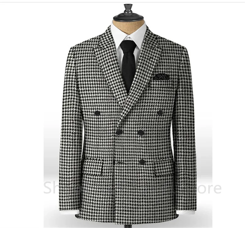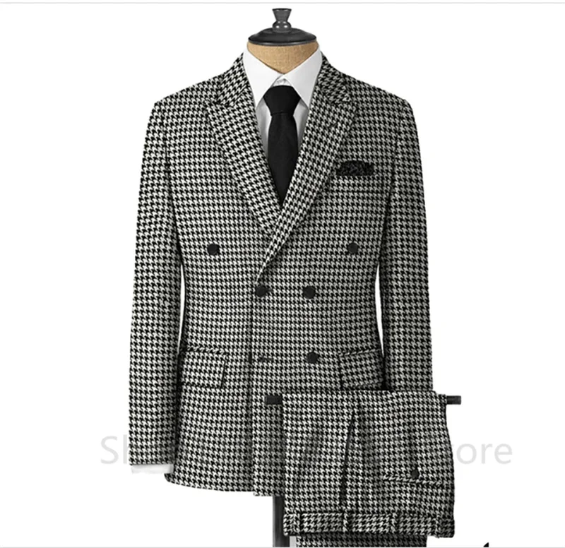 Check Houndstooth Men Suits for Groomsmen with Peak Lapel 2 Pieces Wedding Tuxedo Casual Plaid Man Fashion Jacket Pants