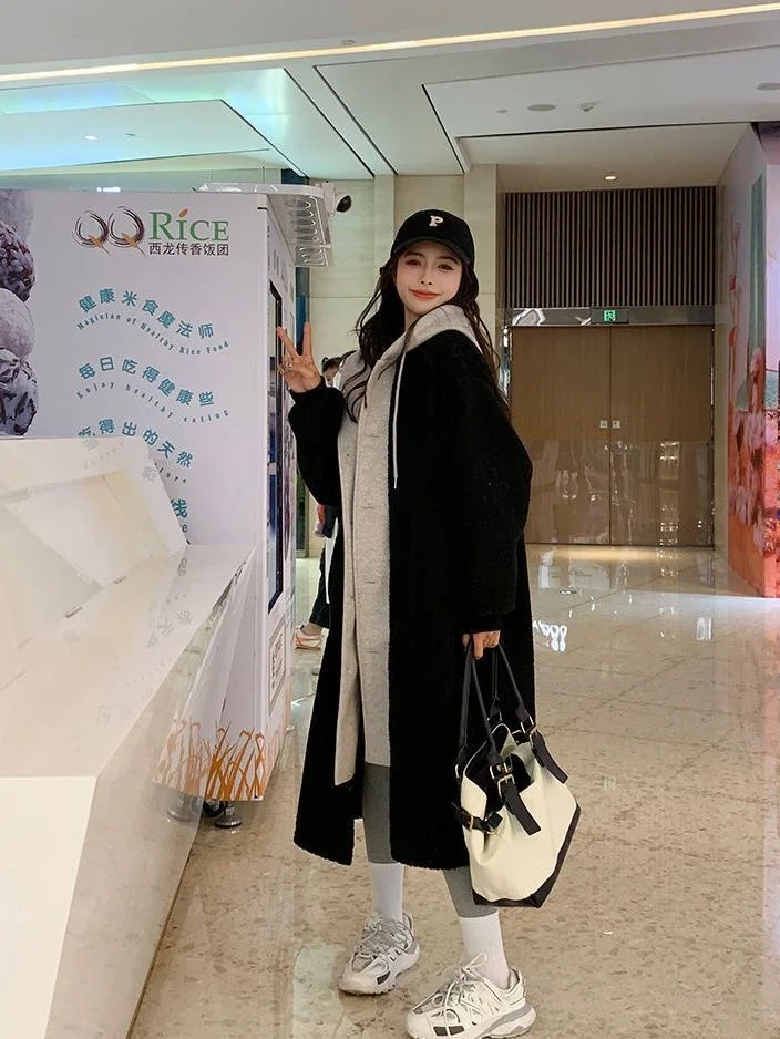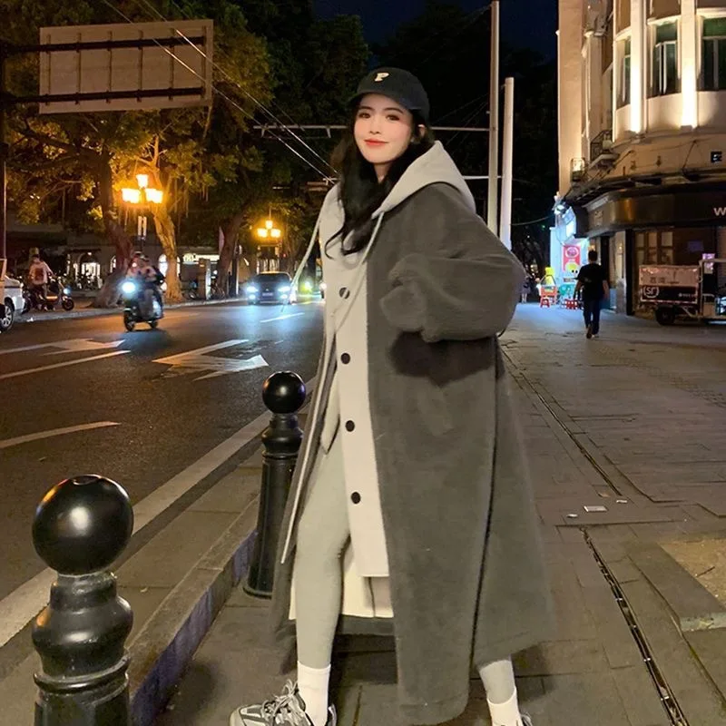 Chic Autumn and Winter New Long Hooded Single-breasted Coat Lambswool Joker Loose Fashion Coat Ins Style
