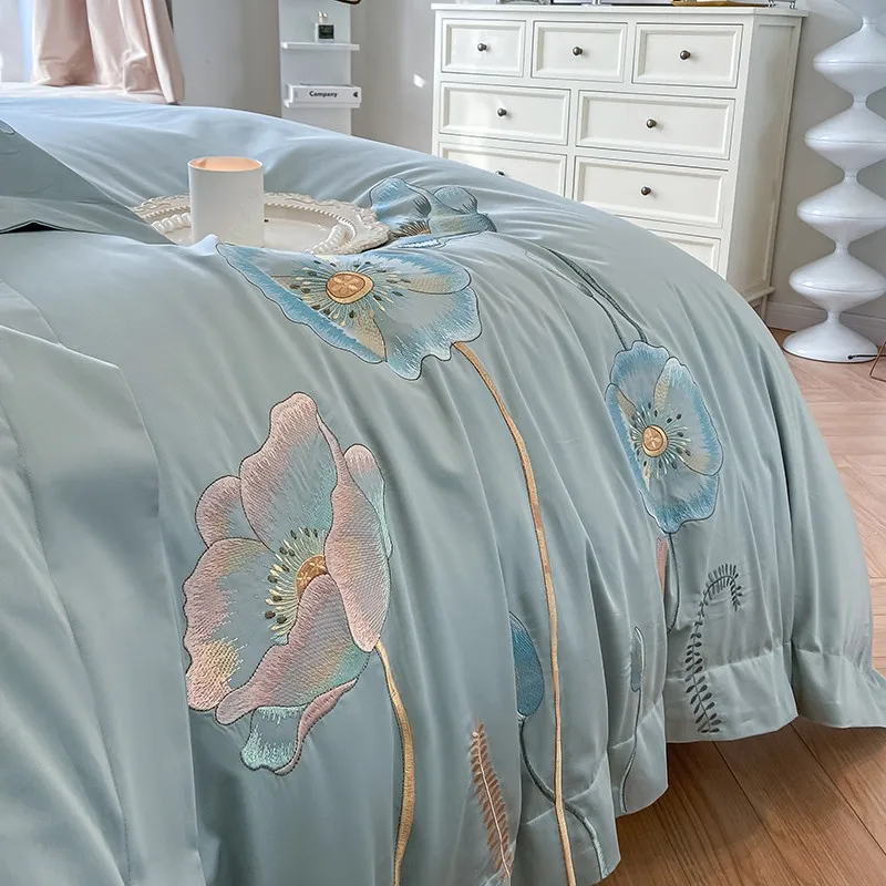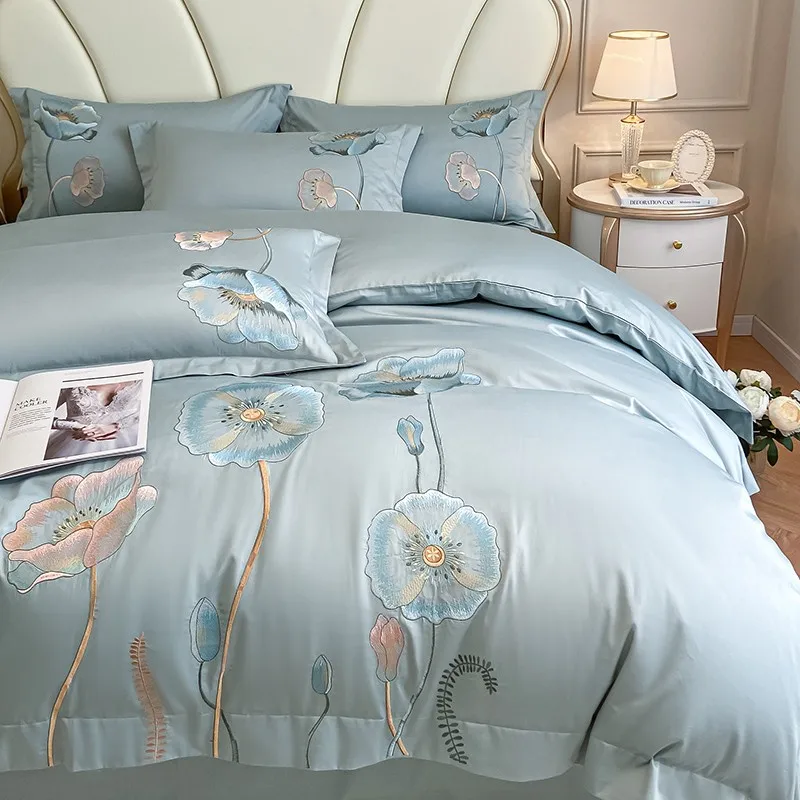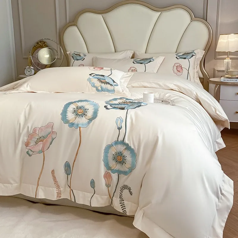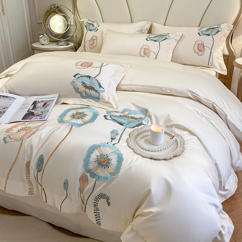 Chic Embroidery Blooming Beige Duvet Cover set 100%Cotton Soft Comfy Beddng set Bed Sheet Pillowcases Double Queen King 4Pcs