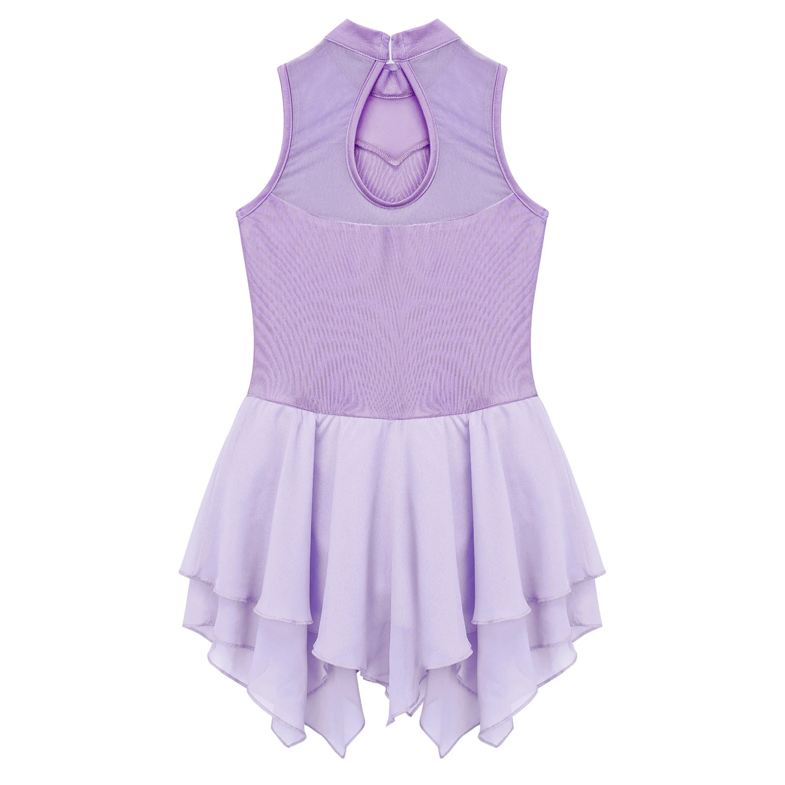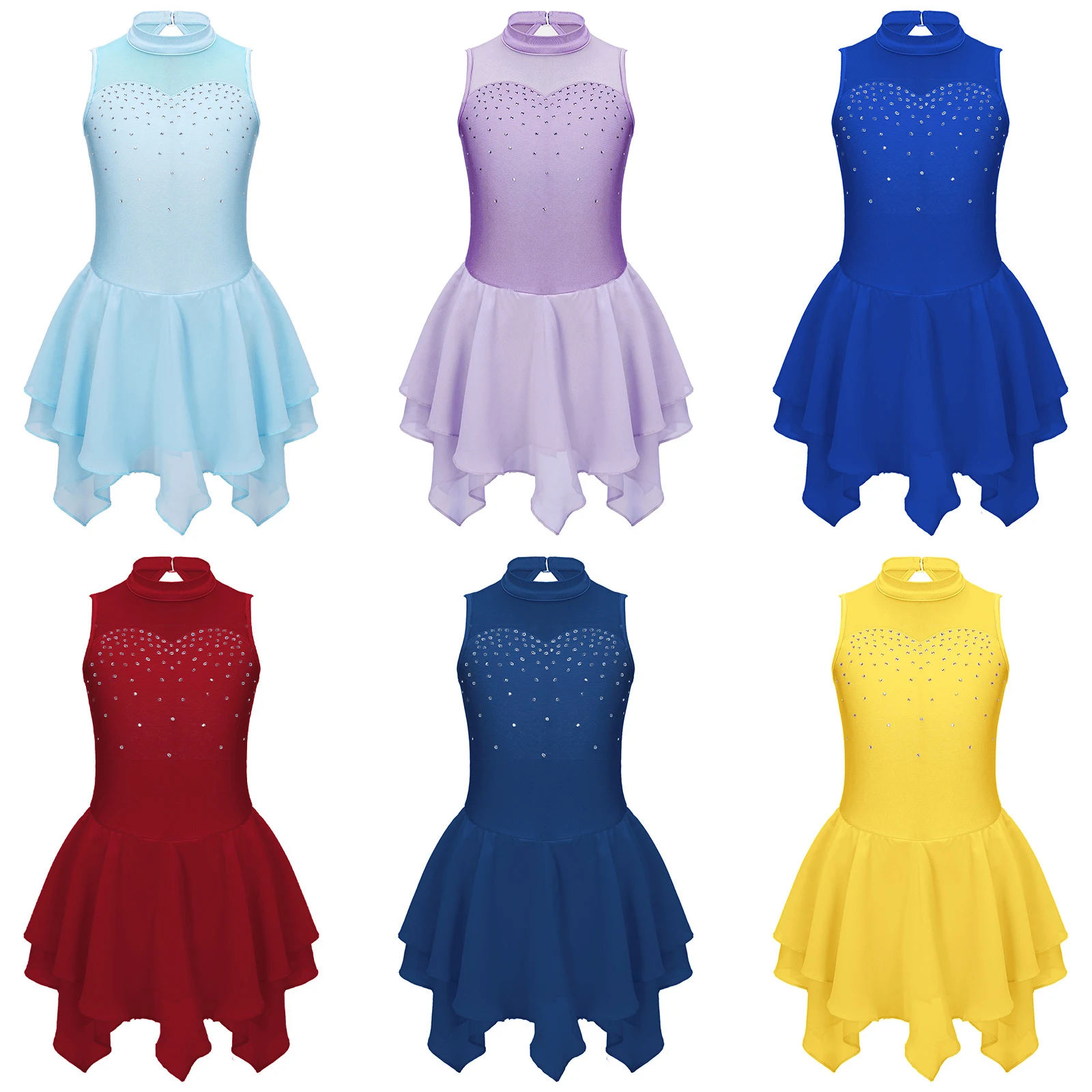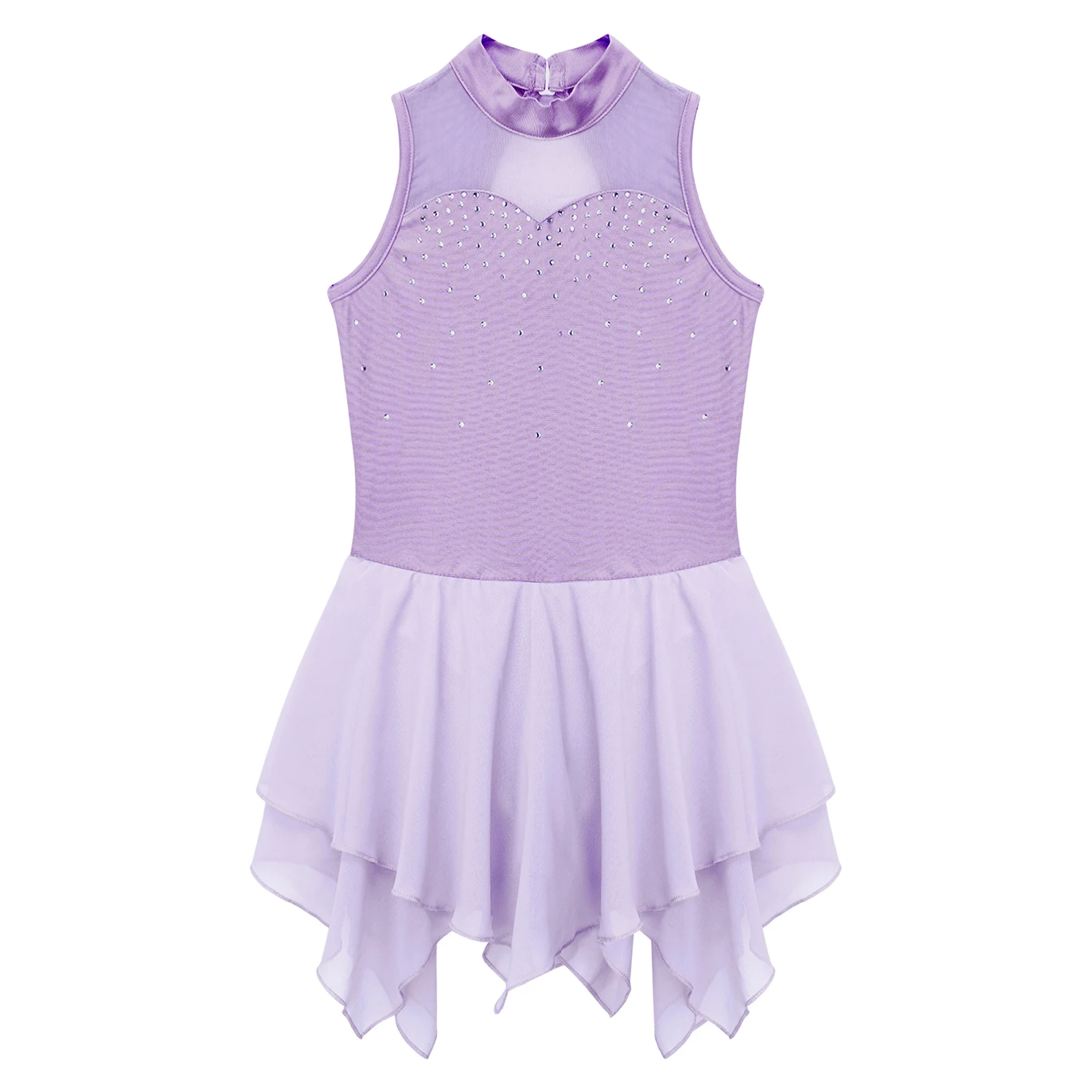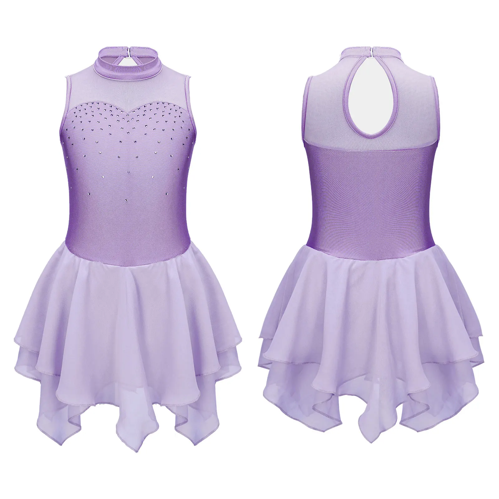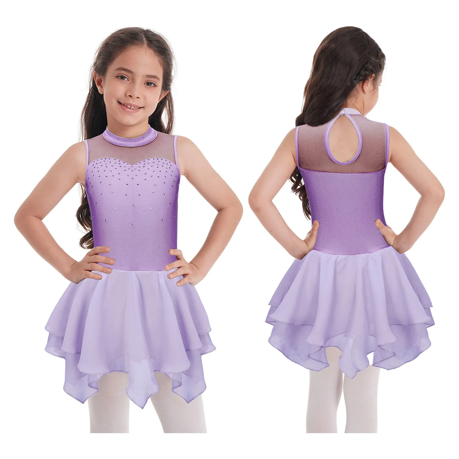 Children Girls Figure Skating Dress Ballet Gymnastics Lyrical Dance Performance Costume Sleeveless Rhinestone Mesh Leotard Tutu