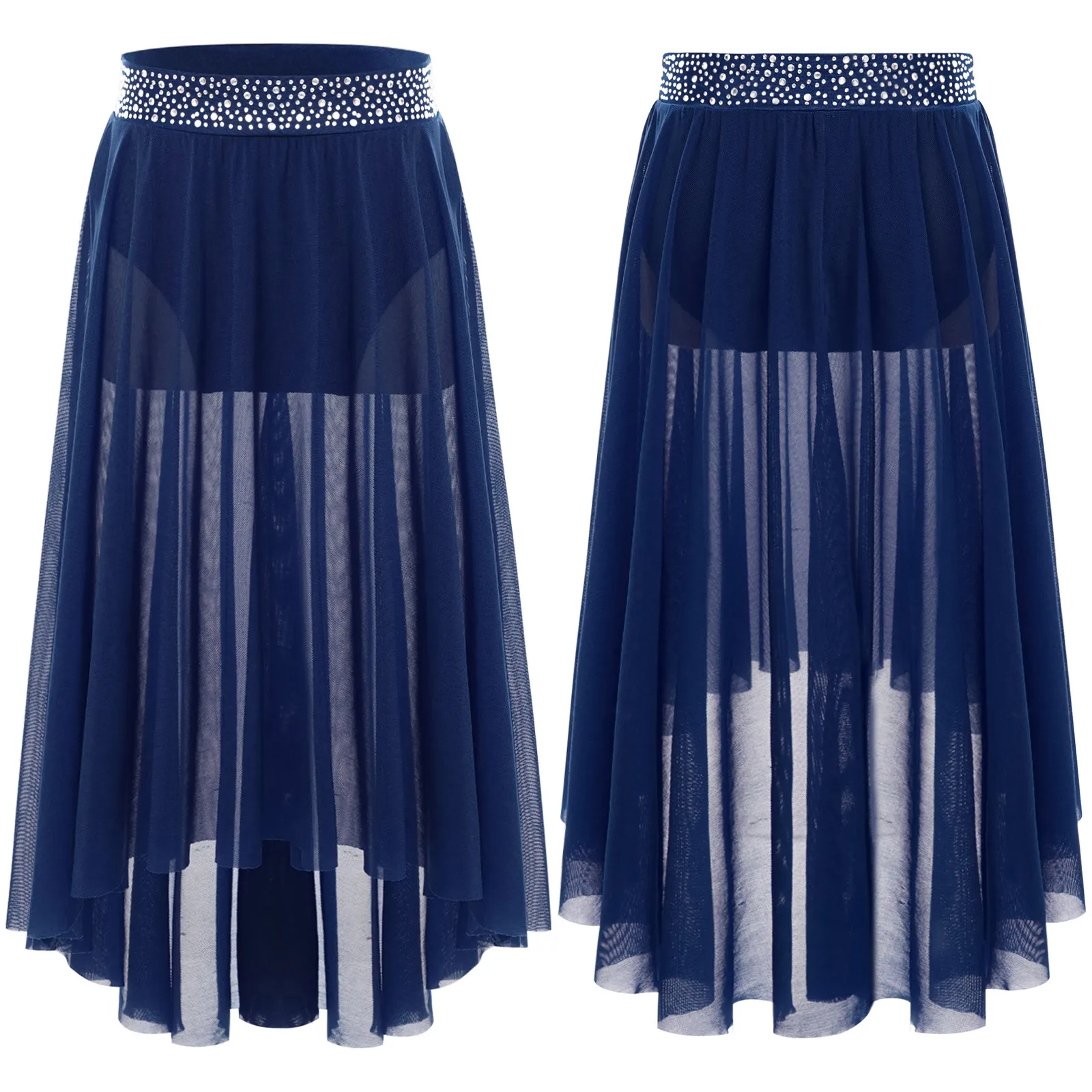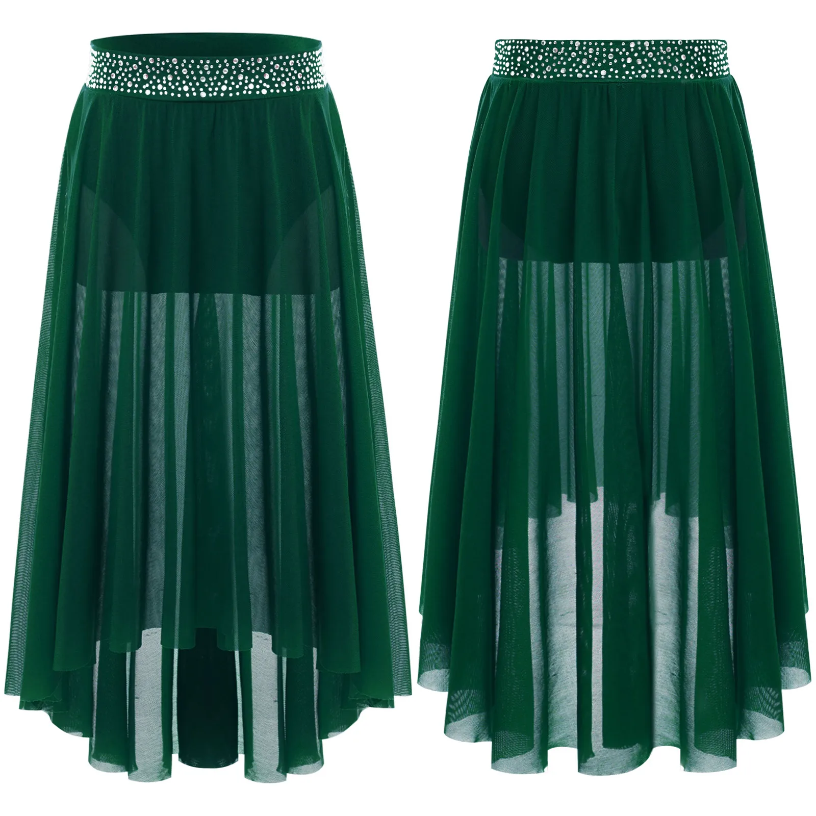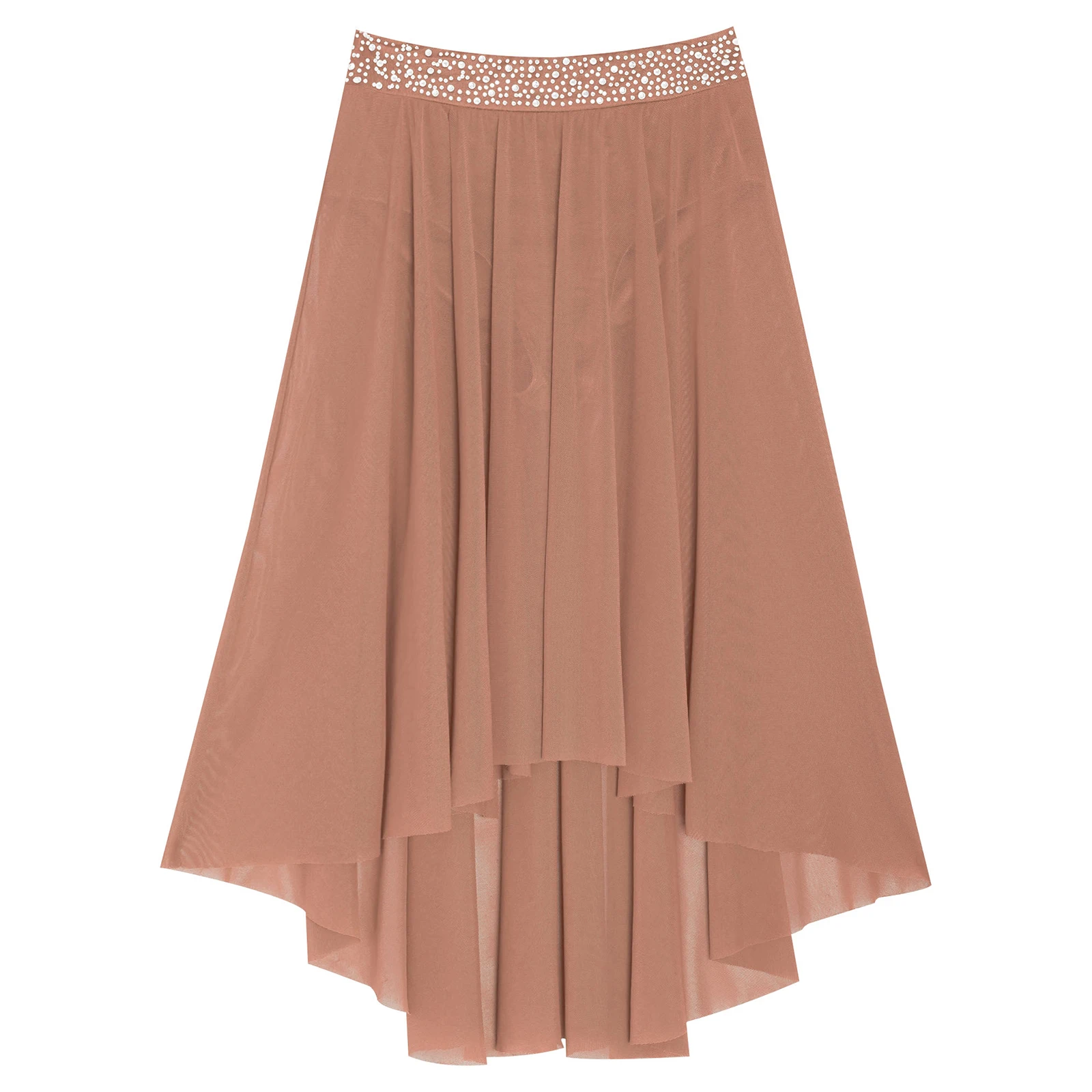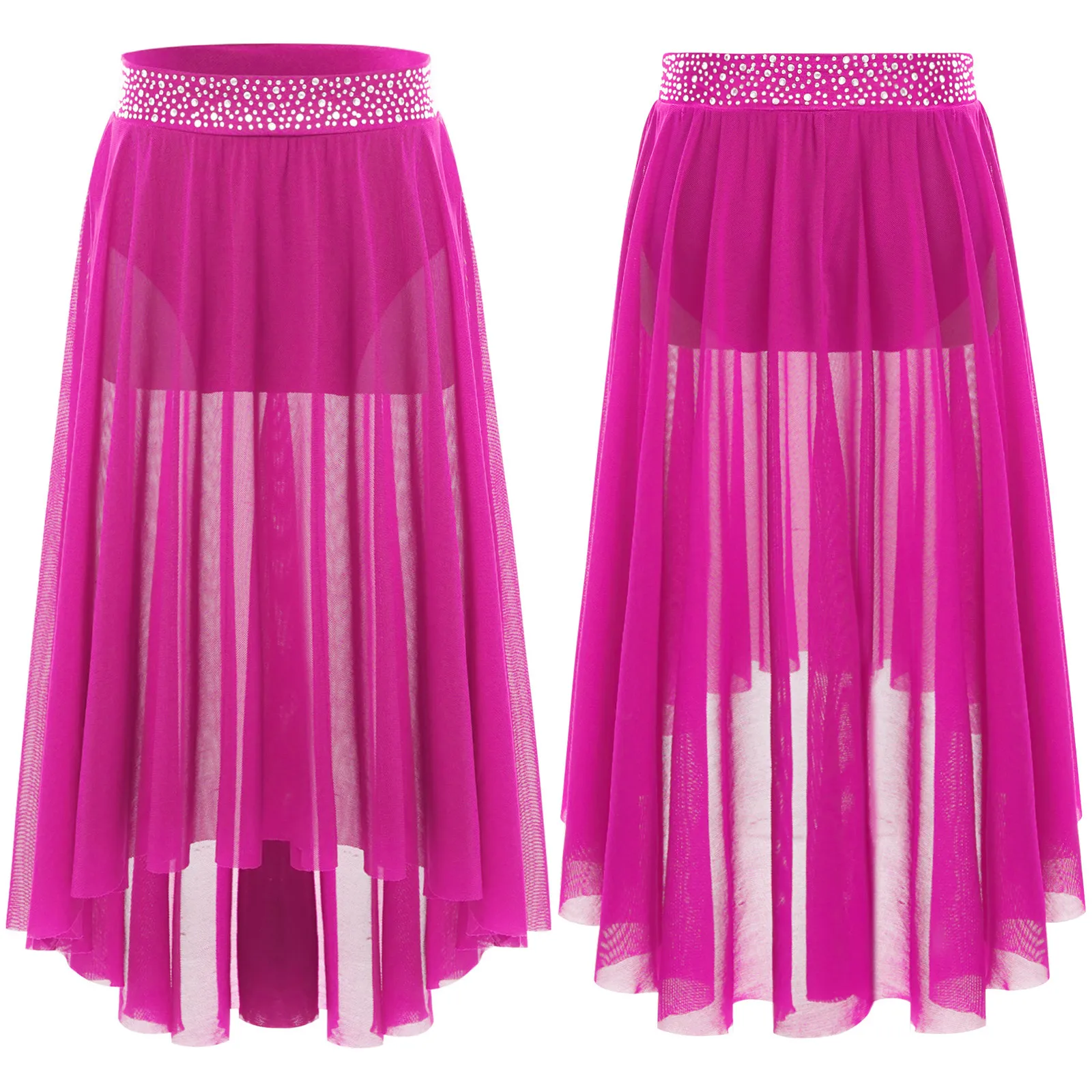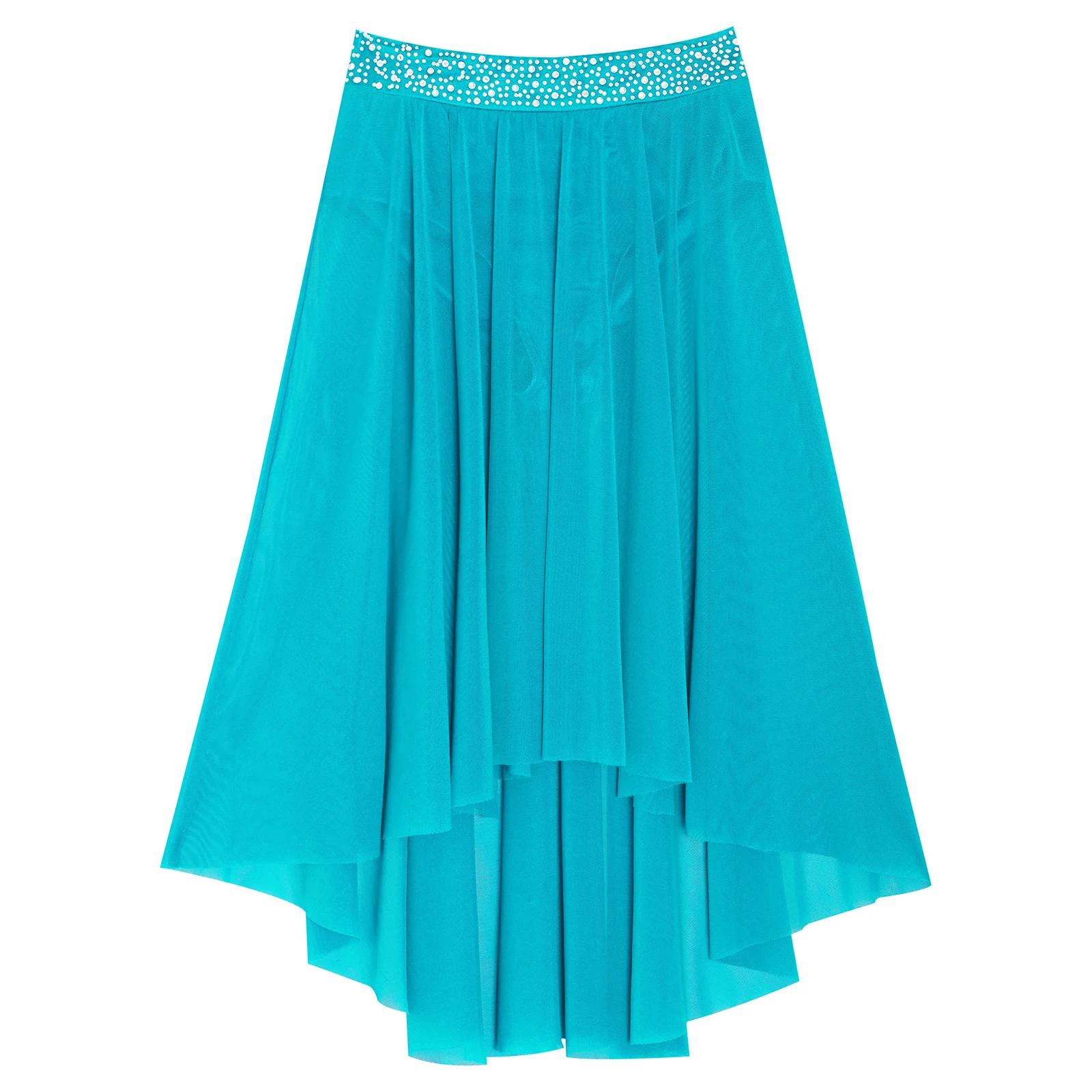 High-low irregular mesh skirt with side slit and flowy design shows the softness and beauty of dance.