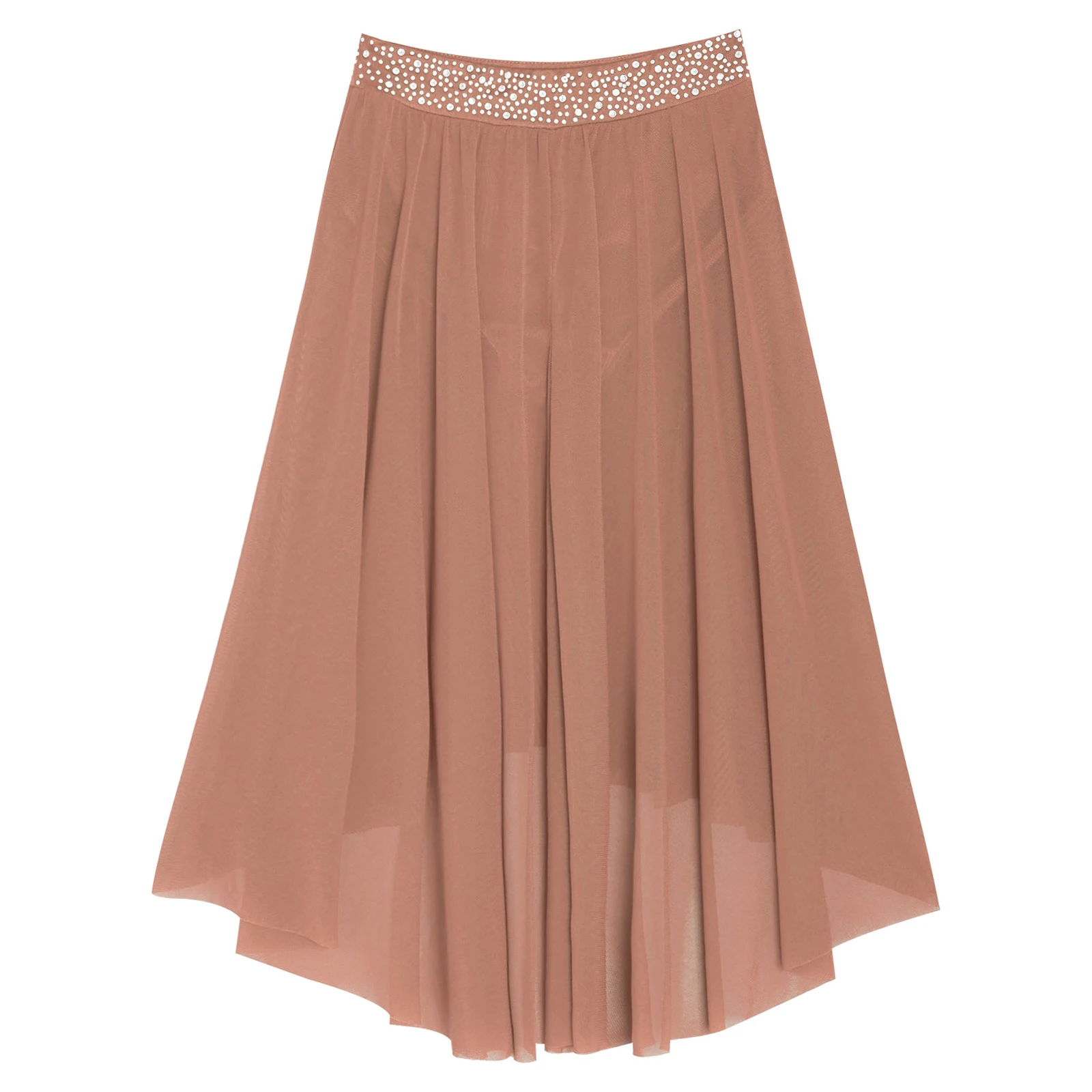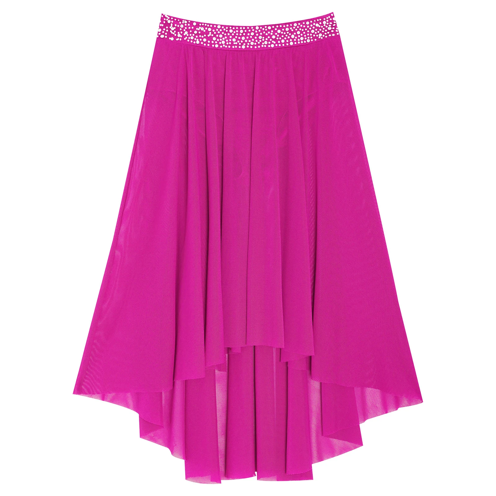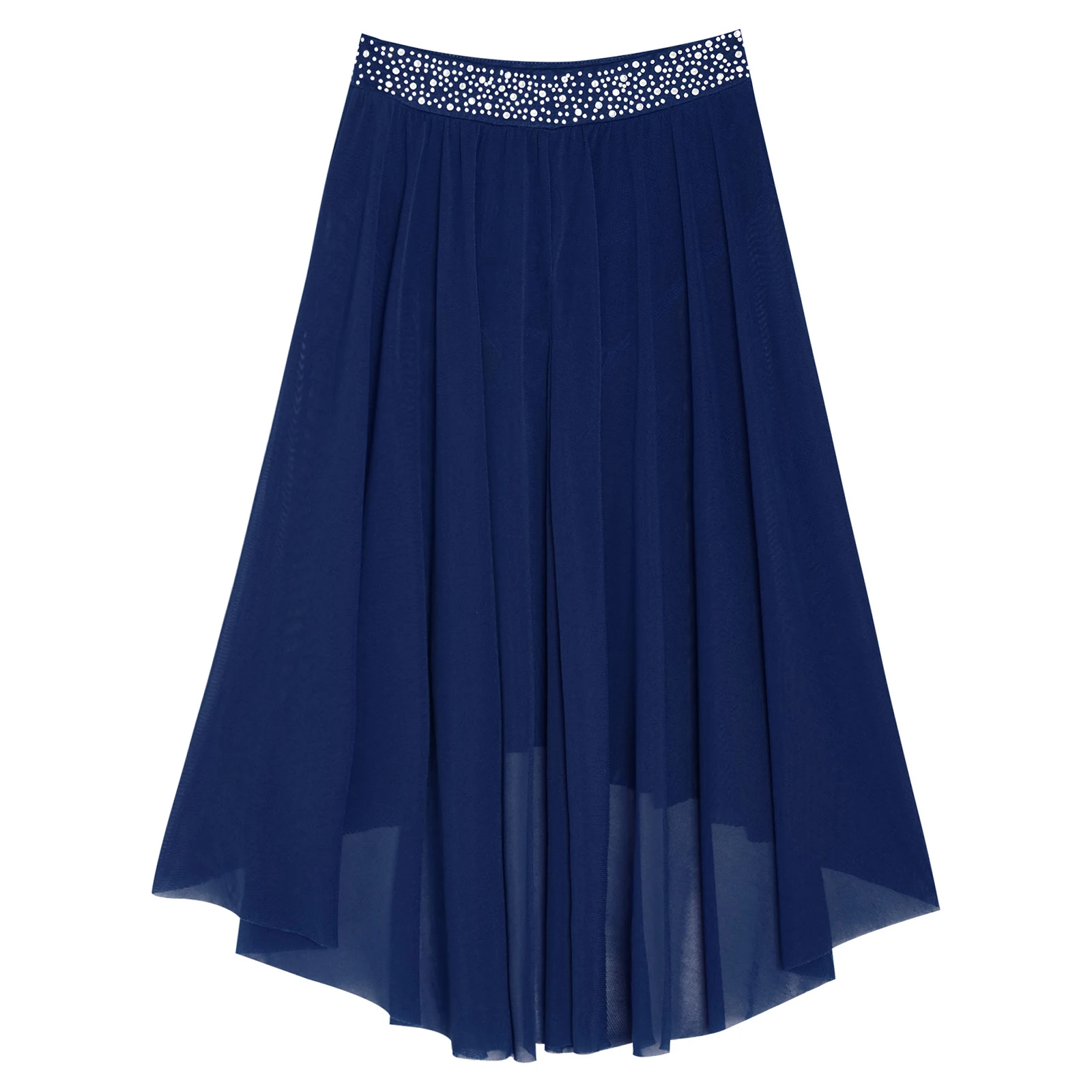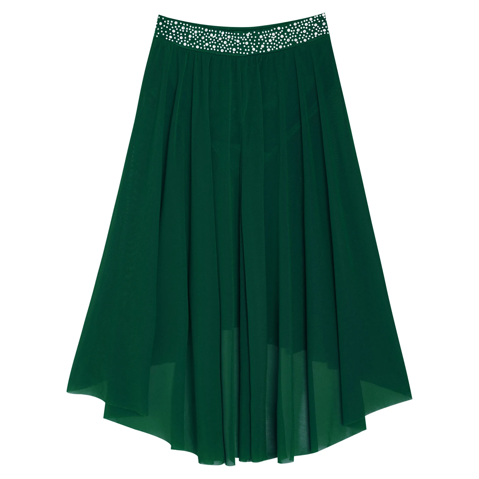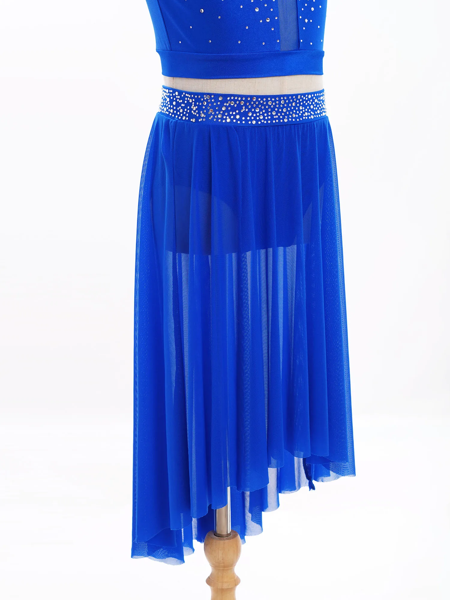 High-low irregular mesh skirt with side slit and flowy design shows the softness and beauty of dance.