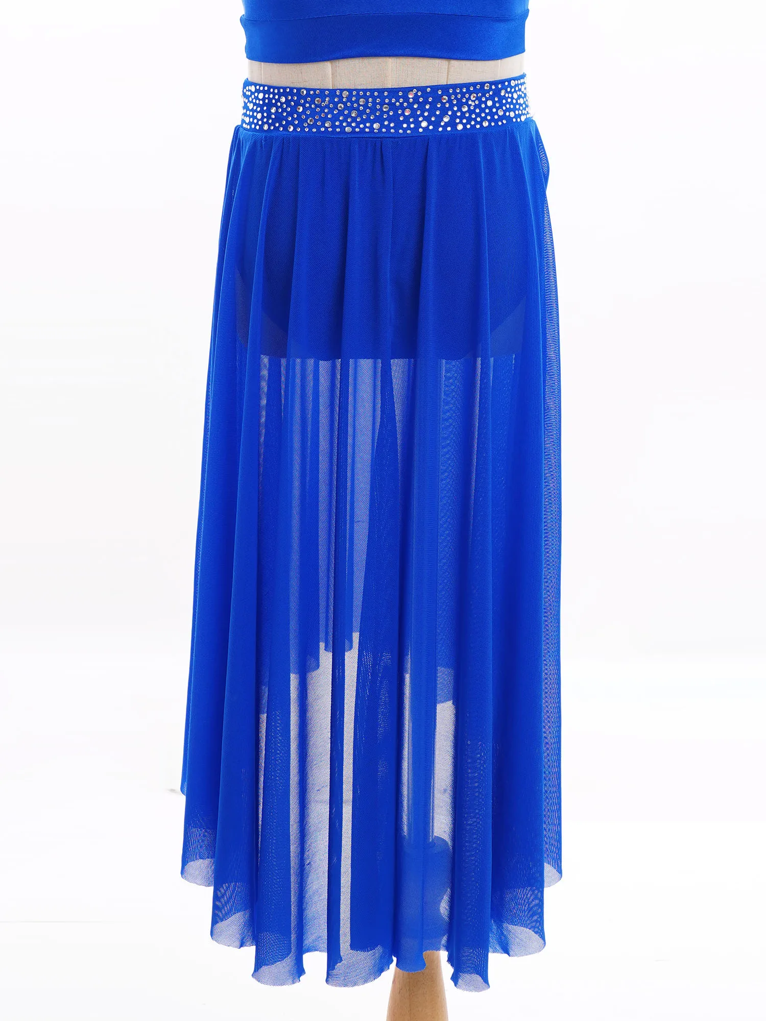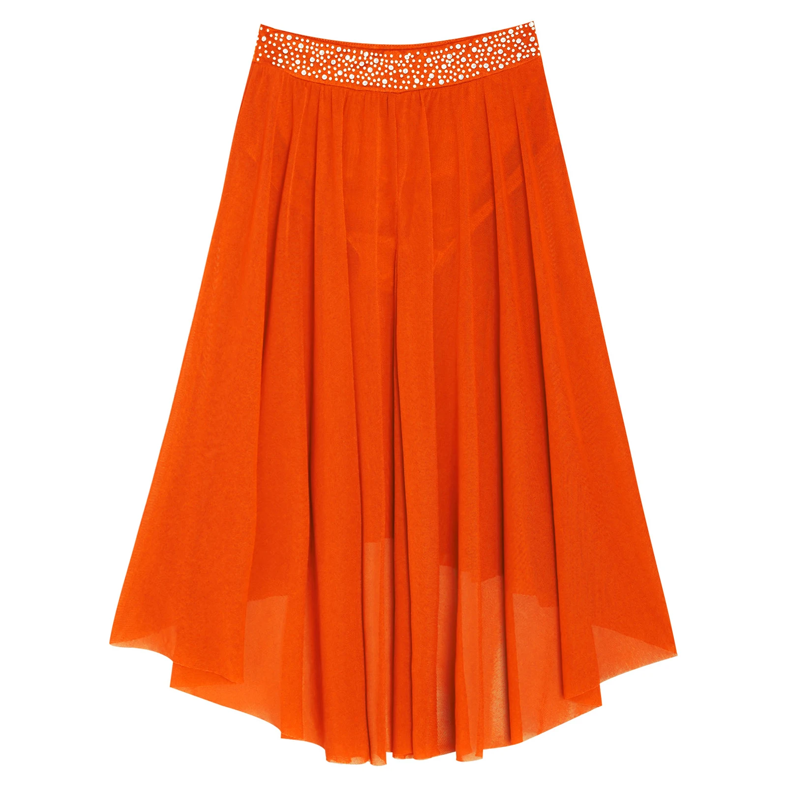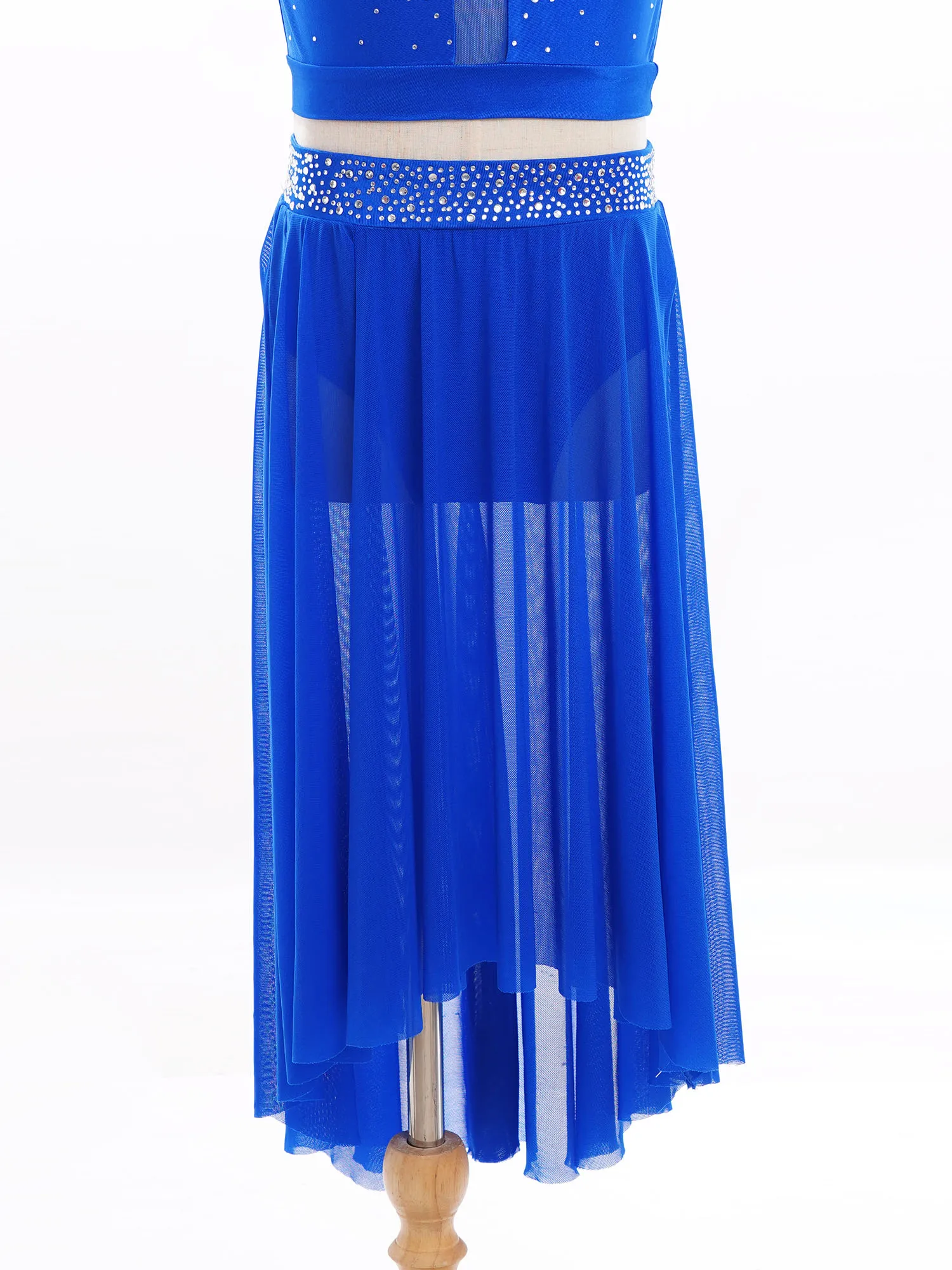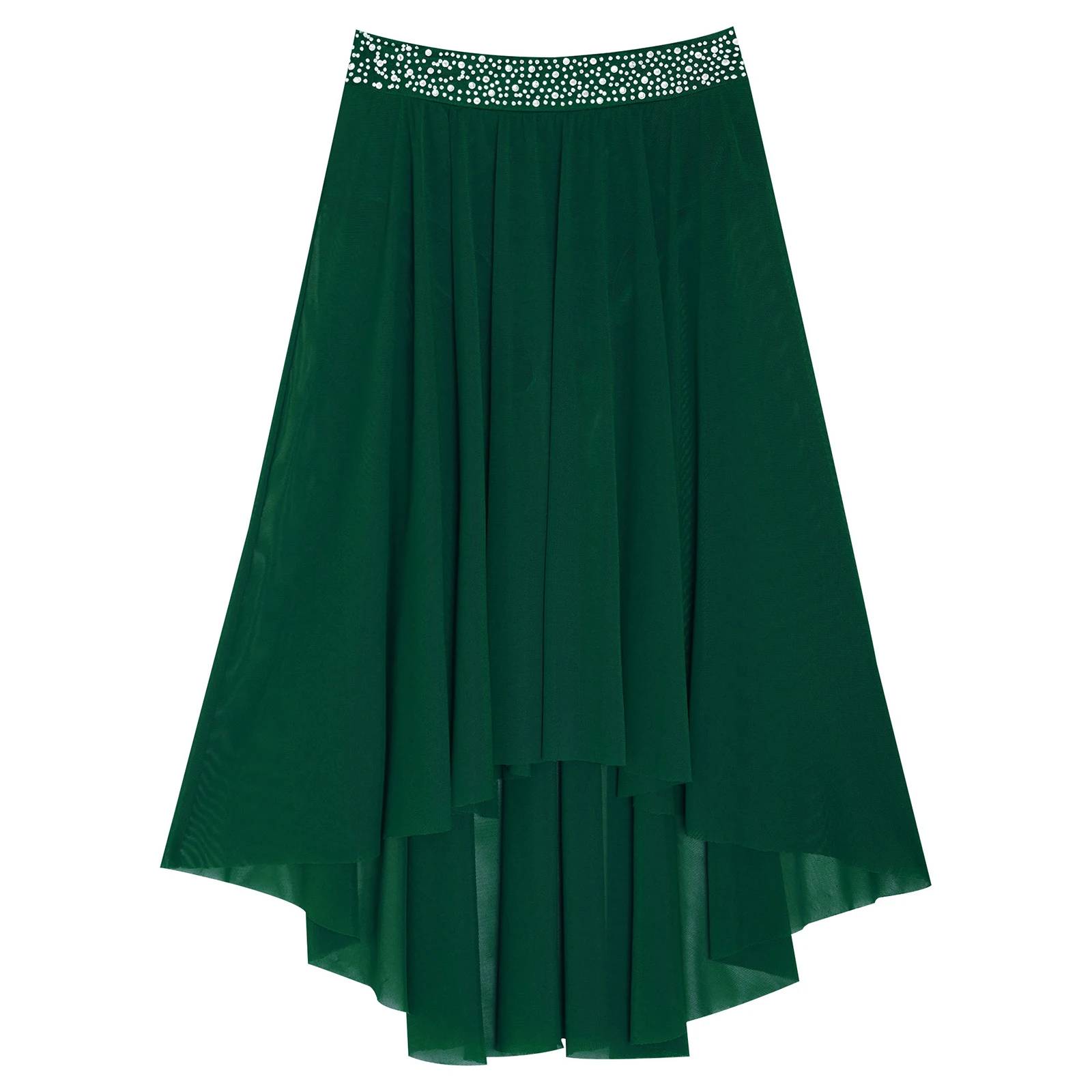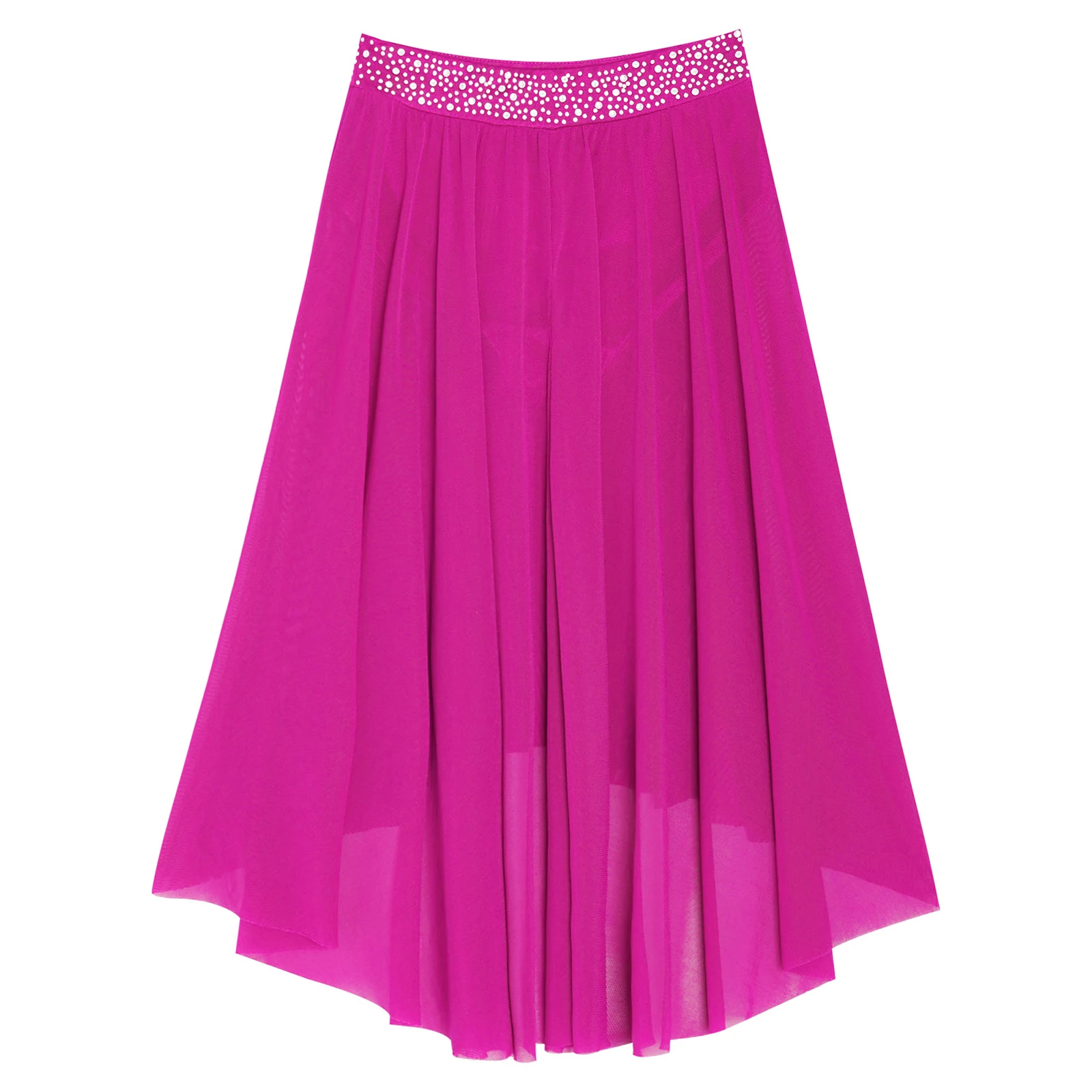 High-low irregular mesh skirt with side slit and flowy design shows the softness and beauty of dance.