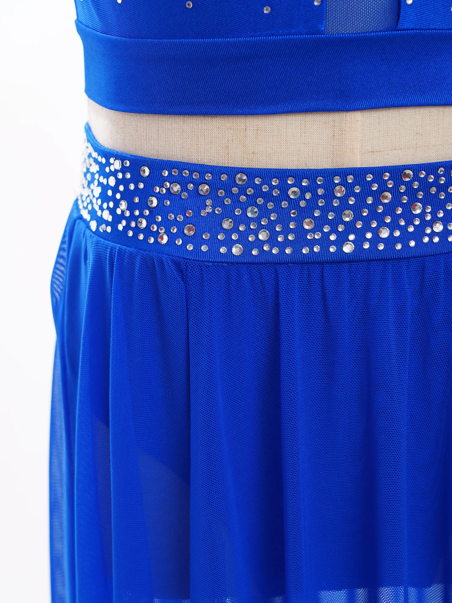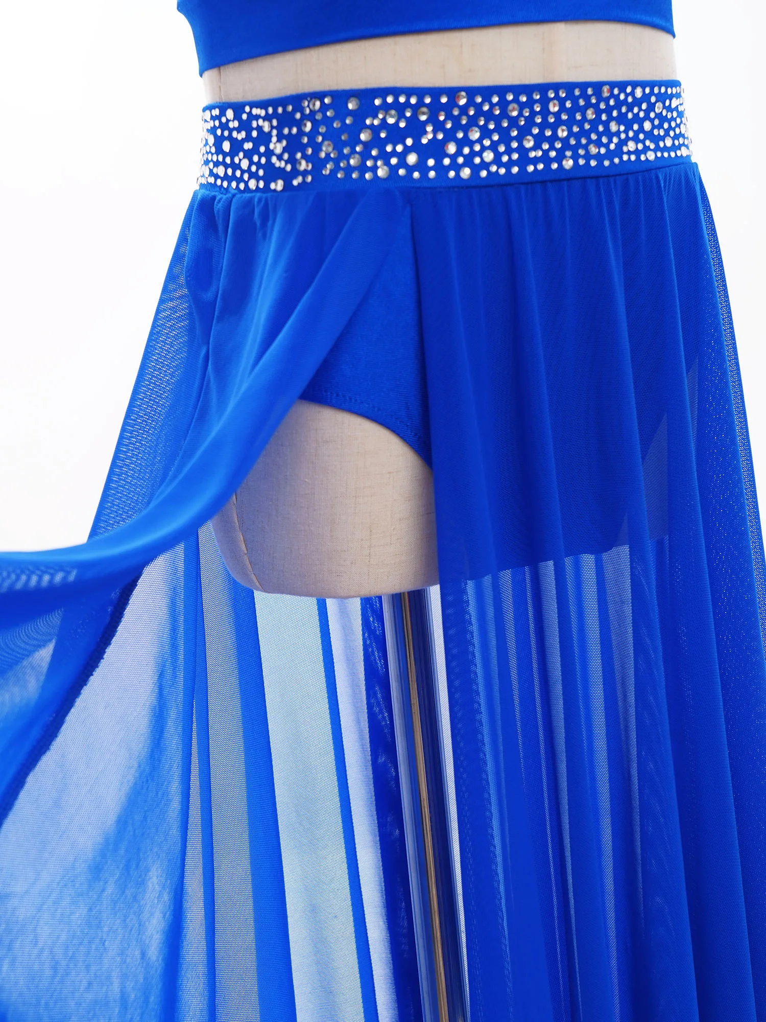 Girl’s skirt with rhinestones on the waistband sparkles under the light to brighten up any performance.