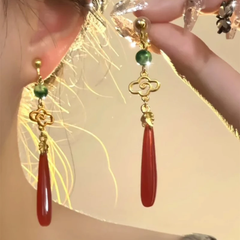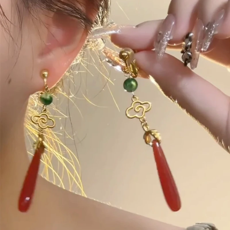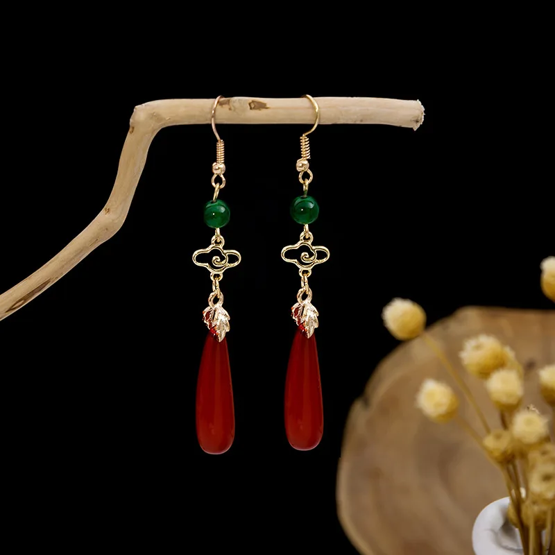 Chinese Style Fashion Auspicious Clouds Earrings for female ancient style long Delicate tassel Red water drop pendant ear Hook