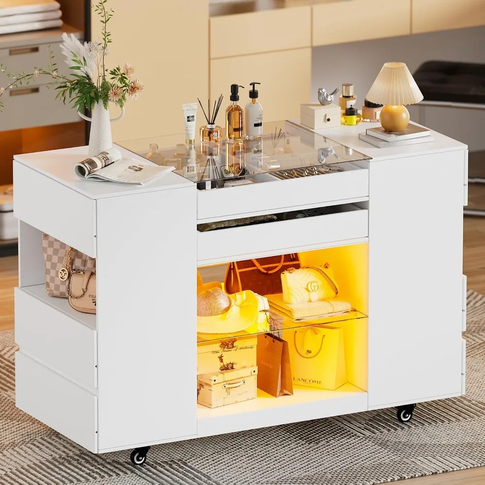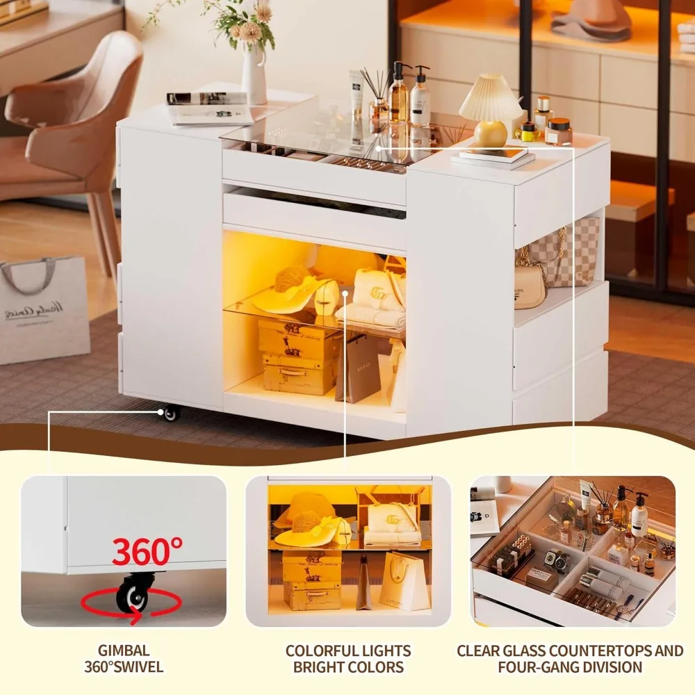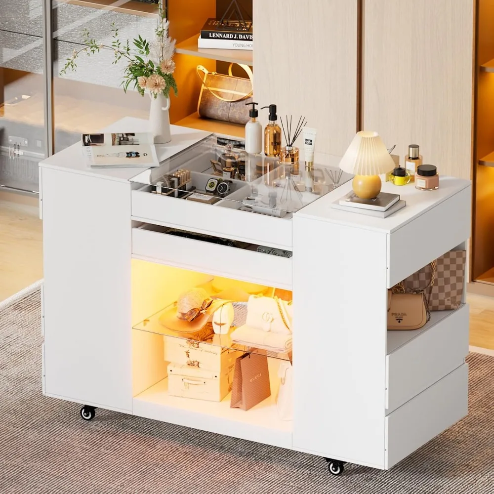 Closet Island with Drawers, Wardrobe Armoire Bedroom Island, Glass Armoire Bedroom Island with Glass Tabletop and LED Light