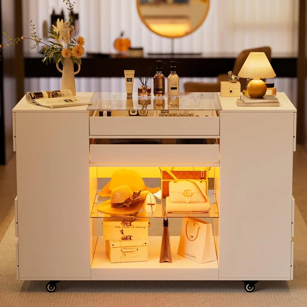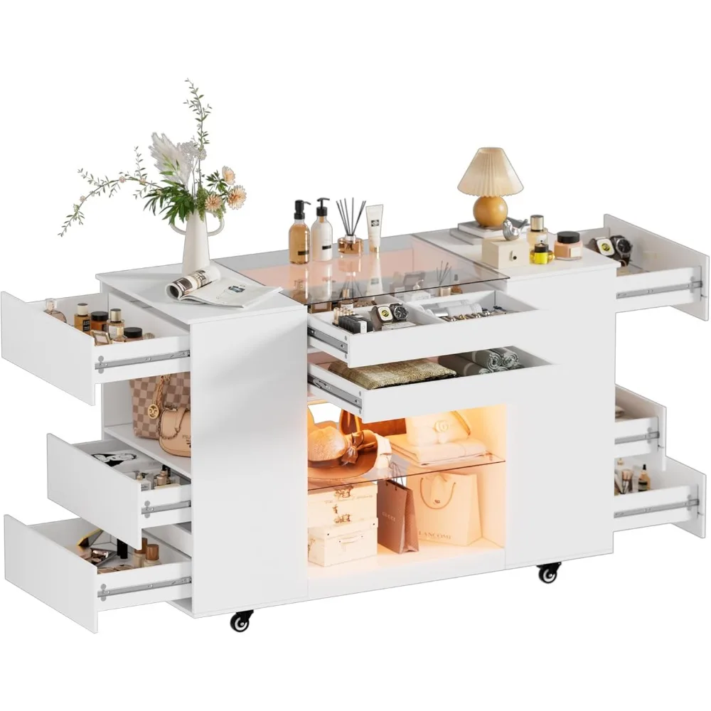 - 【Bedroom Island with Ample Storage Space】The bedroom island has 6 drawers, 2 top drawers, 3 open shelves and 1 spacious glass shelves, providing multiple options for storing and displaying items. Drawers of different sizes ensure that there is enough space for orderly storage, so that your bags, jewelry, and watches can also have their own private space.