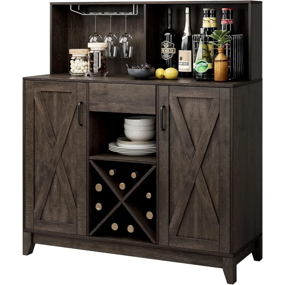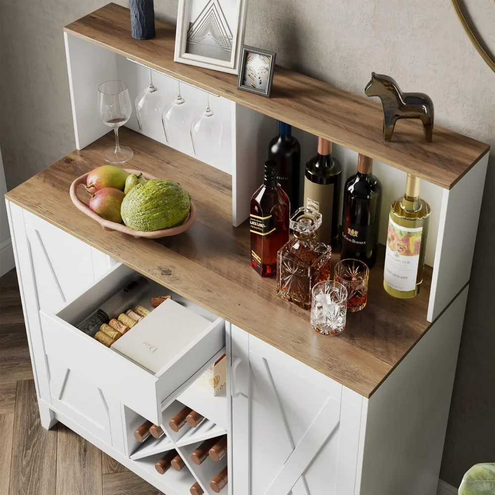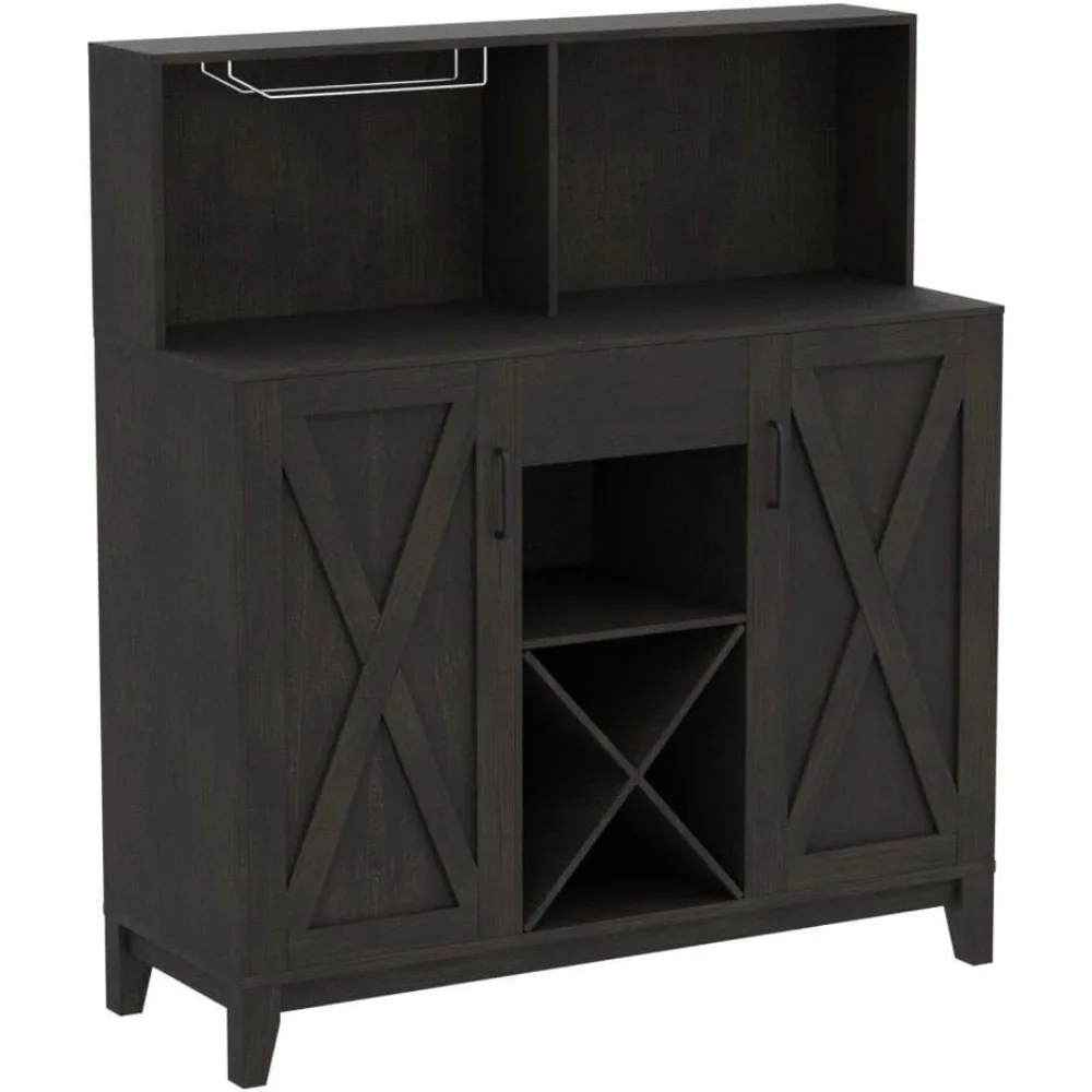 • 【AMPLE STORAGE】This trendy liquor cabinet can satisfy all your storage needs with both open and concealed space. A stemware rack allows you to hang glasses neatly for dry storage, the ample tabletop and X-shaped wine rack offers a perfect spot to store frequent bottles, while the middle drawer and barn door cabinets bring plentiful enclosed space for neat storage