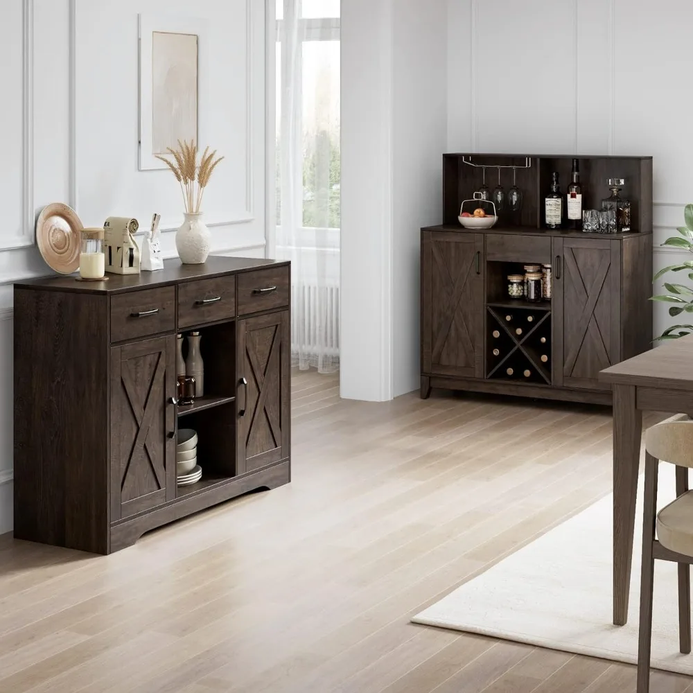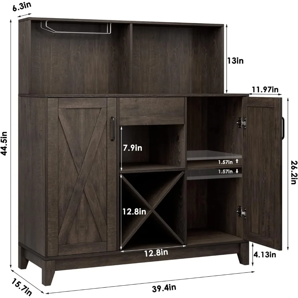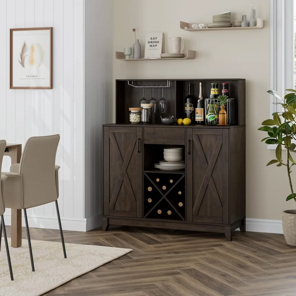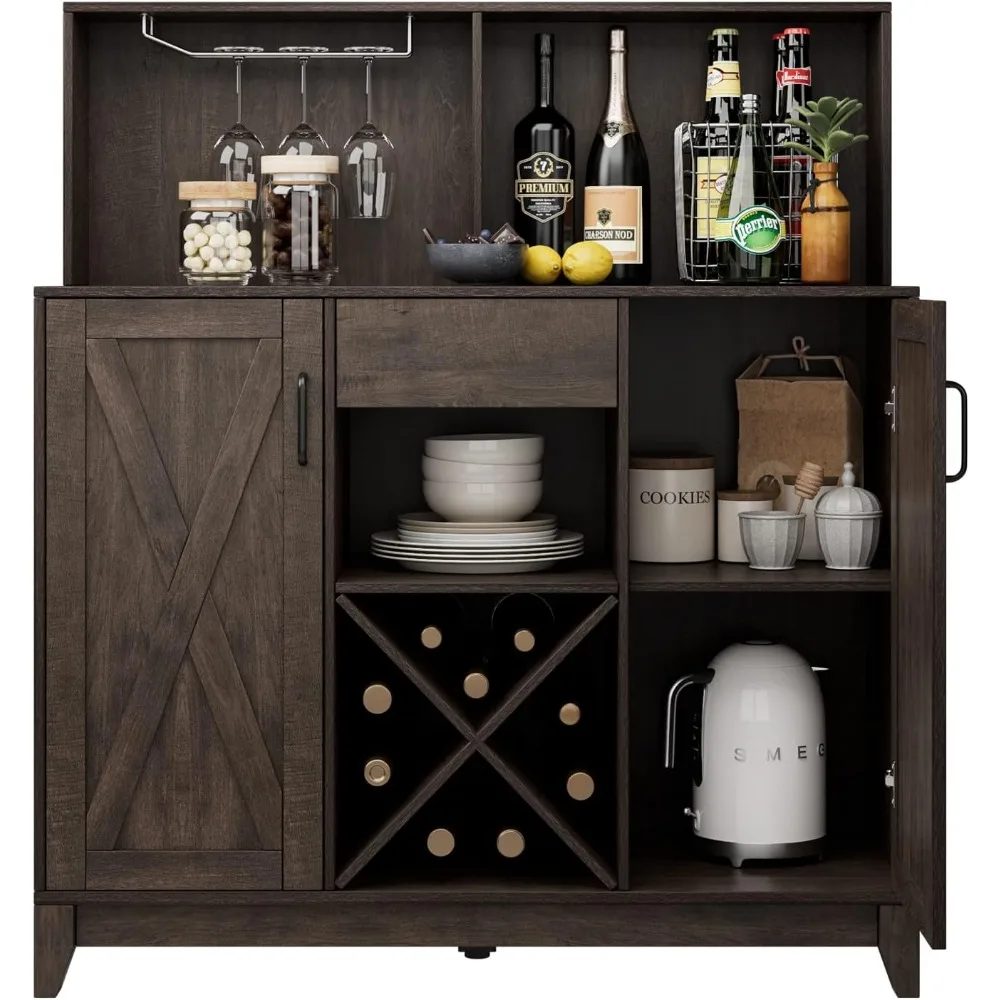 • 【AMPLE STORAGE】This trendy liquor cabinet can satisfy all your storage needs with both open and concealed space. A stemware rack allows you to hang glasses neatly for dry storage, the ample tabletop and X-shaped wine rack offers a perfect spot to store frequent bottles, while the middle drawer and barn door cabinets bring plentiful enclosed space for neat storage