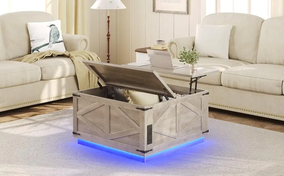 Coffee Table, Farmhouse Coffee Table with Storage, Square Wood Center Table with LED Light, Charging Station and Hidden Compartm