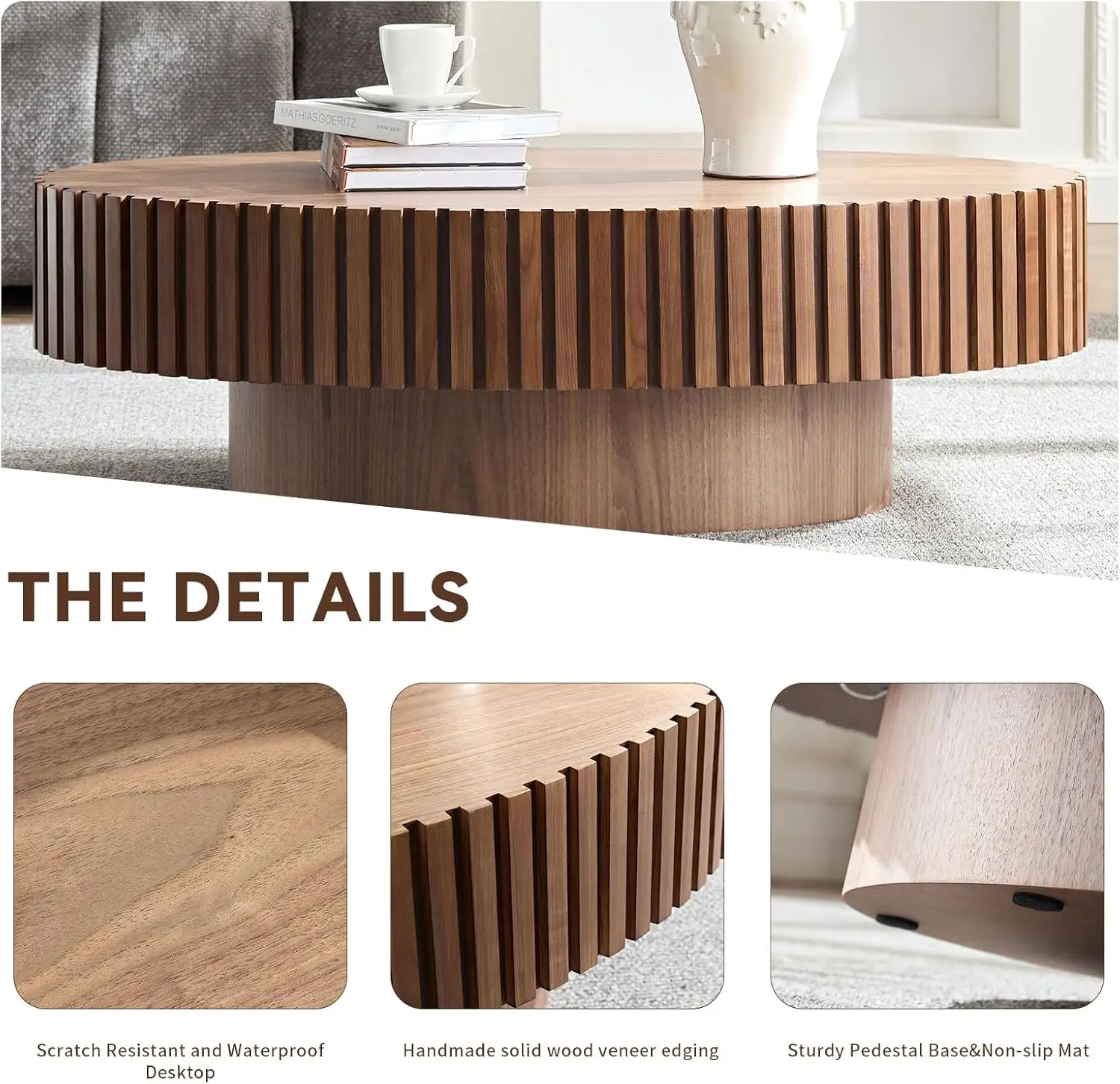 - [Material] This coffee table has a sturdy MDF base, providing reliable support and stability. And the reliefs around are all solid wood. Providing a sturdy structure while ensuring aesthetics.