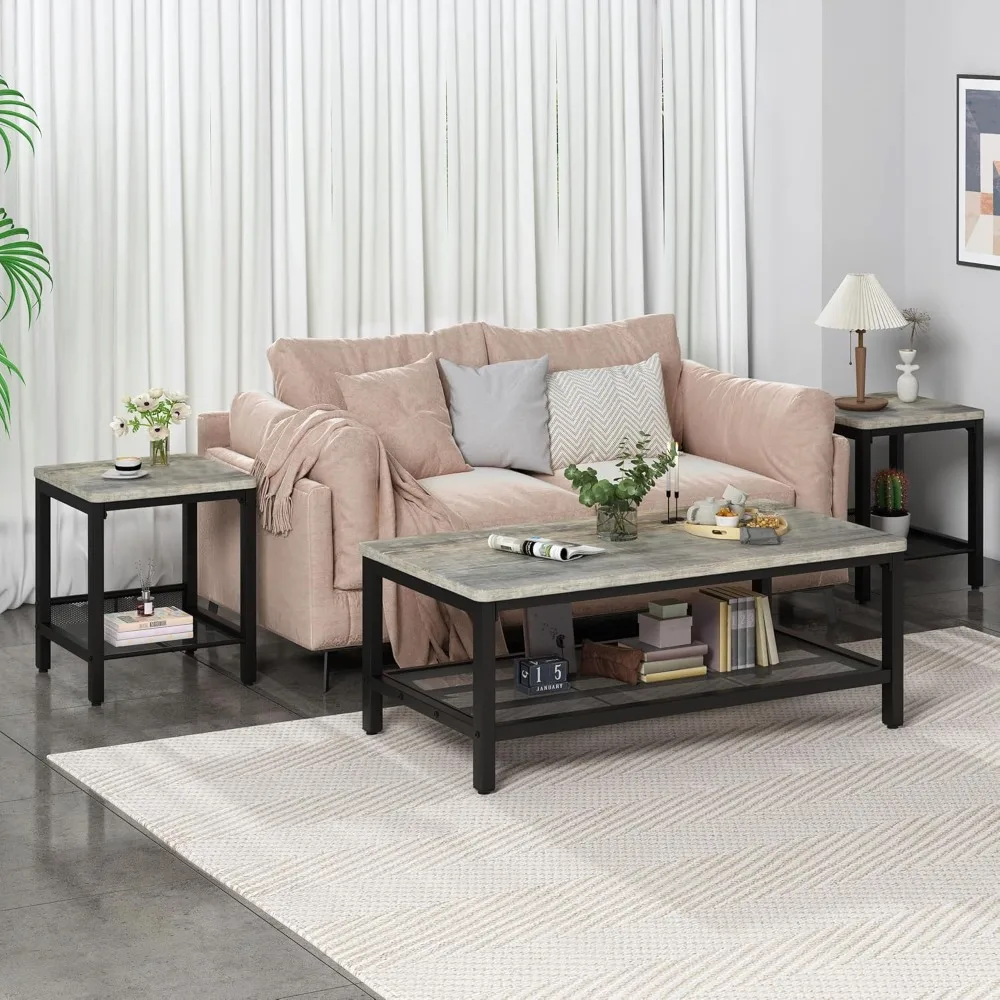 Coffee Table Set of 3, Industrial Coffee Table with 2 Square End Side Tables, Modern Living Room Table Set