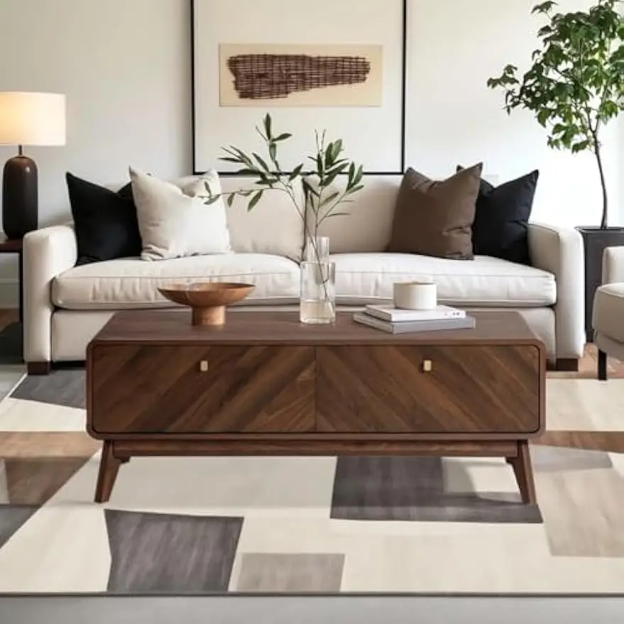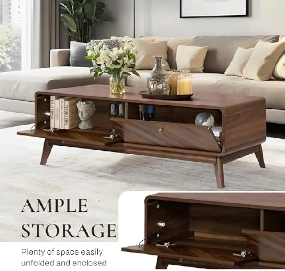 - Coffee Table with Storage: Designed with a striking pattern, this walnut mid century modern coffee table adds a contemporary touch to any space. The walnut finish enhances its timeless appeal, making it a perfect coffee table for home.