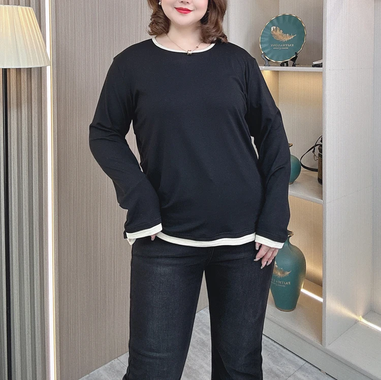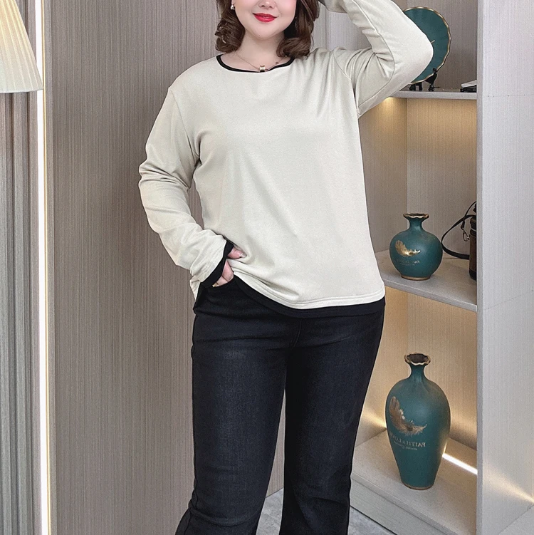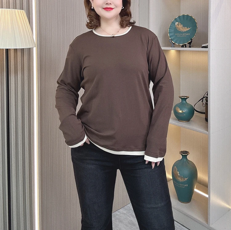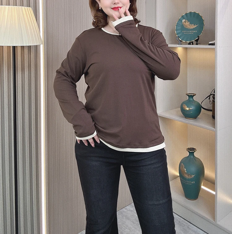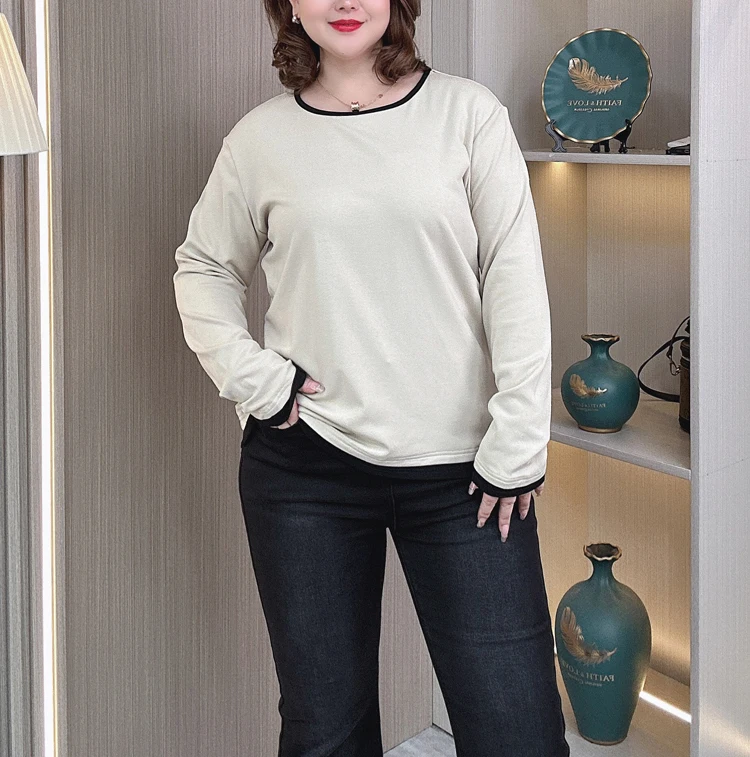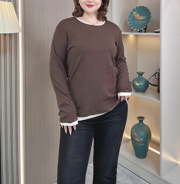 color contrast Fleece-lined T-Shirt women plus size Autumn winter loose round neck with long sleeve Tops 2408