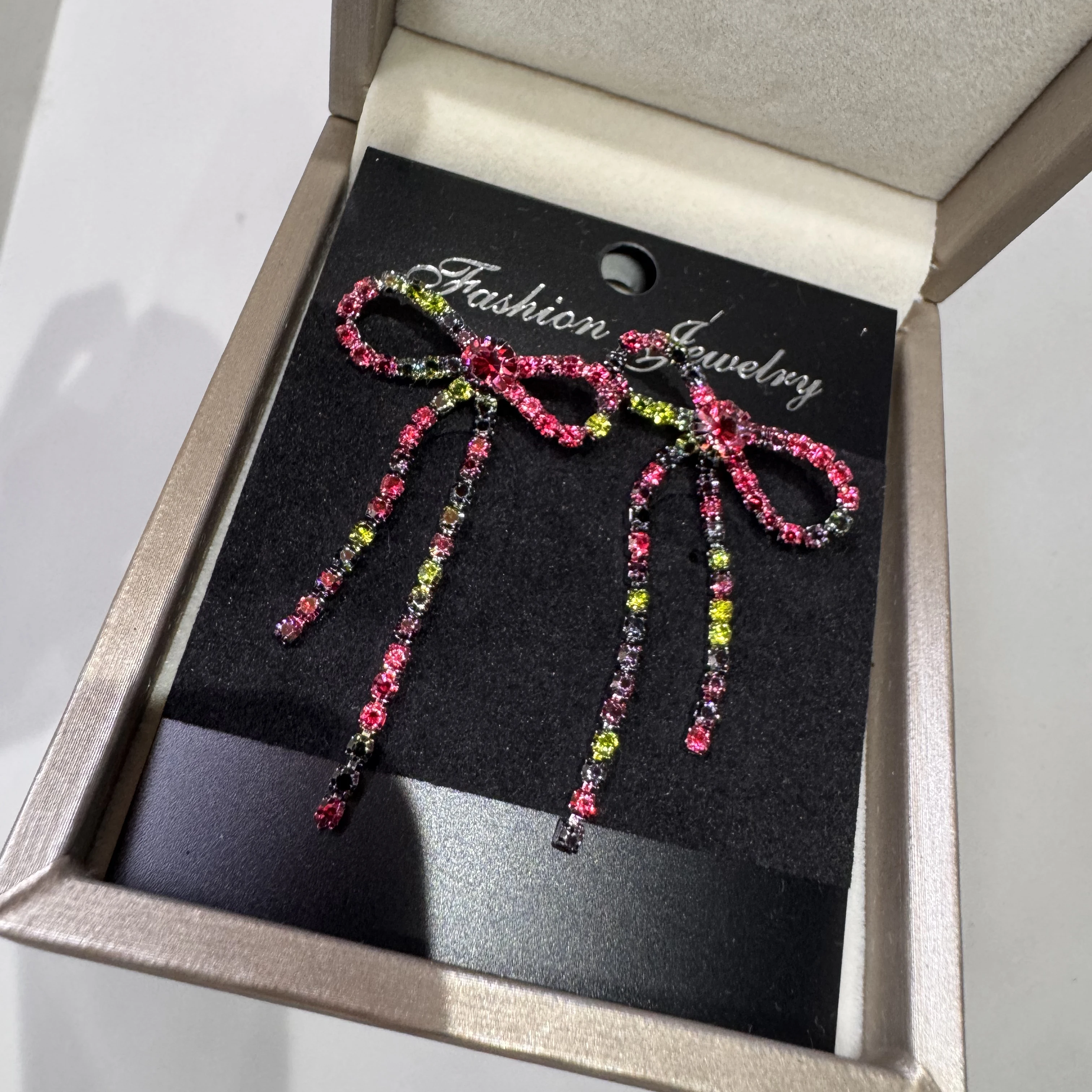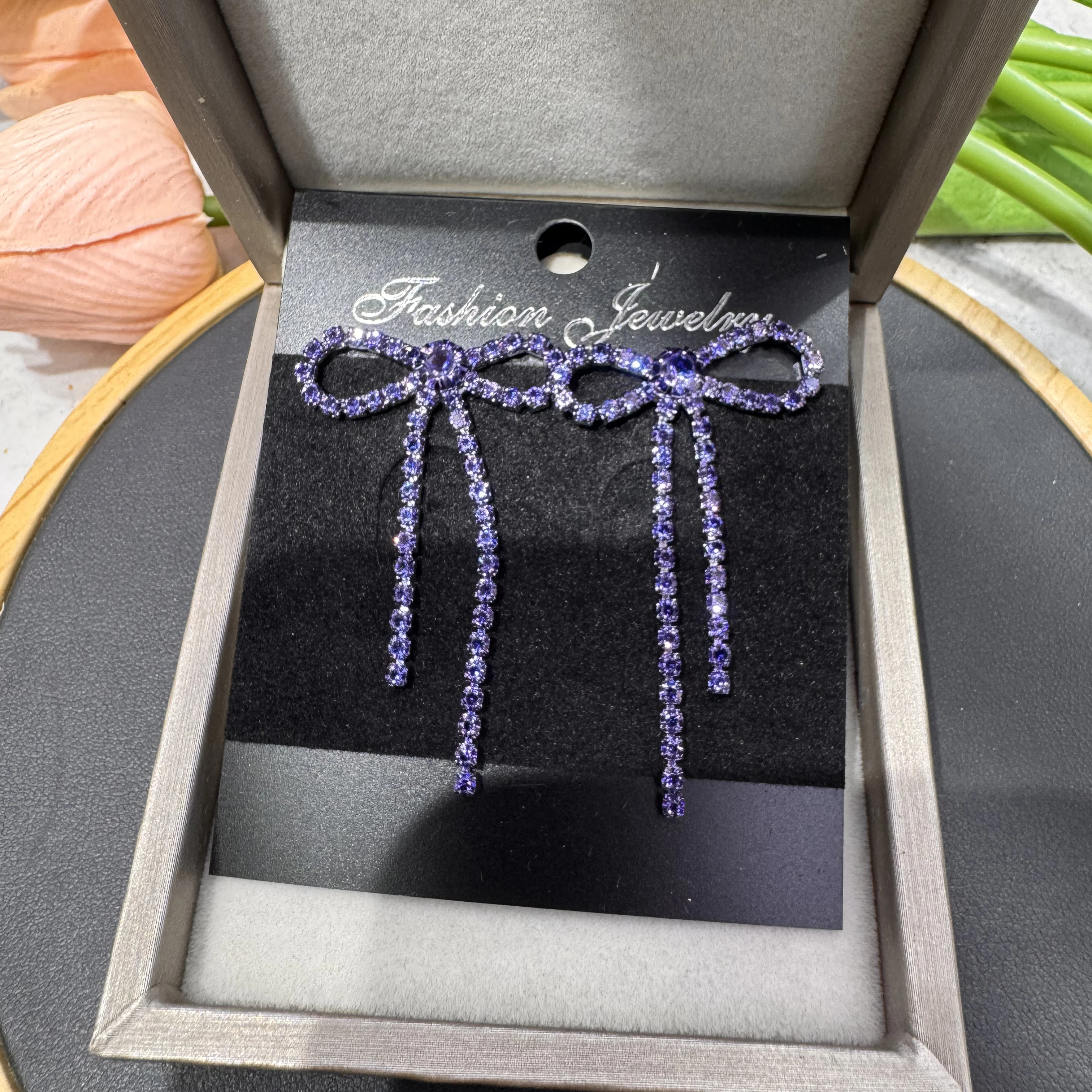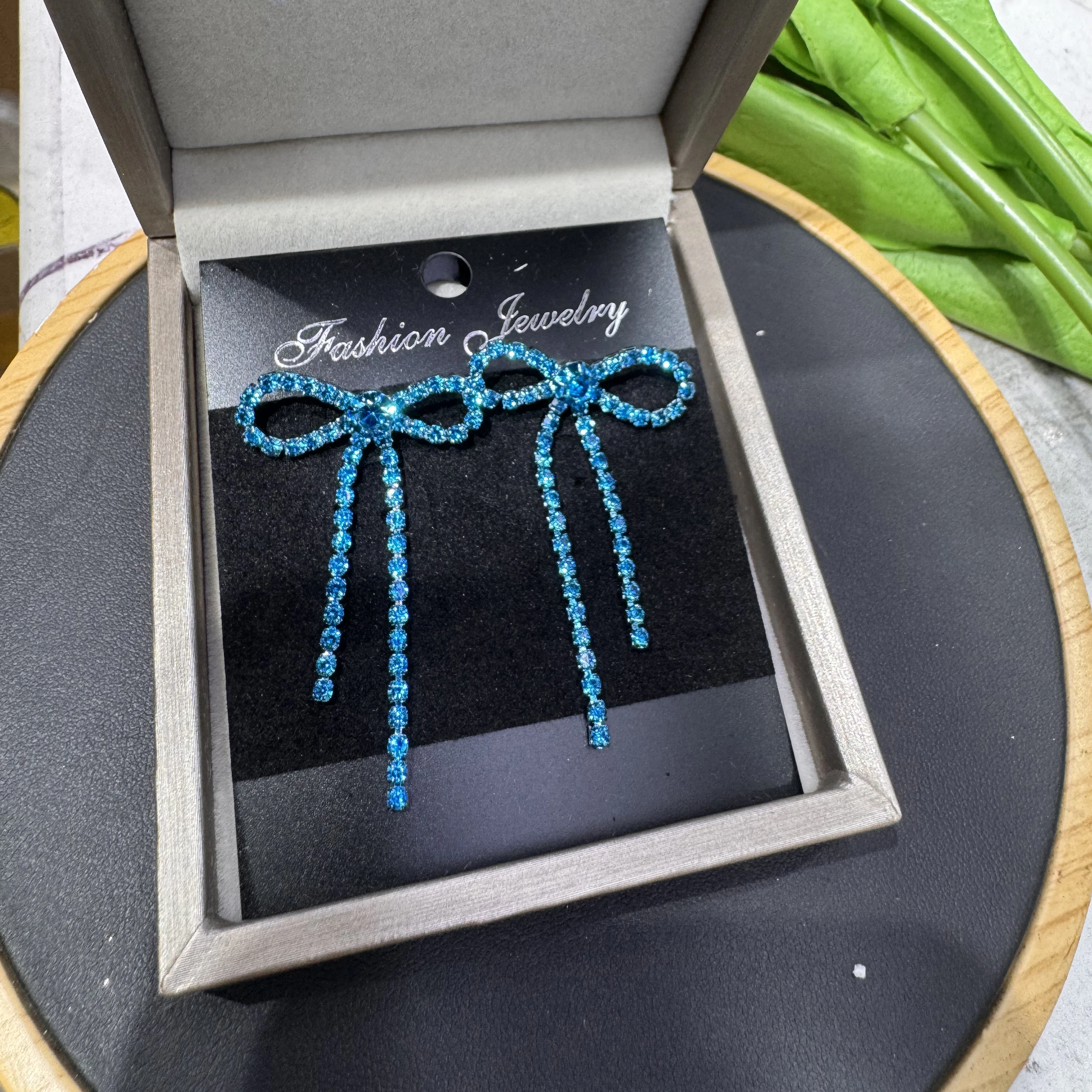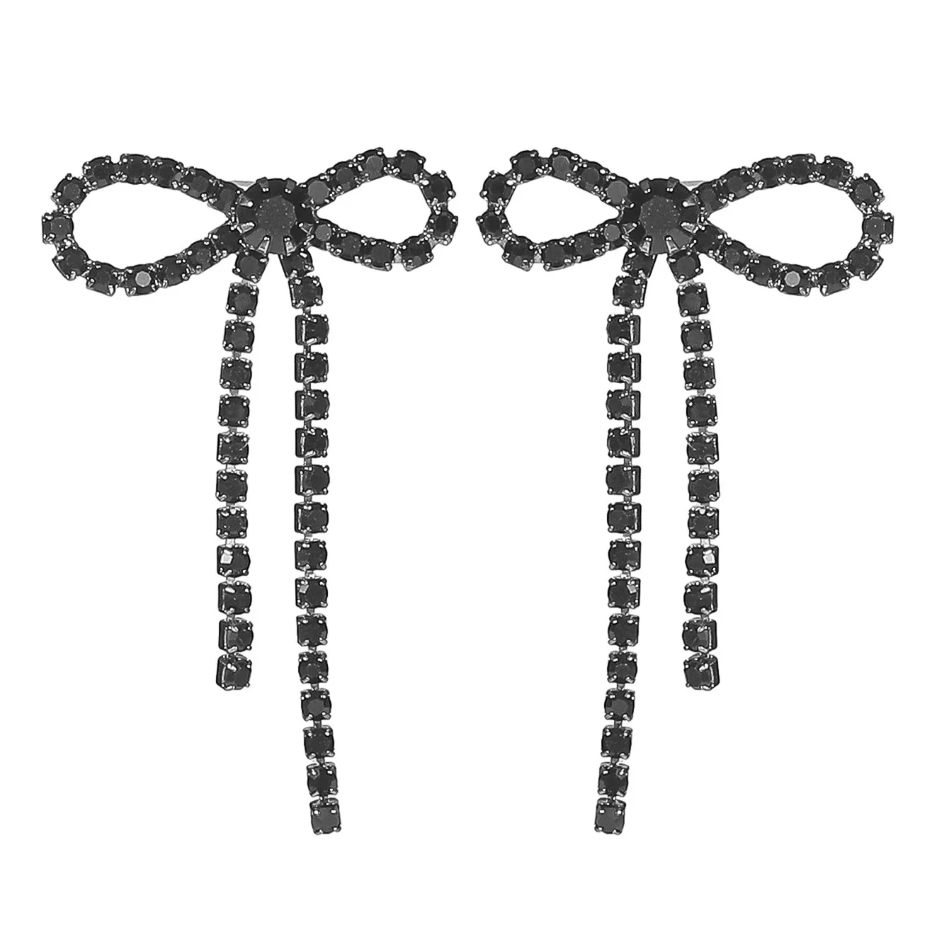 colourful Bow Earrings for Women Rhinestone Long Tassel Earrings Black Stainless Steel Dangle Earrings Cute Sparkly Jewelry